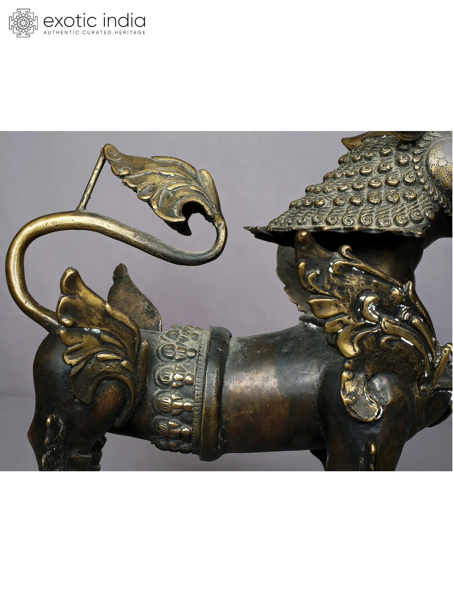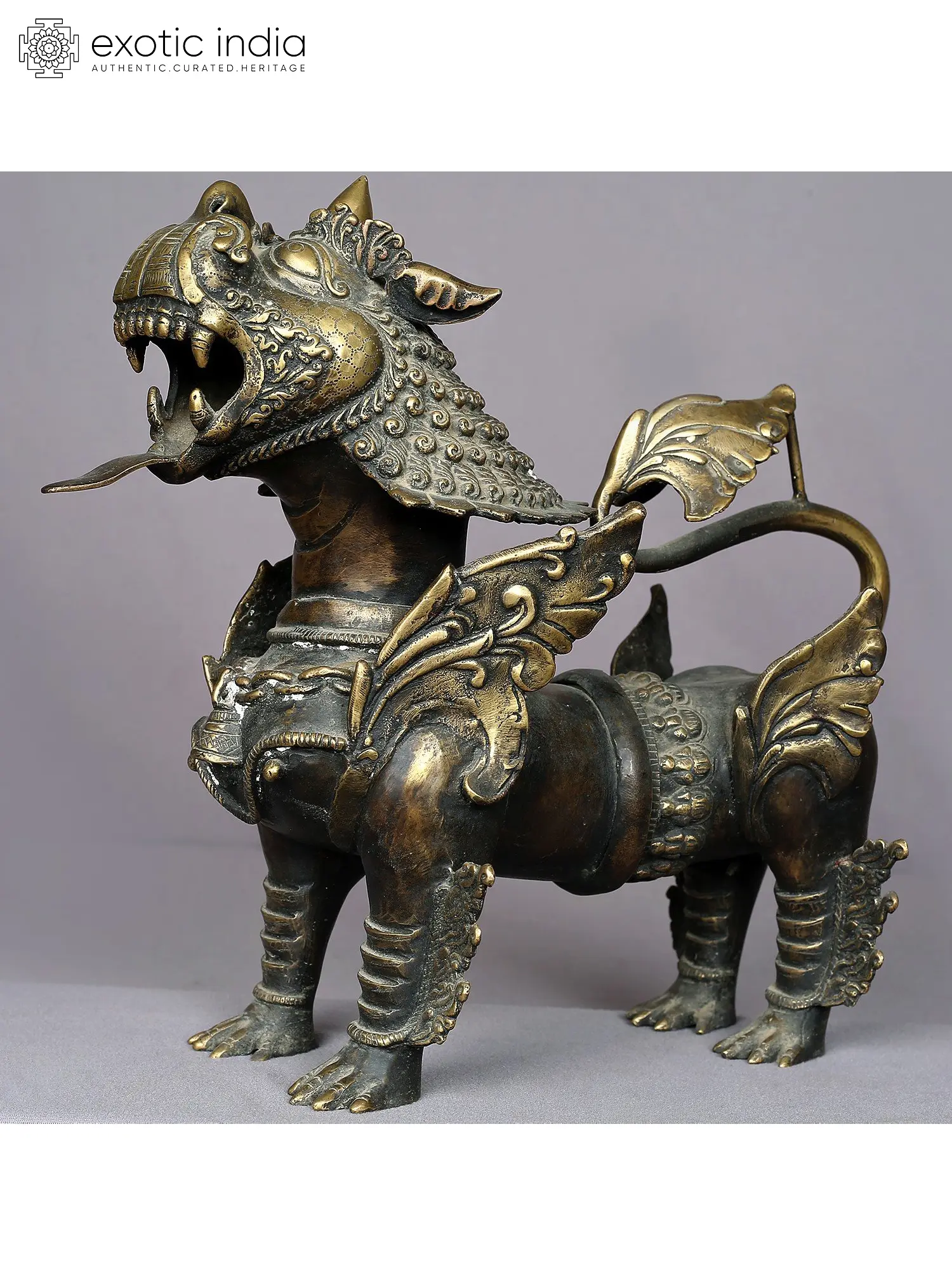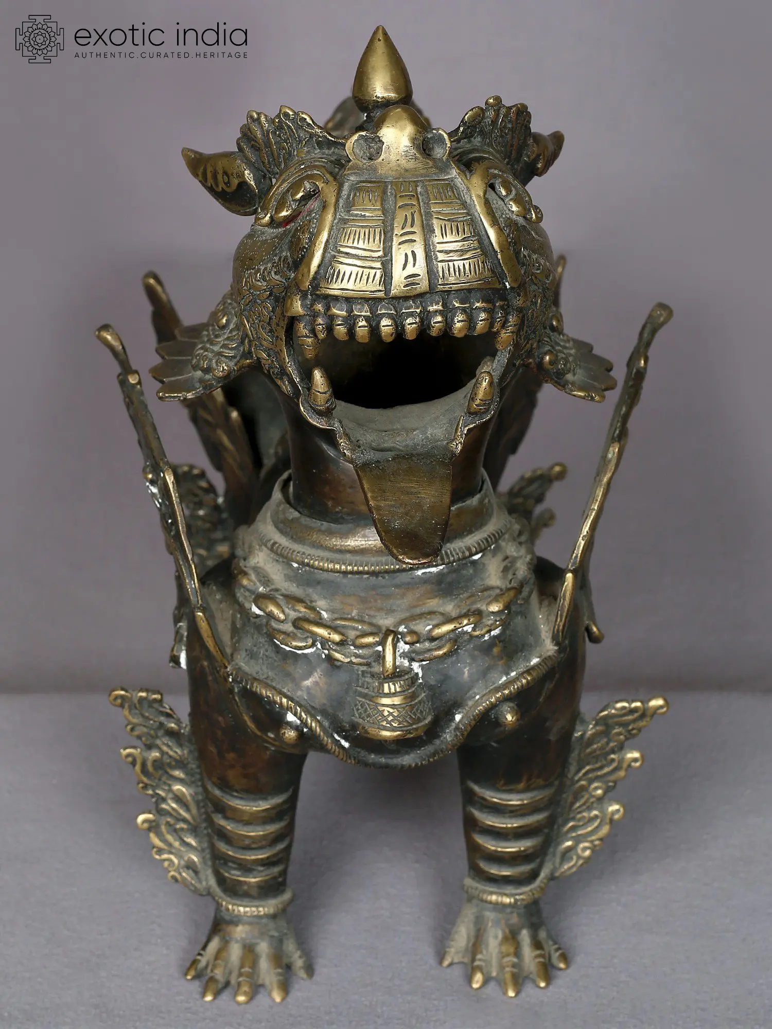 Originating from Tibet in the sixteenth century, the snow lion motif holds significance in Nepalese art, symbolizing power and divinity. Uncommonly well-modeled, this lion exhibits elaborate manes, a gaping mouth, and a protruding tongue. Often employed as support in throne renderings, the snow lion, with its unique characteristics, adds a touch of regality to sacred spaces. This Brass Snow Lion with patina tint remains highly decorative, showcasing the finest craftsmanship and standing as a testament to the cultural and artistic heritage of Nepal.