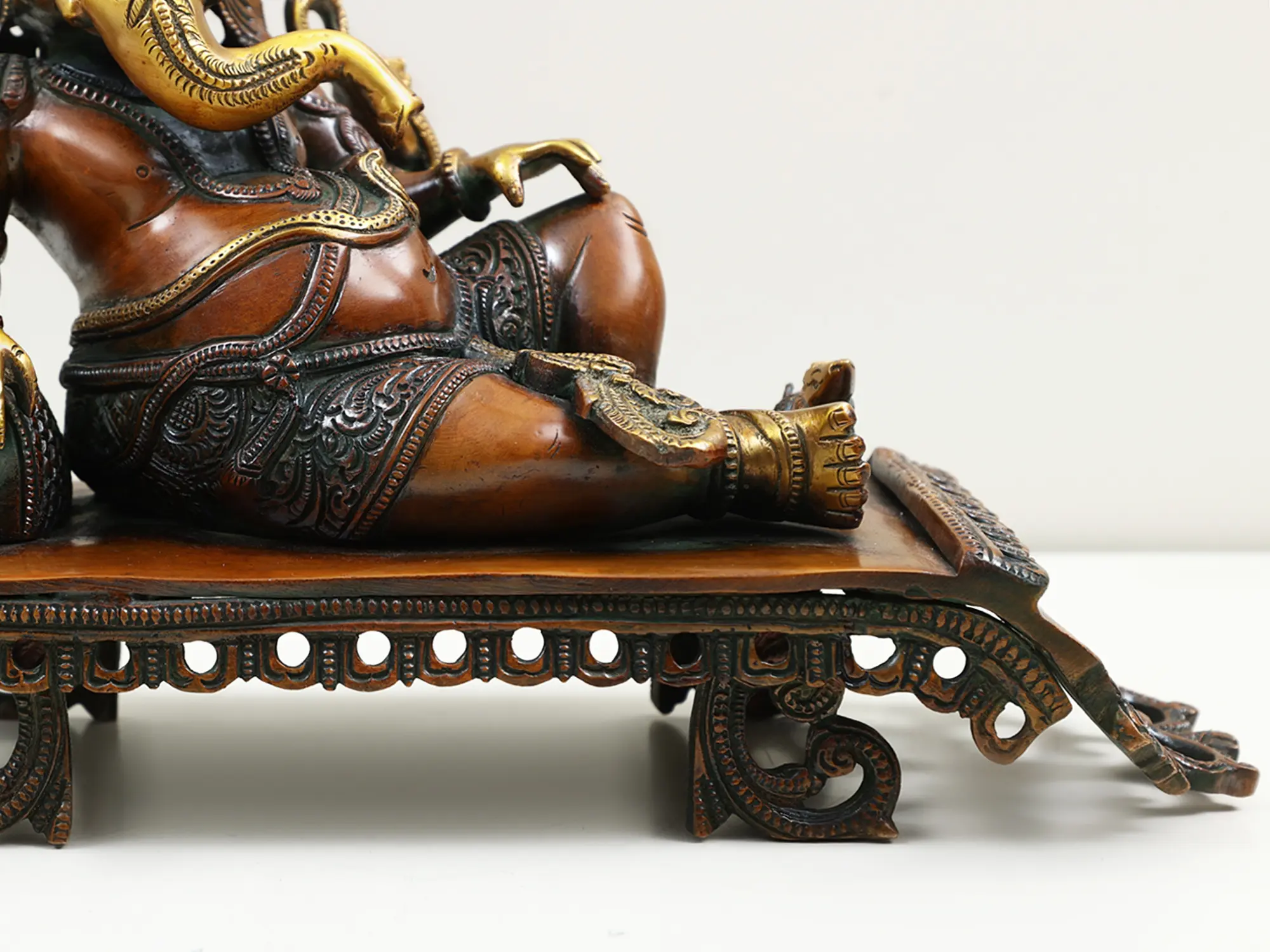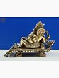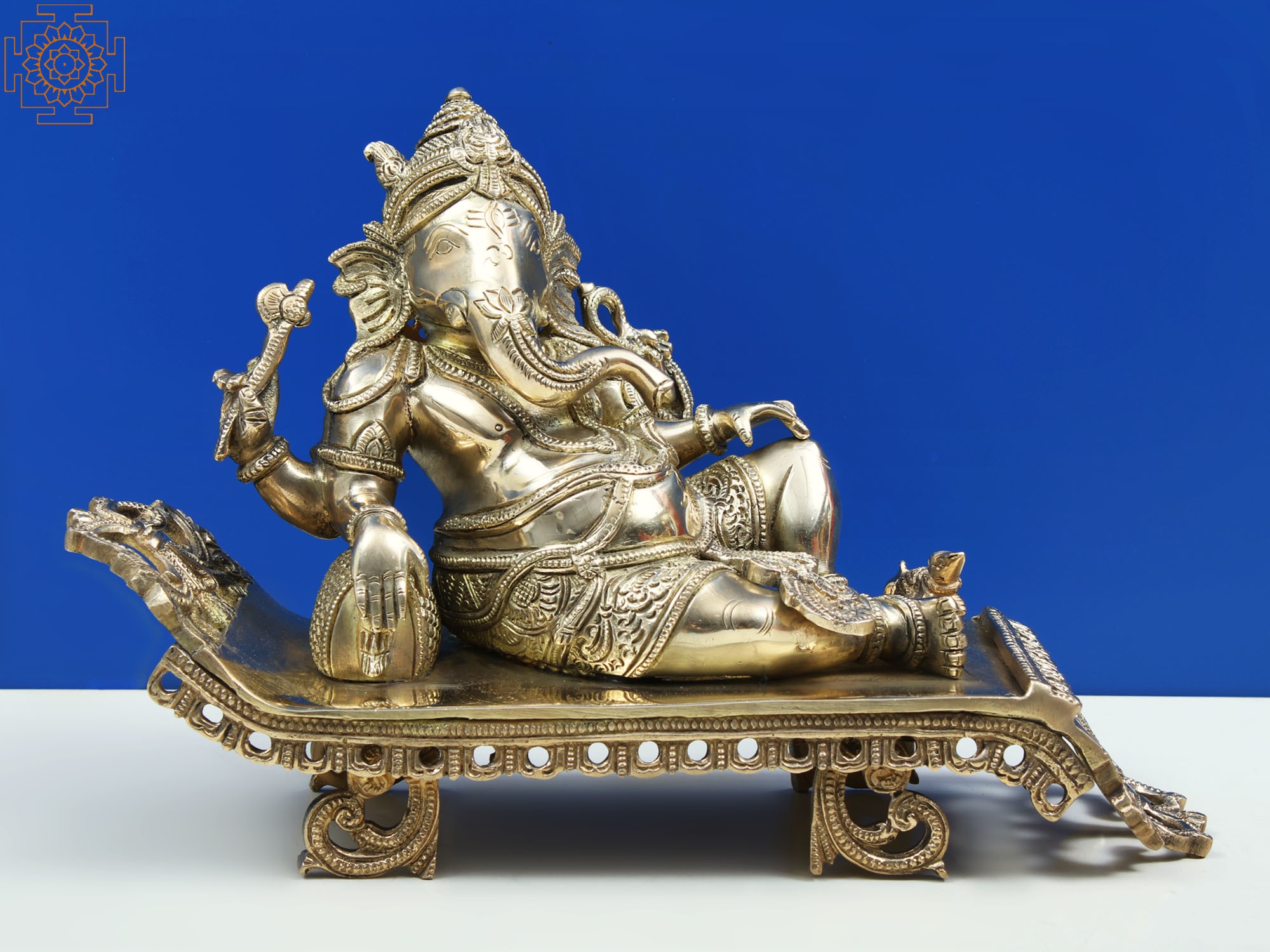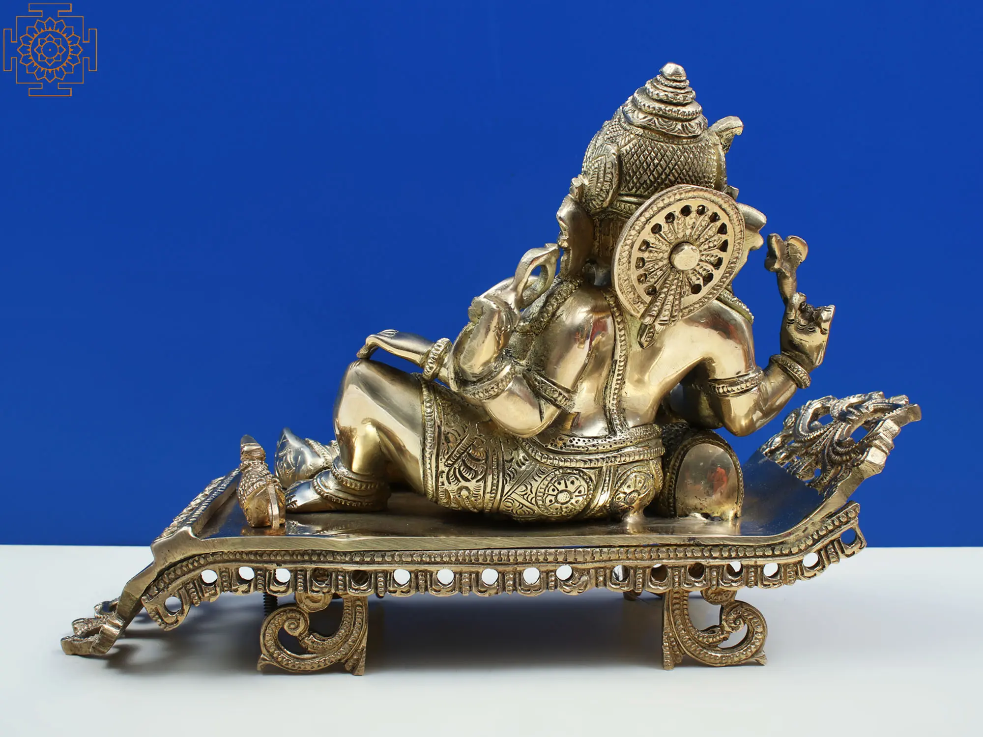 Invite an aura of peace, prosperity, and wisdom into your home or workspace with this exquisite brass statue of Lord Ganesha. This magnificent depiction captures the elephant-headed deity in a relaxed, reclining posture, a rare and charming representation that speaks to his approachable nature. Crafted from high-quality brass, this statue boasts a rich patina that highlights the intricate detailing of its design, making it a truly captivating piece of art. The artistry of this statue is evident in every curve and contour. Lord Ganesha, revered as the remover of obstacles and the god of beginnings, is depicted with his characteristic large belly, symbolizing contentment and abundance, and his beloved mouse (mooshika) often seen as his mount, representing the subdual of ego and the ability to overcome any challenge. The serene expression on his face, coupled with his languid pose, invites contemplation and a sense of tranquility. The ornate detailing on his crown, jewelry, and the garment adorning his waist further enhances the statue's aesthetic appeal, showcasing the skill of the artisans.
