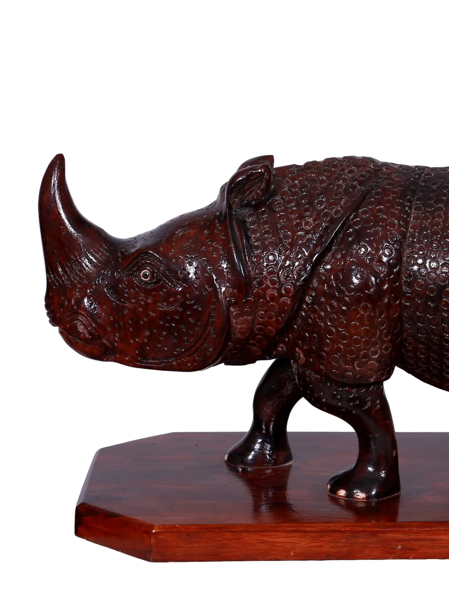 Discover the raw power and enduring spirit captured in this exquisitely carved wooden rhinoceros statue. Standing as a testament to the artistry of skilled craftspeople, this piece embodies the formidable presence and unyielding nature of one of Earth's most magnificent creatures. The rich, deep tone of the wood, polished to a lustrous sheen, highlights every meticulously rendered detail, from the textured, armor-like hide to the powerful curve of the horn. This is more than just a decorative item; it is a symbol of strength, protection, and steadfastness.