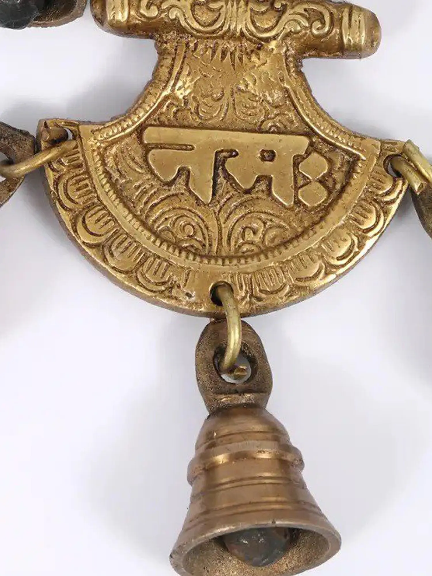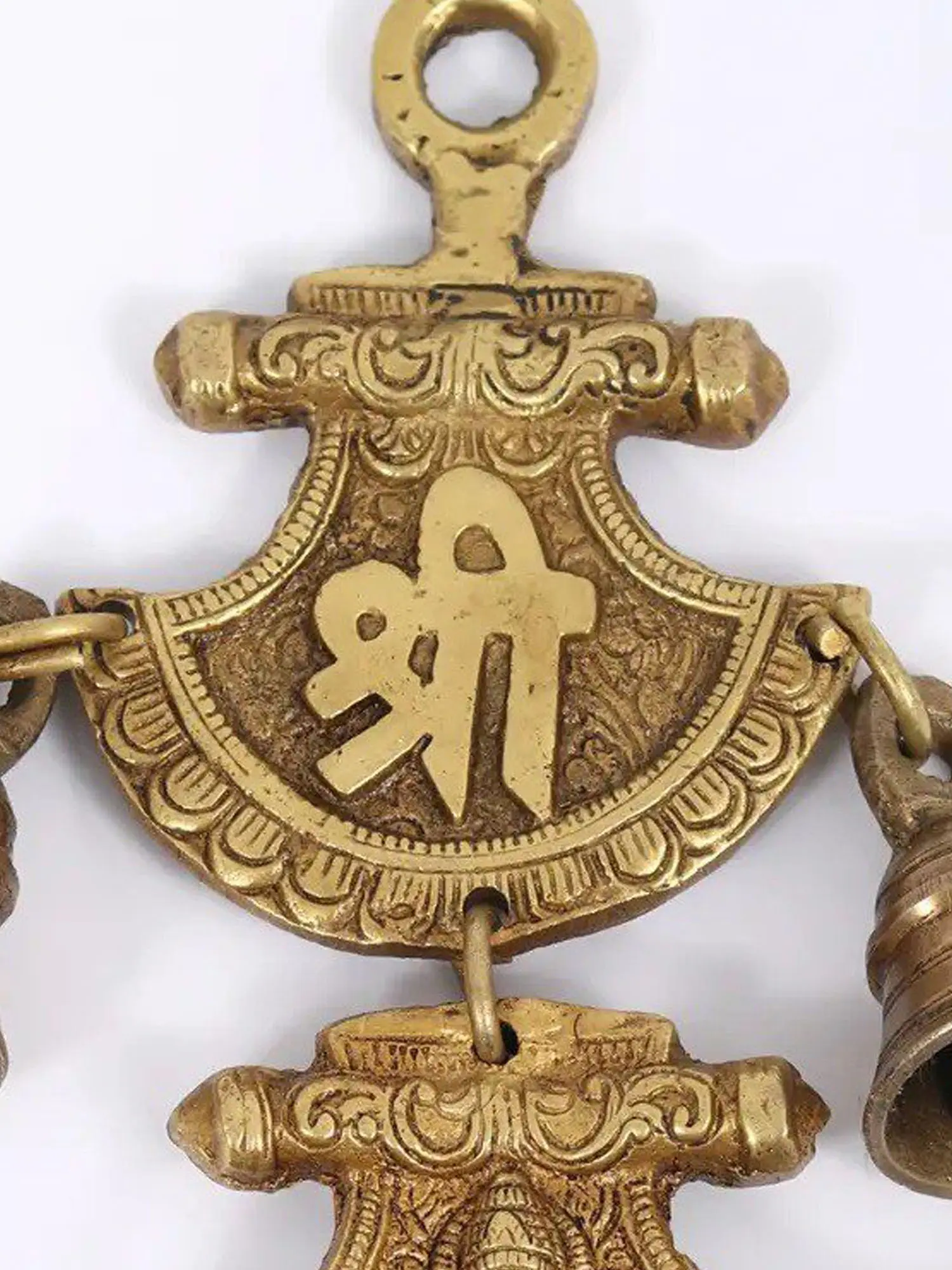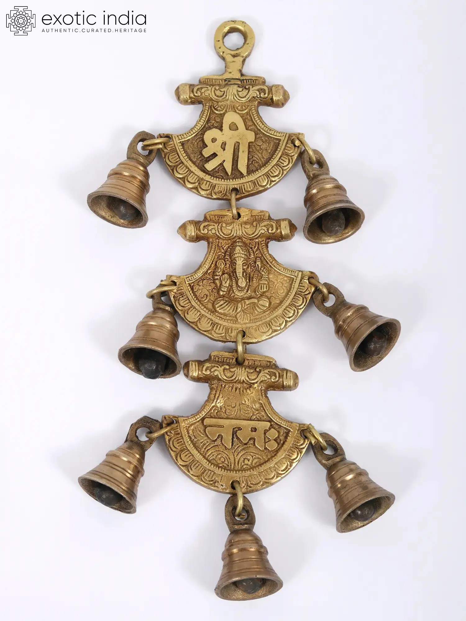 This lovely wall-hanging bell is crafted of high-quality brass and has the sacred mantra "Shri Ganeshaye Namah" in the shape of three separate sections connected together. The first section has the inscription Shri, the second has the inscription Ganesha, and the third has the inscription Namah. The three pieces which look like handfans are further embellished with bells, which infuse the sacred picture of the inscriptions with heavenly vibrations. When hung on the side panels of a home's main entry, this hanging bell produces the finest benefits for purifying the environment.