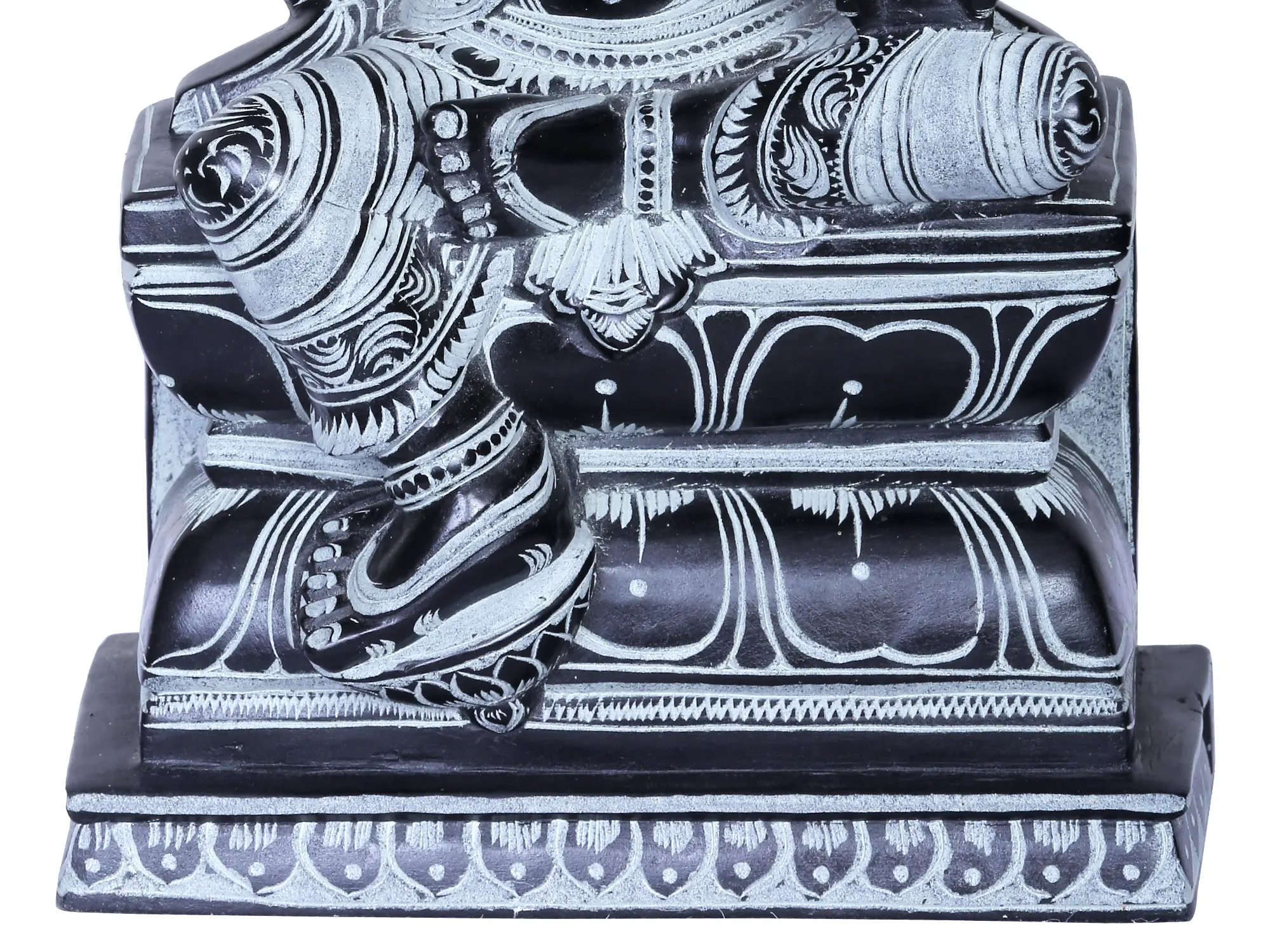 This exquisite stone statue depicts the formidable and benevolent Sri Devi Karumariamman, a powerful Hindu goddess revered for her protective energies and her role in eradicating diseases and misfortune. Crafted from rich, dark stone in the renowned sculptural tradition of Mahabalipuram, South India, this piece is a testament to the enduring artistry and deep spiritual heritage of the region. The skilled artisans have meticulously carved every detail, bringing to life the divine presence of the goddess.