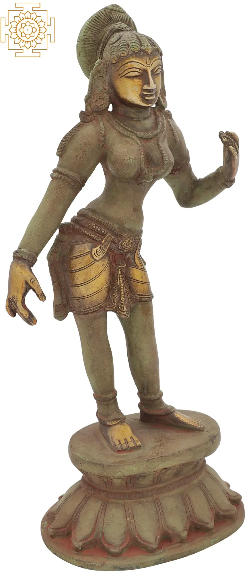 Step into the realm of divine beauty and ethereal charm with this exquisite brass statue, a testament to the rich artistic heritage of India. Standing at an impressive eleven inches, this sculpture captures the very essence of an Apsara, the celestial nymphs who grace the heavens with their unparalleled beauty and captivating dance. Each curve and contour is meticulously rendered, showcasing the artistry and devotion of the craftsperson who brought this divine being to life. The aged brass finish lends a timeless aura, evoking a sense of antiquity and profound spirituality. ––––––––––––––––––––
