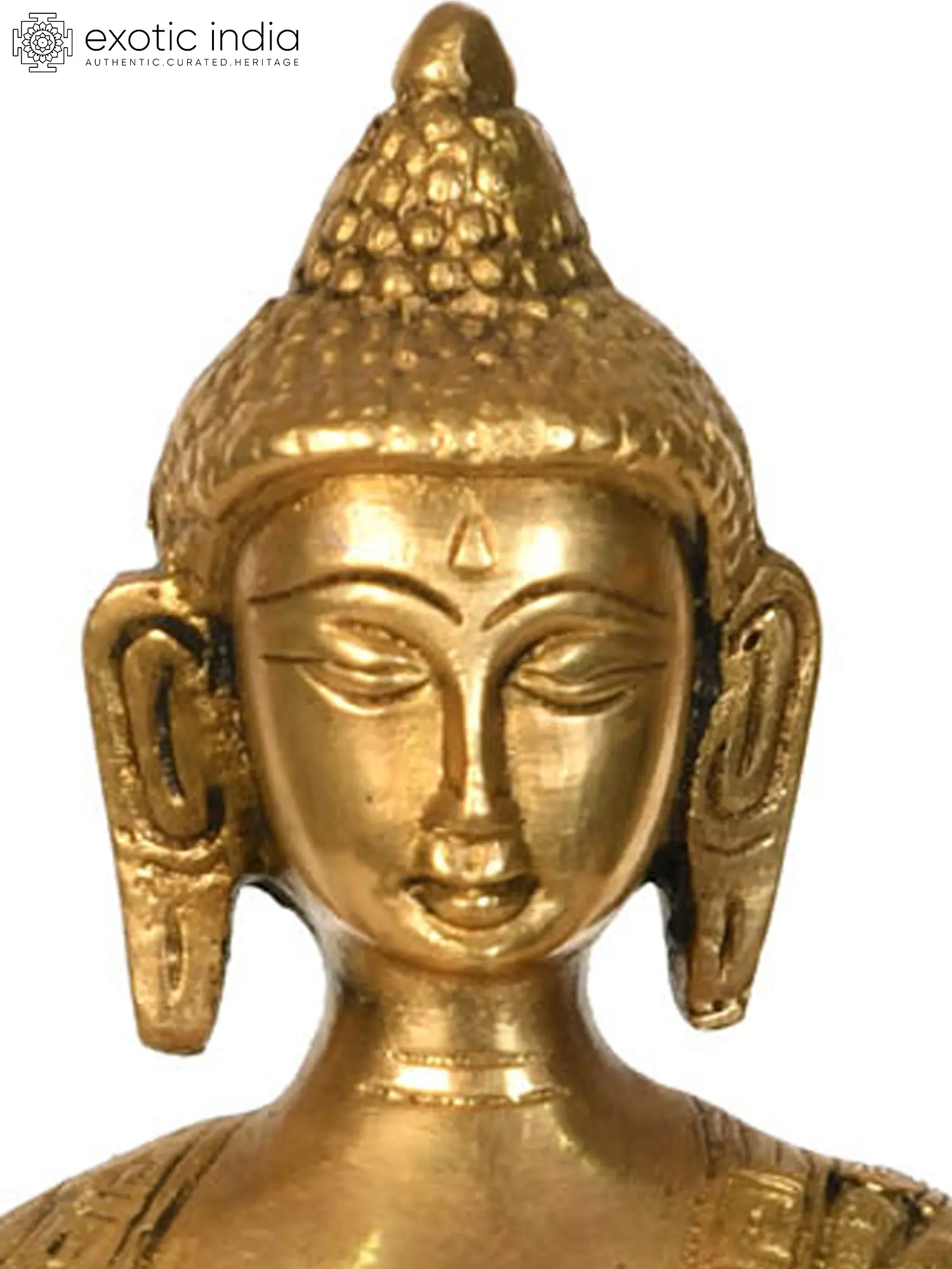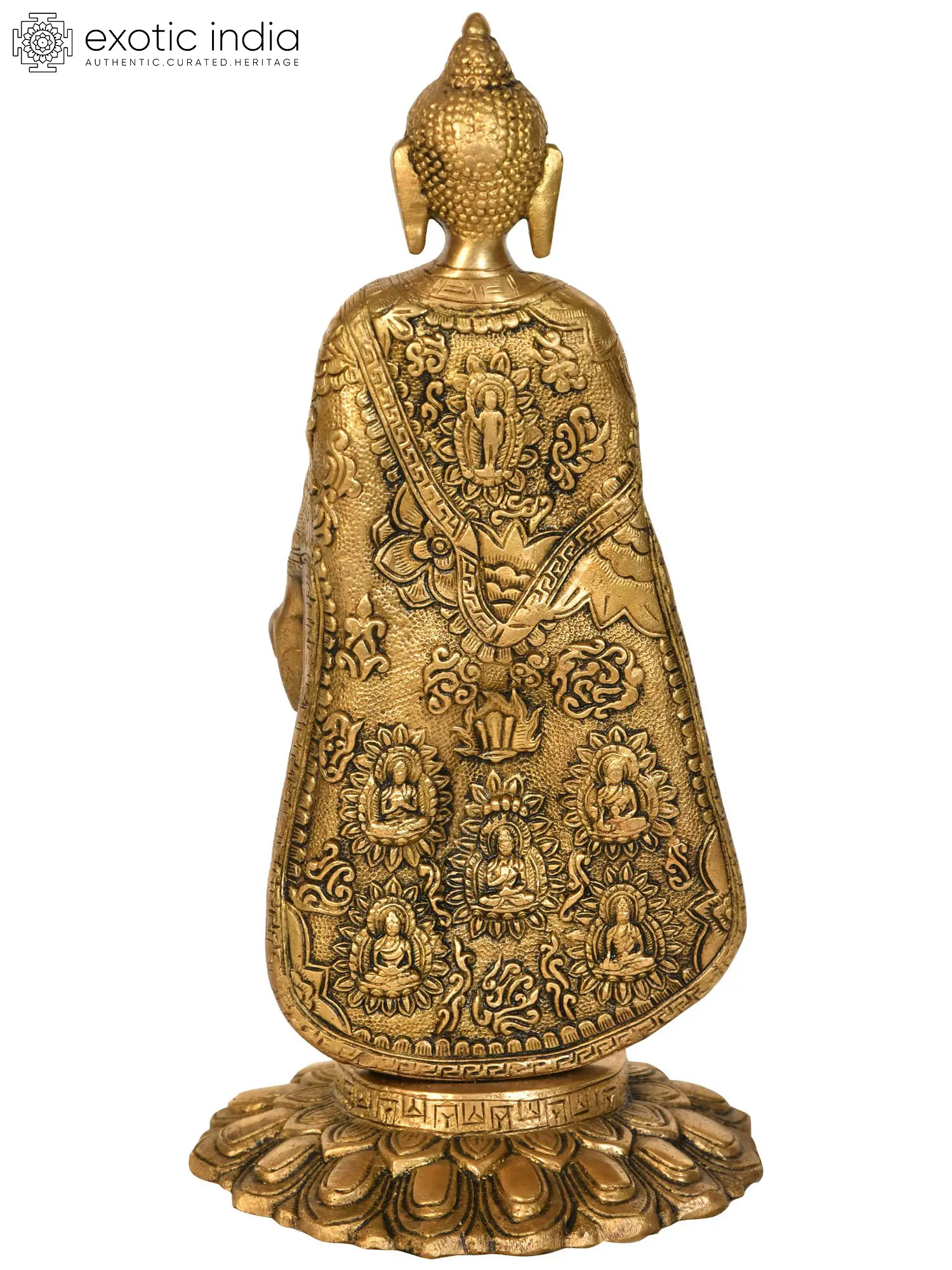 11" Standing Buddha, His Hands In Abhay Mudra, Auspicious Motifs On His Robes In Brass | Handmade | Made In India
