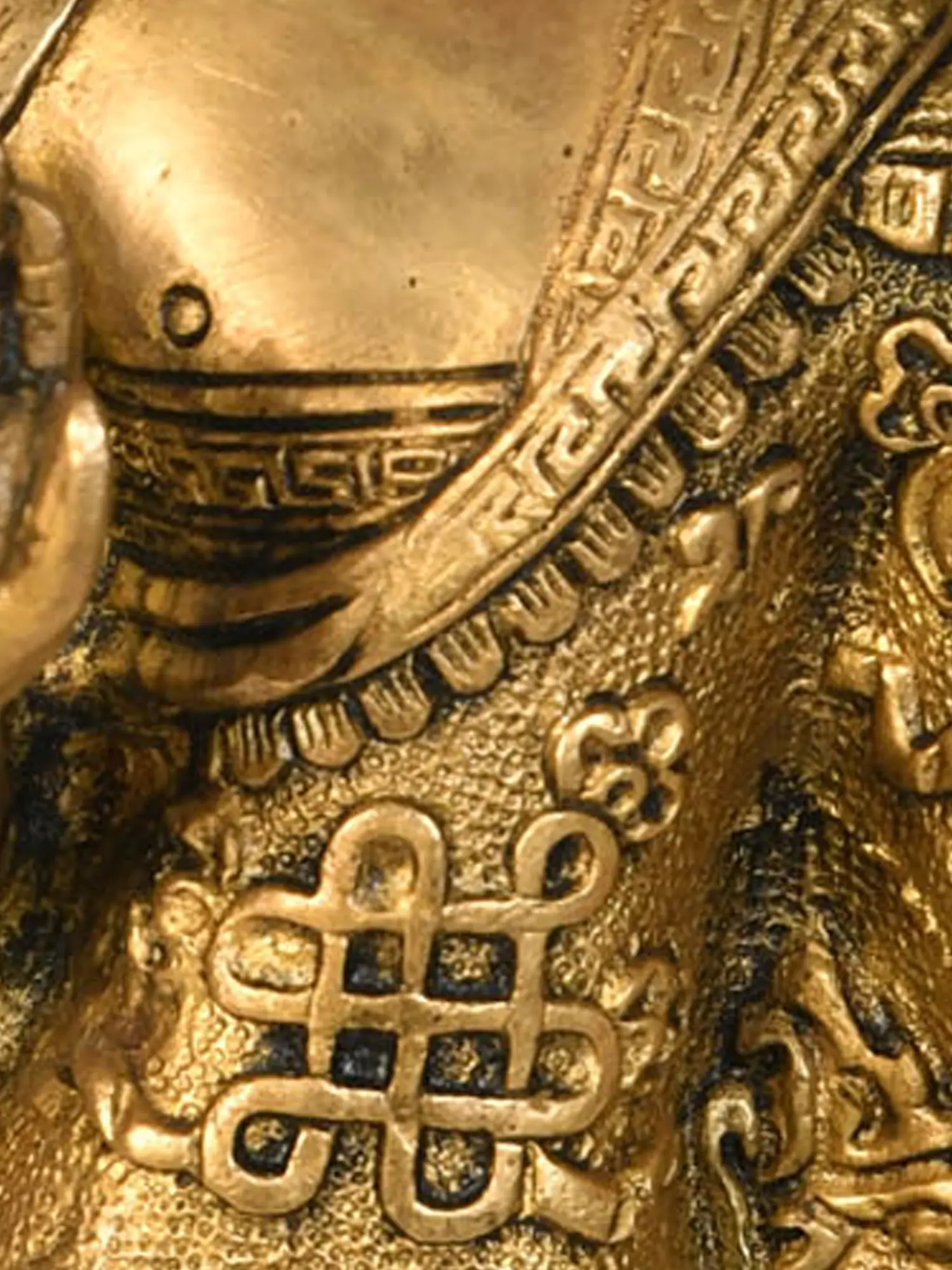 Crafted by skilled artisans in India, this statue is a testament to traditional craftsmanship and artistic excellence. The use of brass lends a timeless quality and a lustrous finish that will deepen with age. The robes of the Buddha are adorned with a tapestry of auspicious motifs, each carrying profound meaning within Buddhist traditions. The central knot, often referred to as the Endless Knot, is one of the eight auspicious symbols and represents the interconnectedness of all things, the unity of wisdom and compassion, and the eternal nature of the Buddha's teachings. The vibrant colors and intricate details of these symbols, such as the lotus flowers signifying purity and enlightenment, add a layer of visual richness and spiritual depth to the piece. The flowing mantle, rendered in a vibrant golden hue, further enhances the divine presence of the sculpted figure. ––––––––––