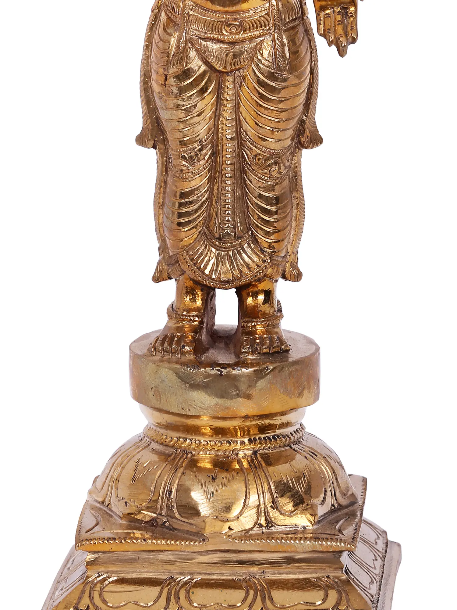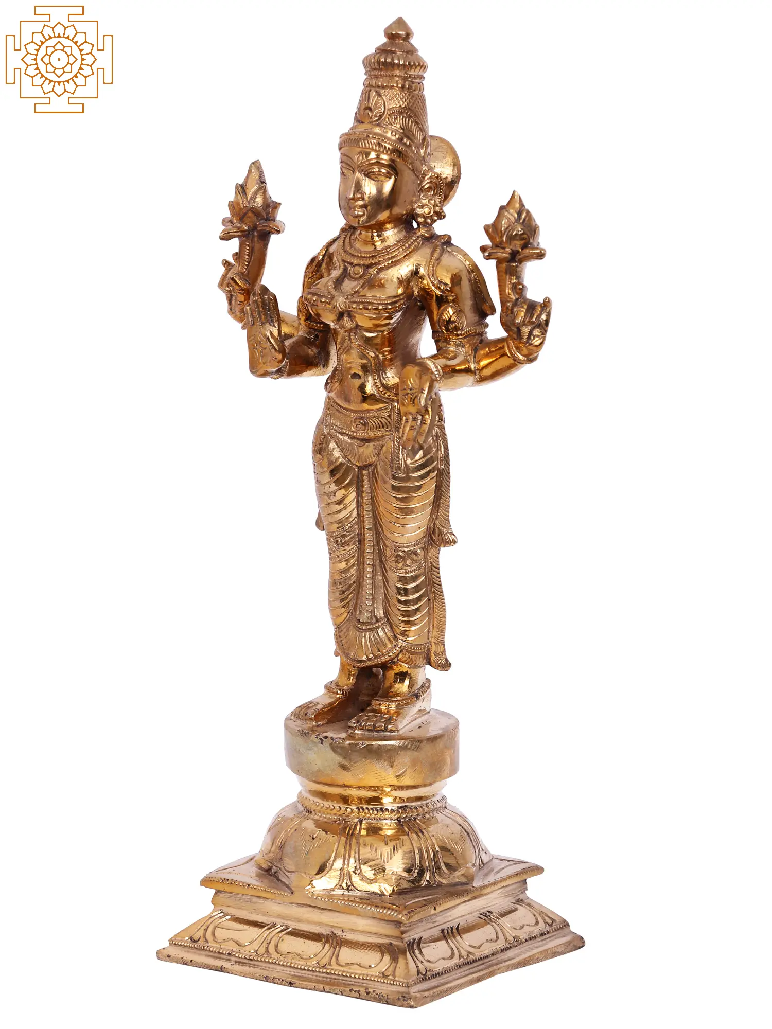 Invite divine blessings and an aura of prosperity into your home with this exquisite standing Goddess Lakshmi statue. Crafted with meticulous detail using the ancient Madhuchista Vidhana, or lost-wax casting, technique, this piece is a testament to the rich artistic heritage of Swamimalai. Panchaloha, an alloy of five metals, imbues the sculpture with a unique luminescence and durability, making it a cherished heirloom for generations to come. The goddess stands tall, embodying grace and abundance. In her hands, she holds lotuses, symbols of purity, beauty, and spiritual awakening. Her serene countenance reflects a profound sense of peace and contentment, inviting similar qualities into the environment where she is placed. This statue is more than just an art object; it is a conduit for divine energy, believed to attract wealth, fortune, and overall well-being.