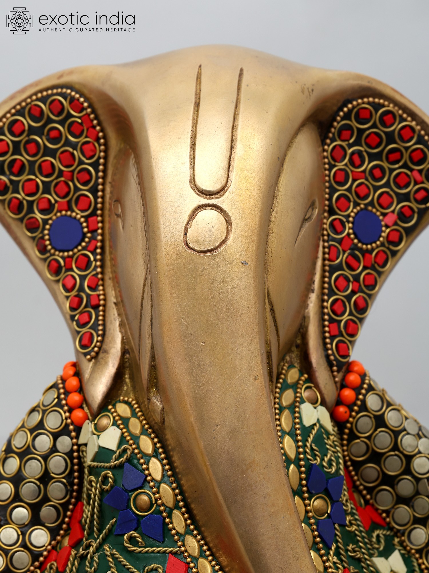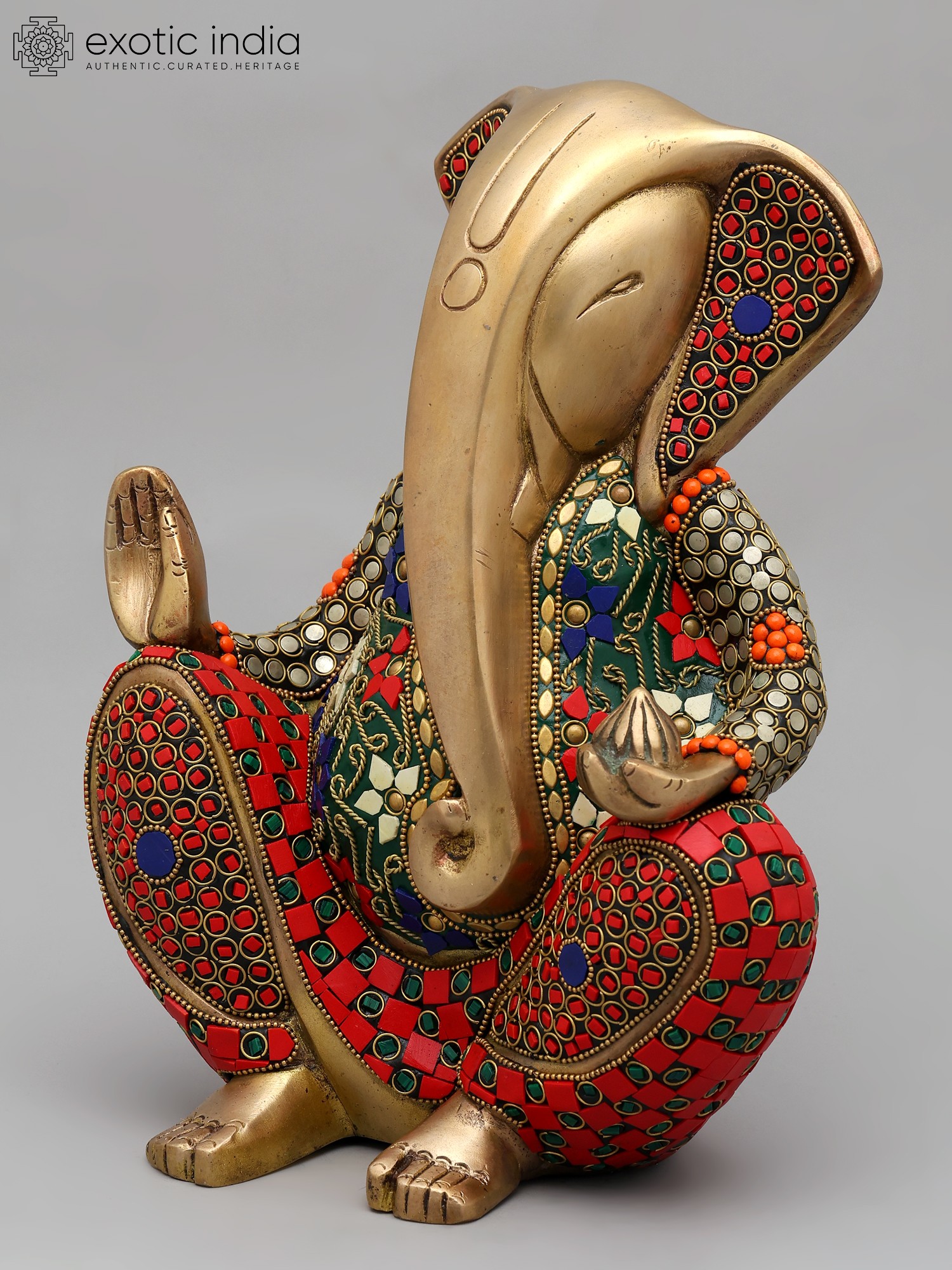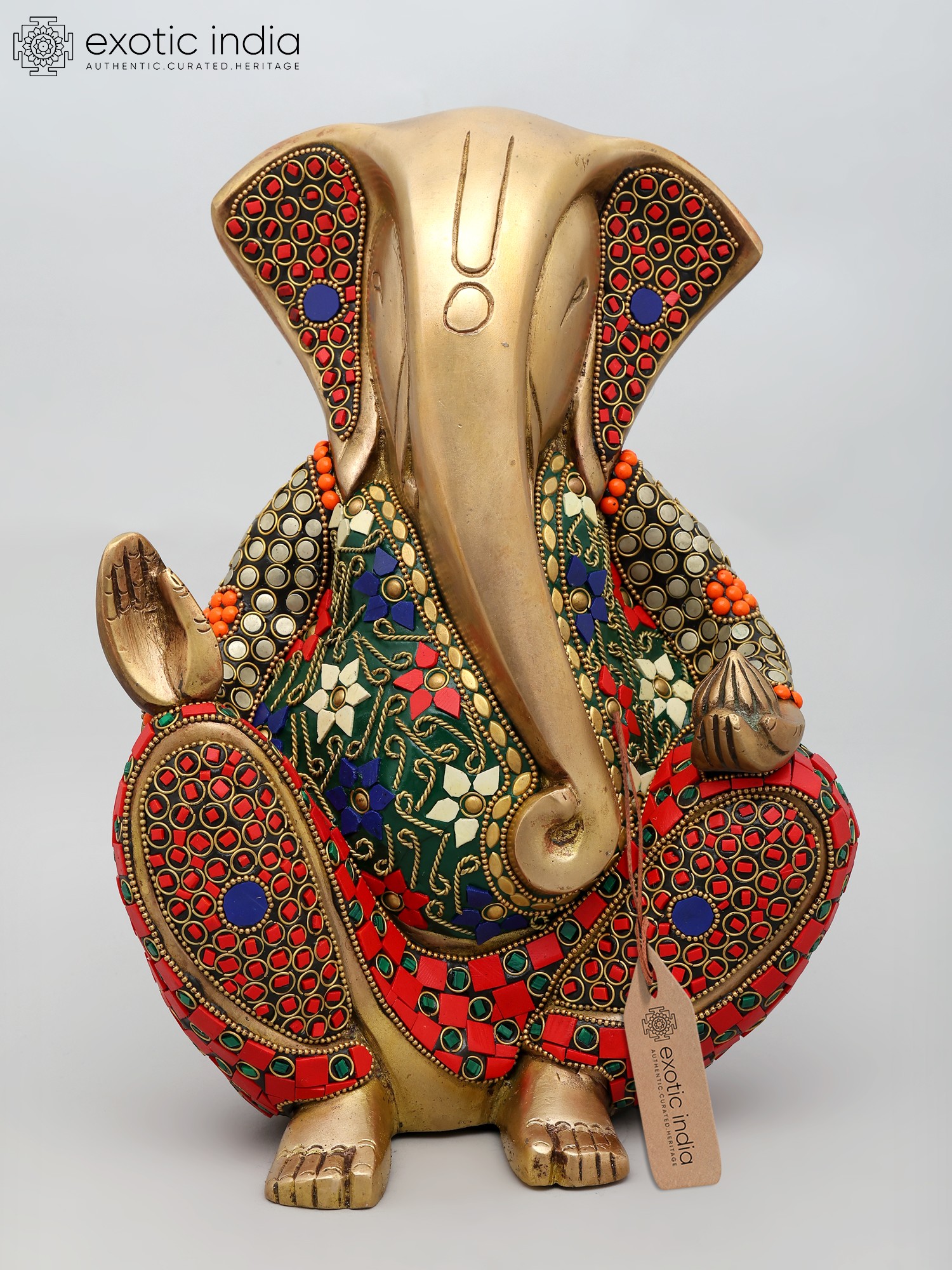 16" Stylized Ganapati Granting Abhaya (Inlay Statue) In Brass | Handmade | Made In India