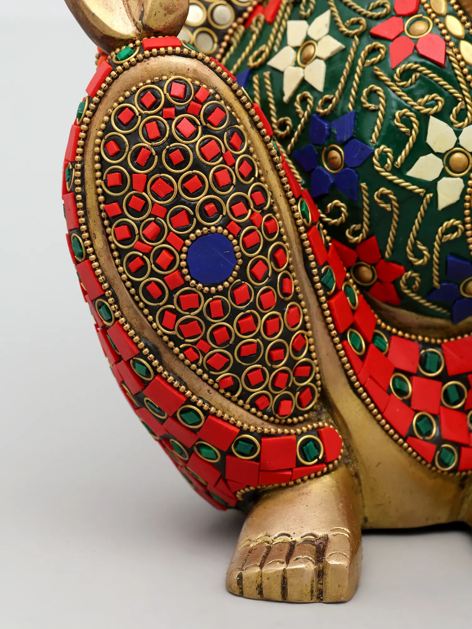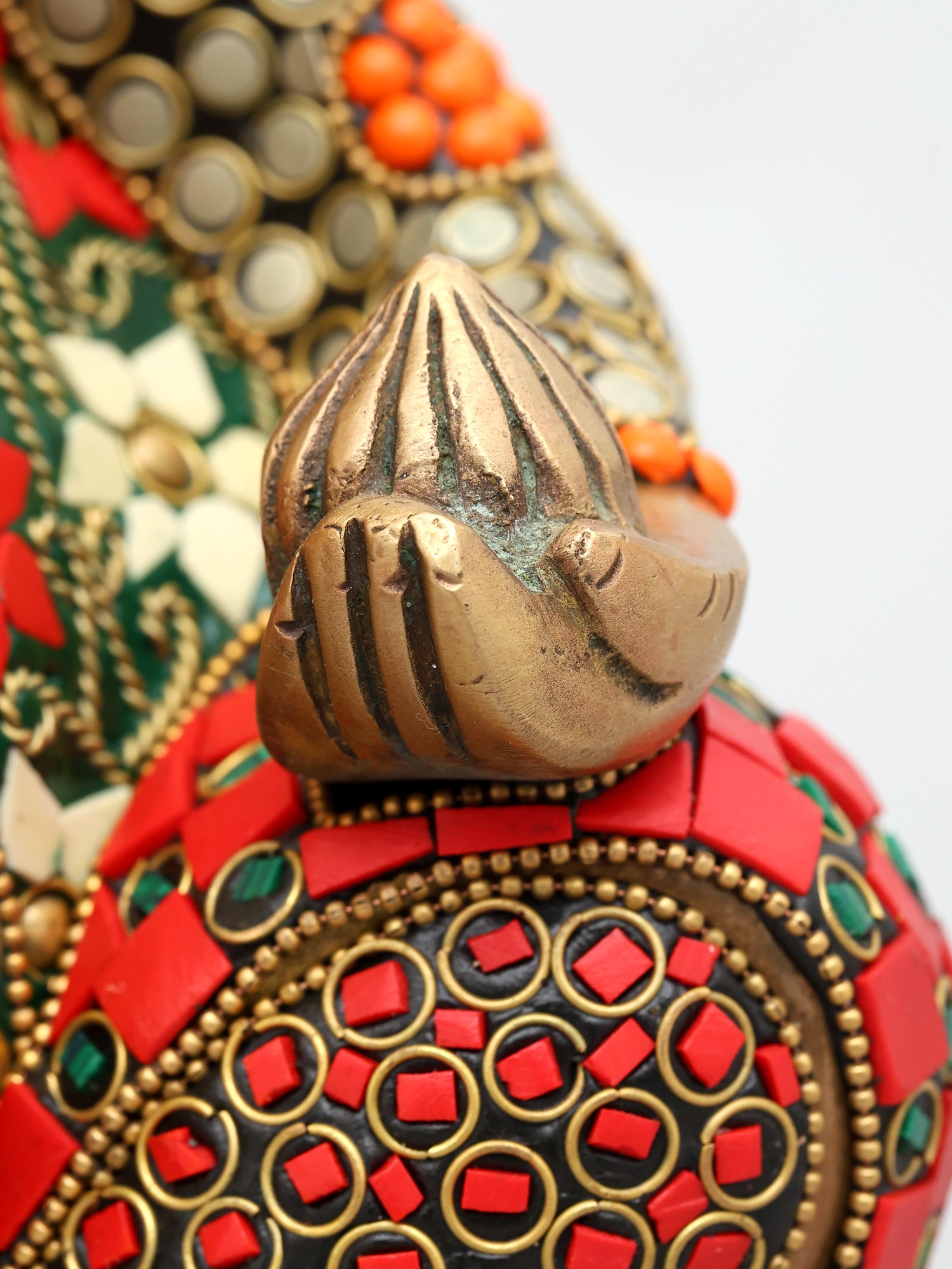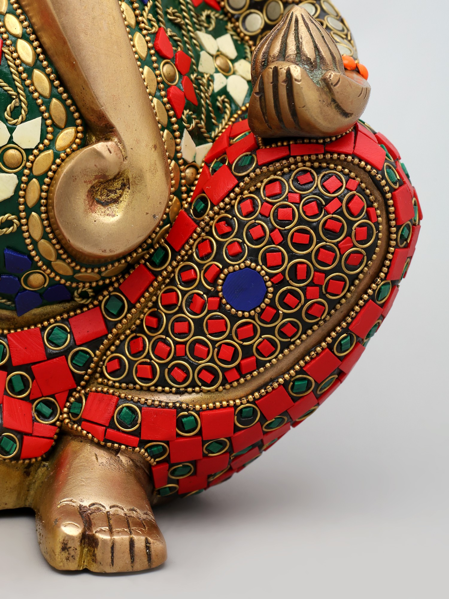 Envision a serene space filled with positive energy and a sense of auspiciousness. This hand-crafted statue invites the presence of Ganesha, the remover of obstacles, into your home or sacred space. Sculpted from brass, the lustrous golden hue radiates warmth and tranquility. The intricate inlay work, featuring an array of vibrant colors, breathes life into this depiction, creating a piece that is not only spiritually significant but also a visual delight. Ganesha, the elephant-headed deity, is revered as the embodiment of wisdom, prosperity, and good fortune. Placing this statue in your home is a gesture of welcome, inviting these positive qualities to flow freely into your life.