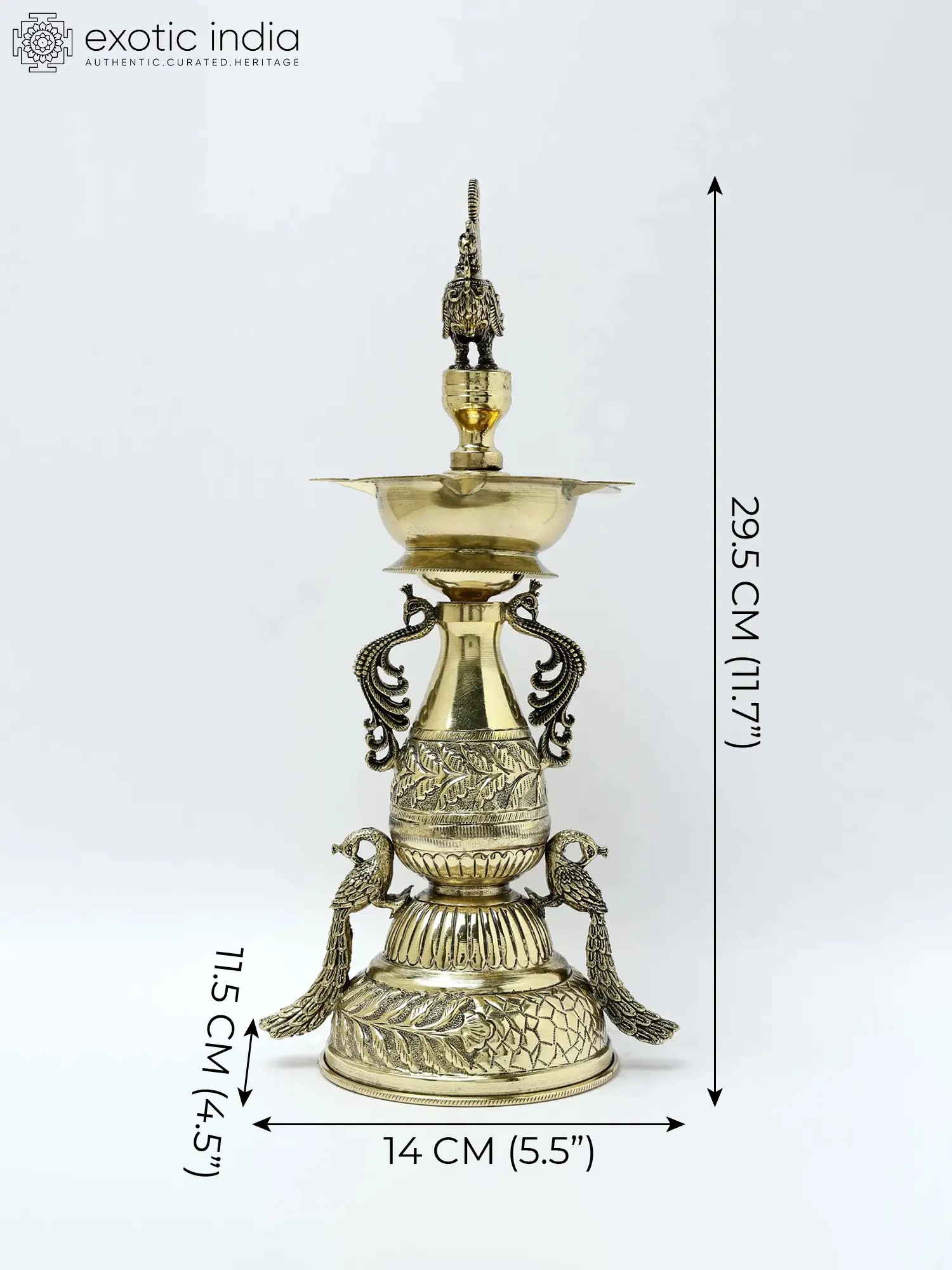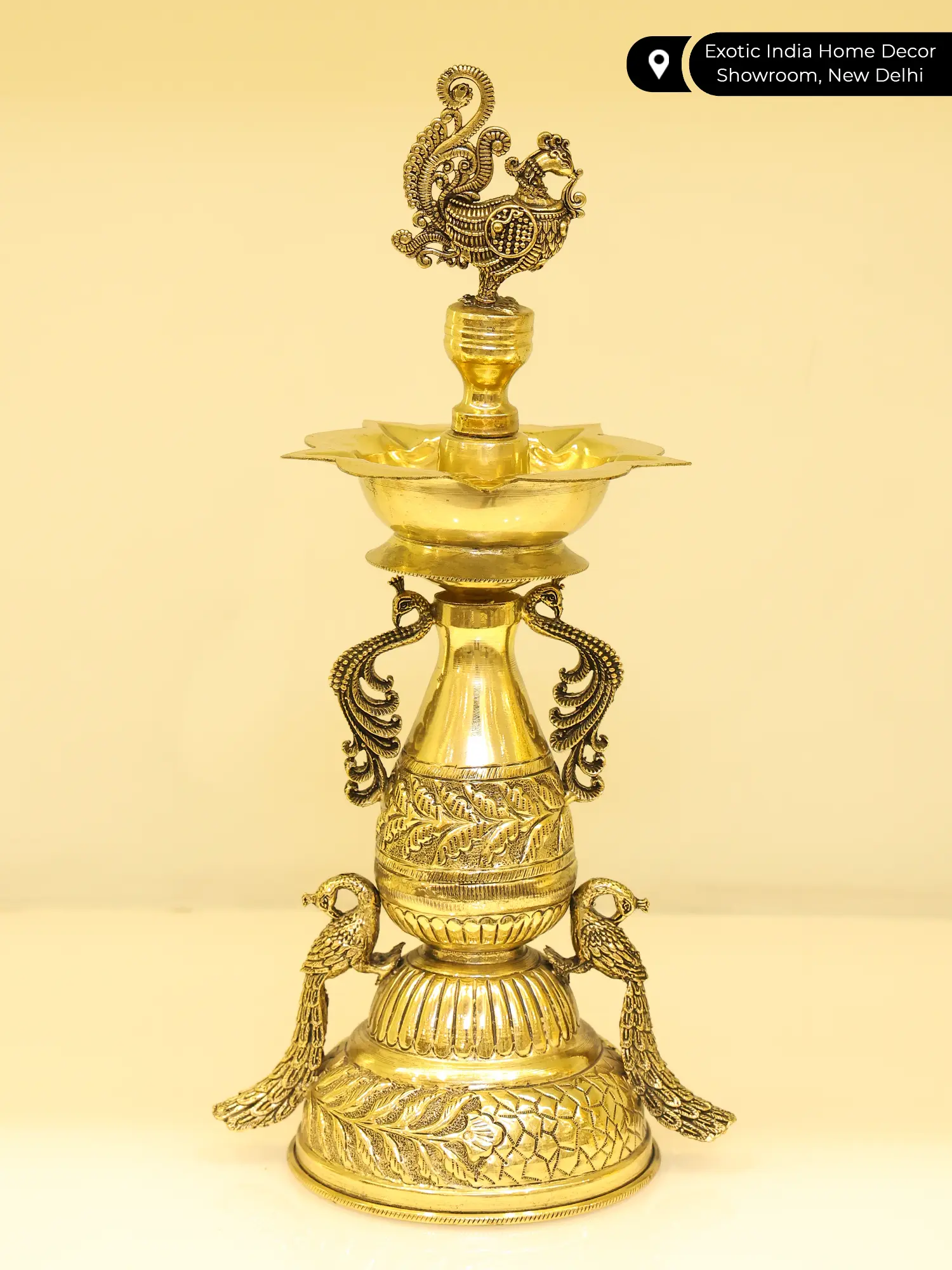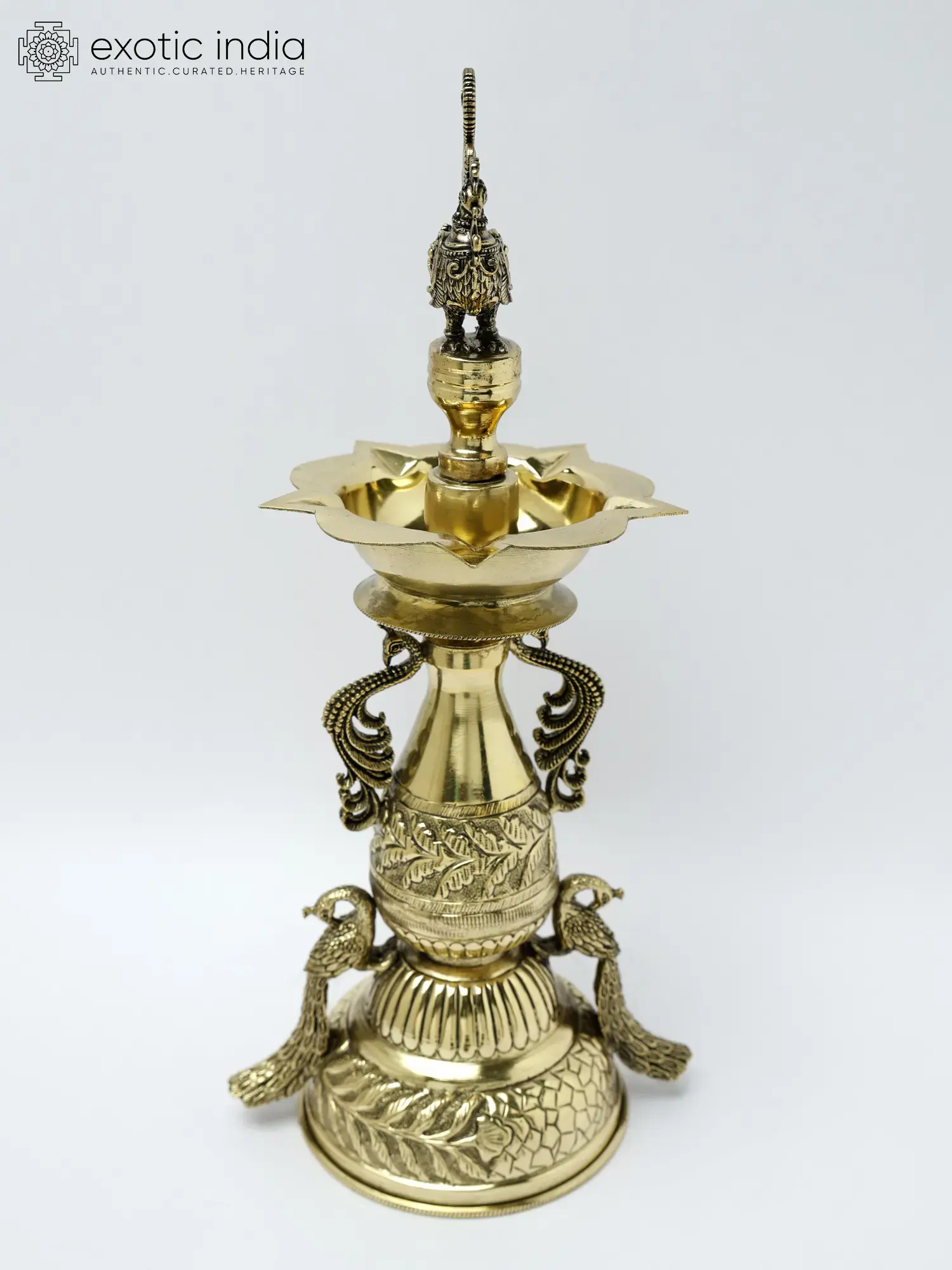 The base of the lamp is beautifed with two stylized Mayura or peacock, symbols of royalty and divinity.