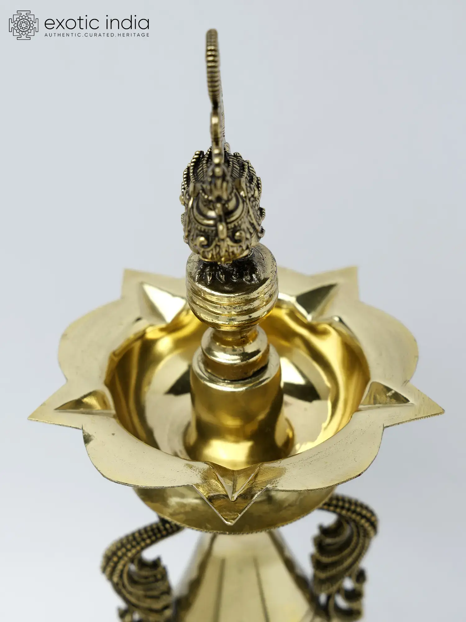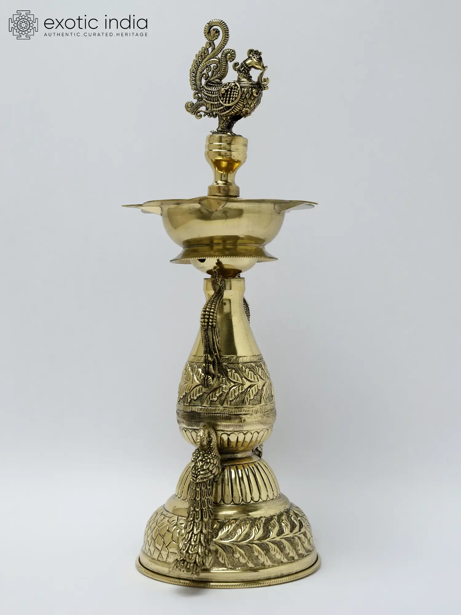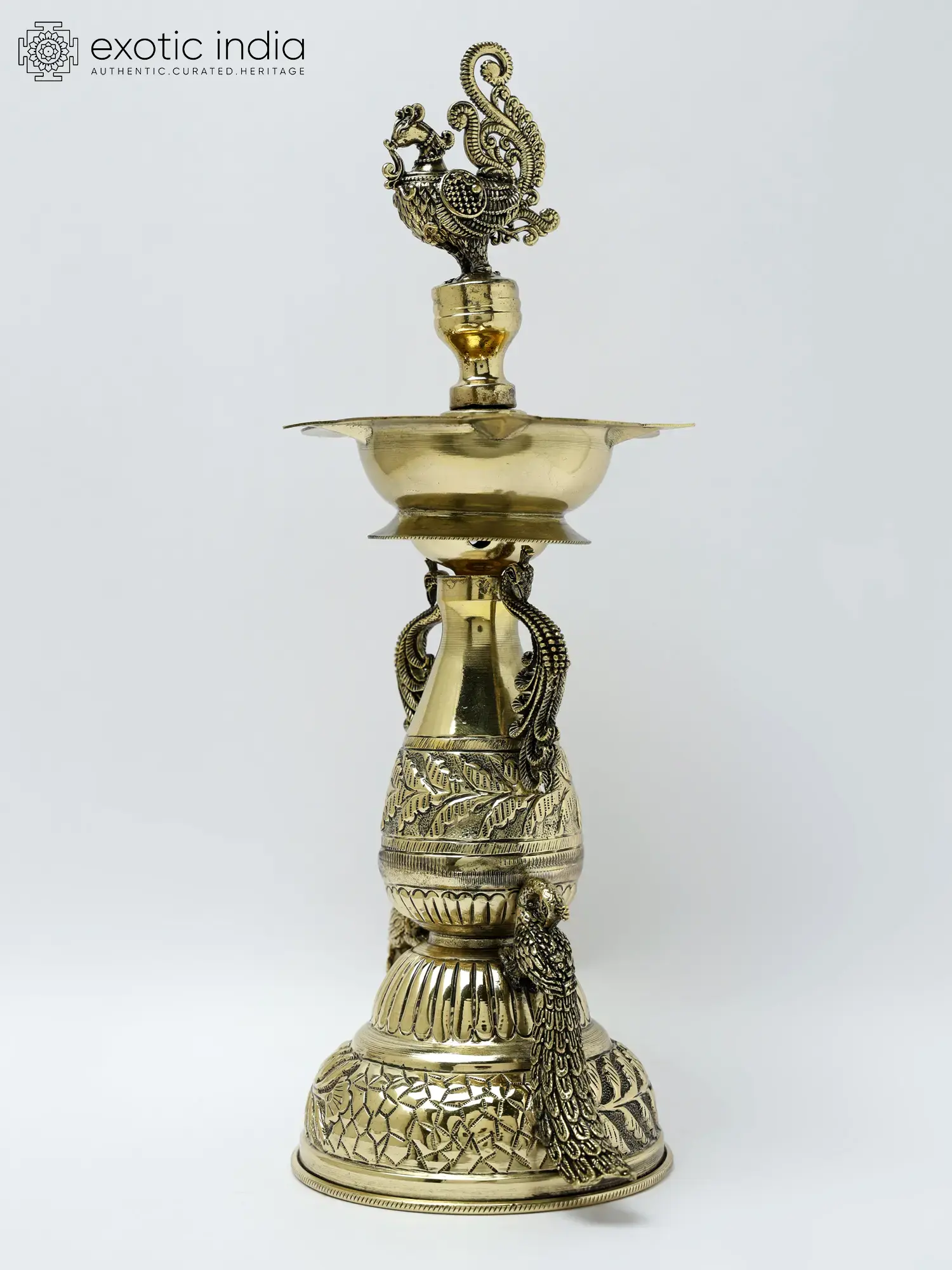 The base of the lamp is beautifed with two stylized Mayura or peacock, symbols of royalty and divinity.