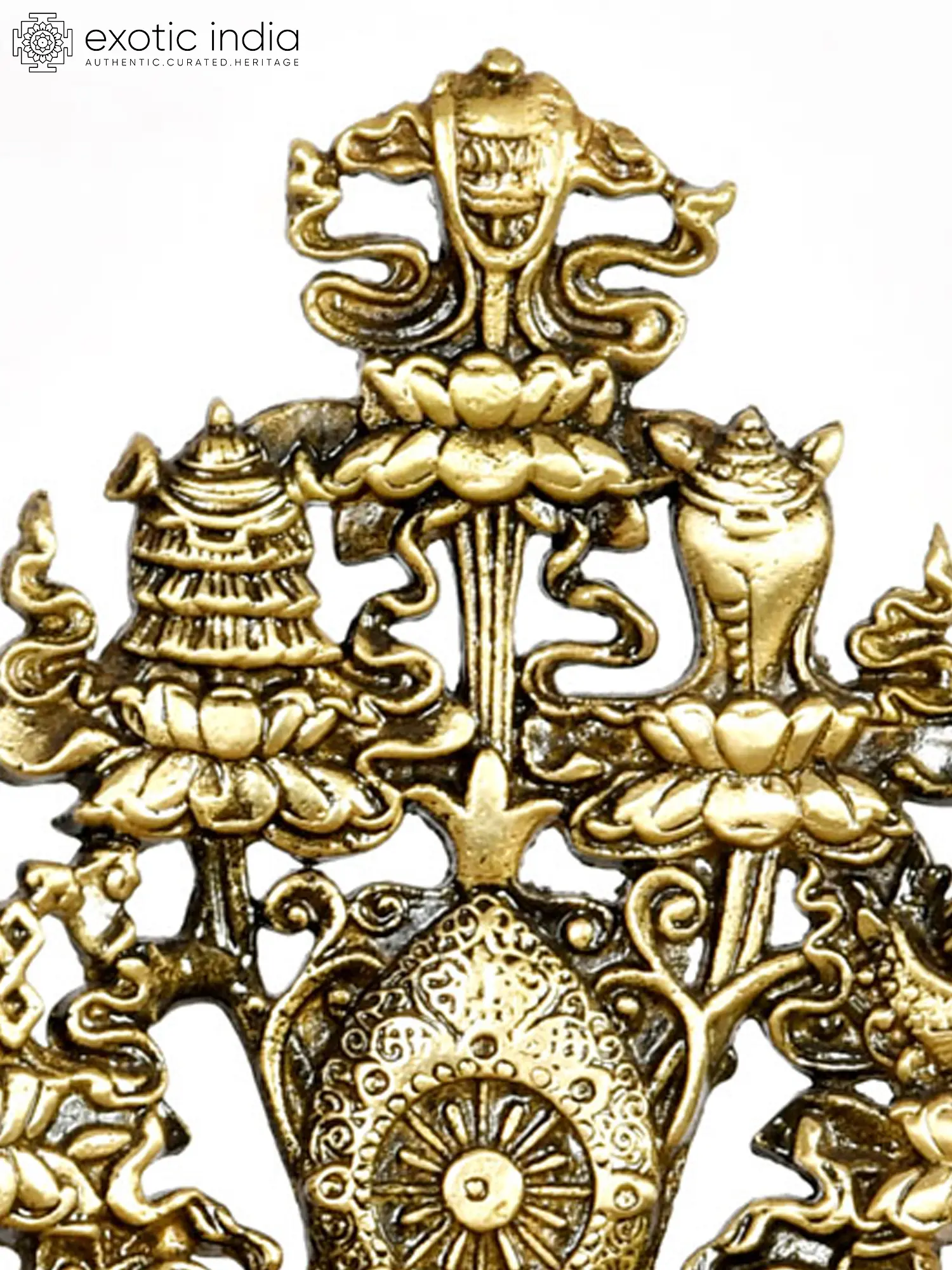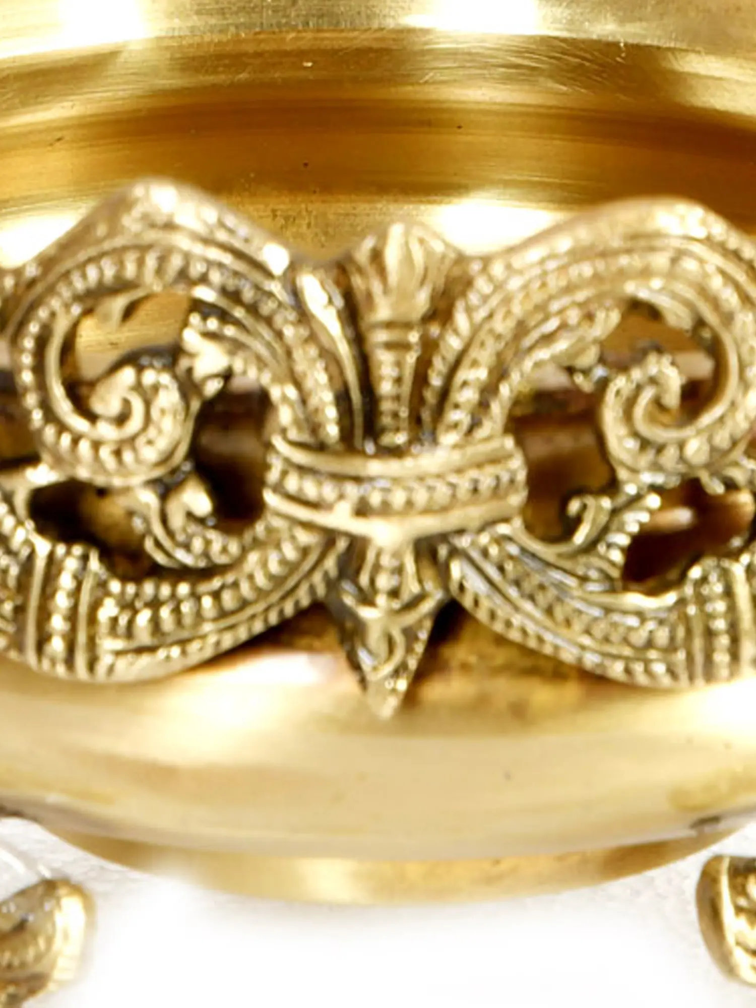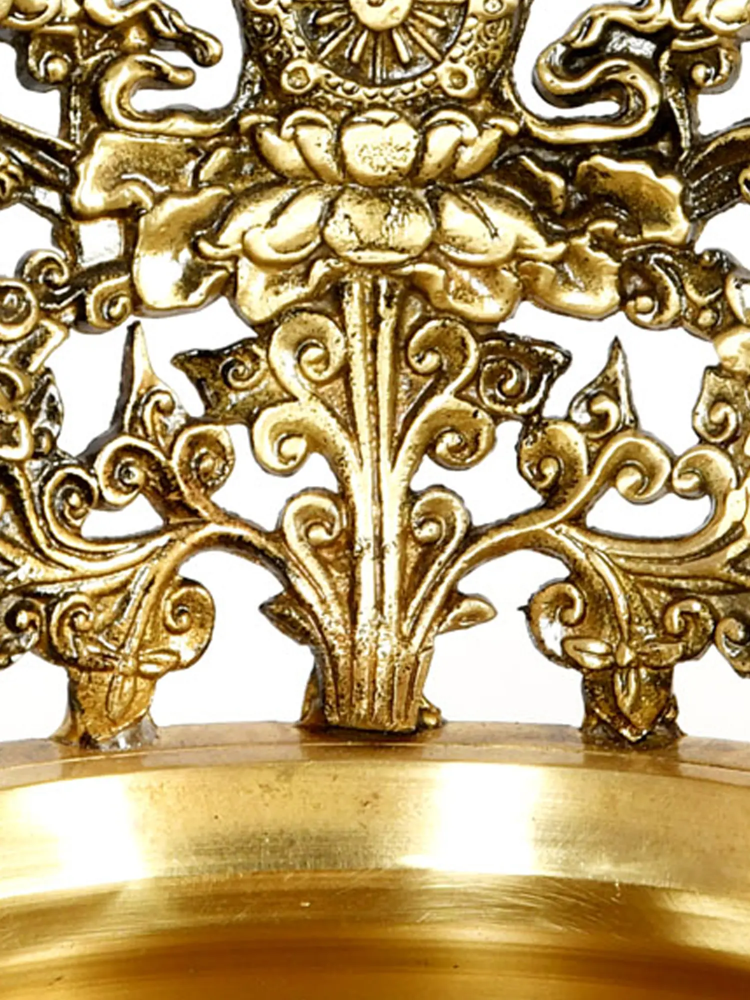 An exquisite composition in pure brass, this Urli is adorned with the auspicious eight signs or Ashtamangala of Buddhism, stacked upon one another with a stunning balance and intricacy. The Urli bowl is embellished with flowering vines and two elephants postured majestically with their trunks in the air and it stands on stylized vegetation patterns. Glistening lavishly and empowered with propitious symbols, this brass Urli is ideal for performing rituals at home.