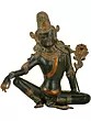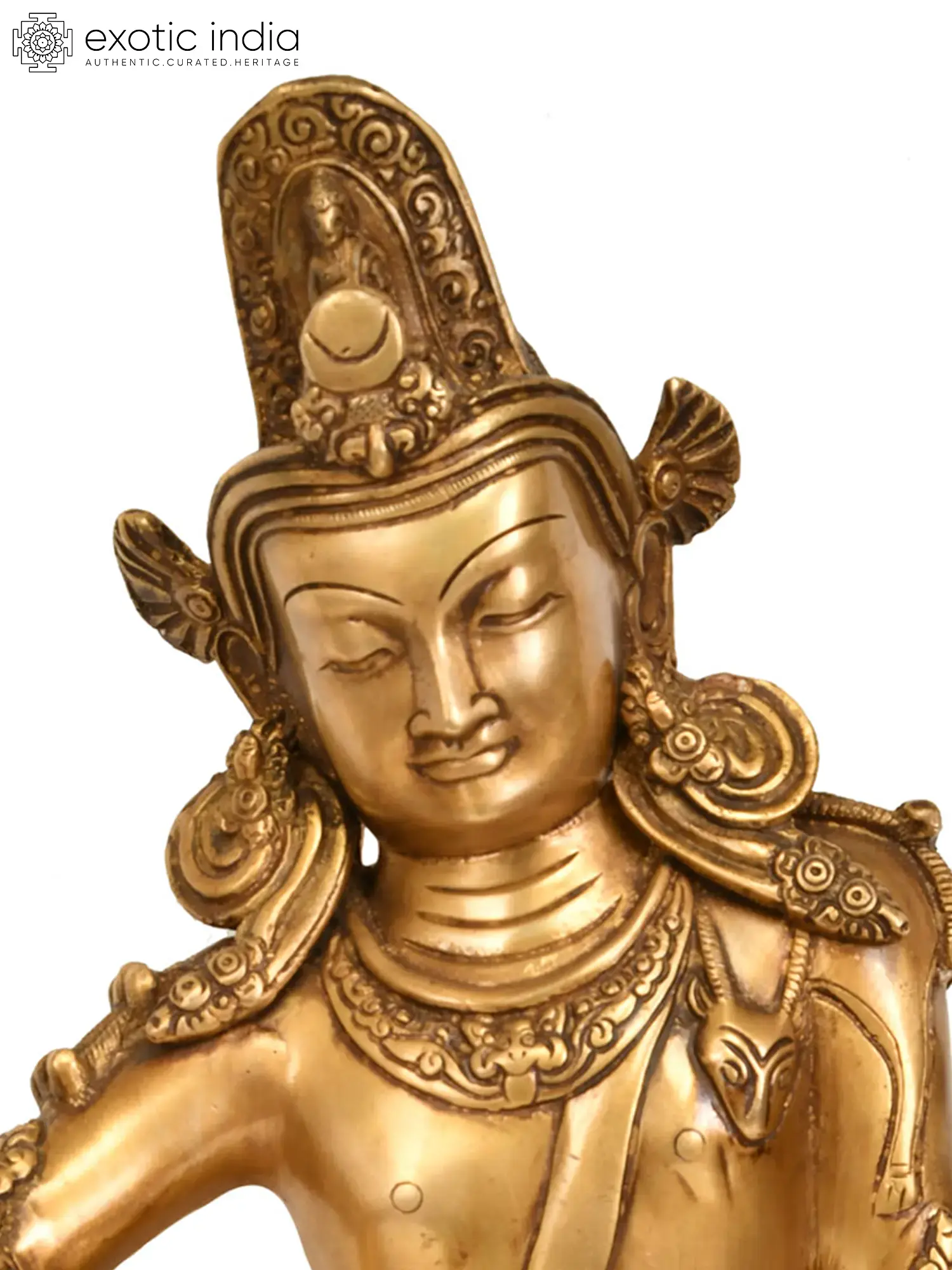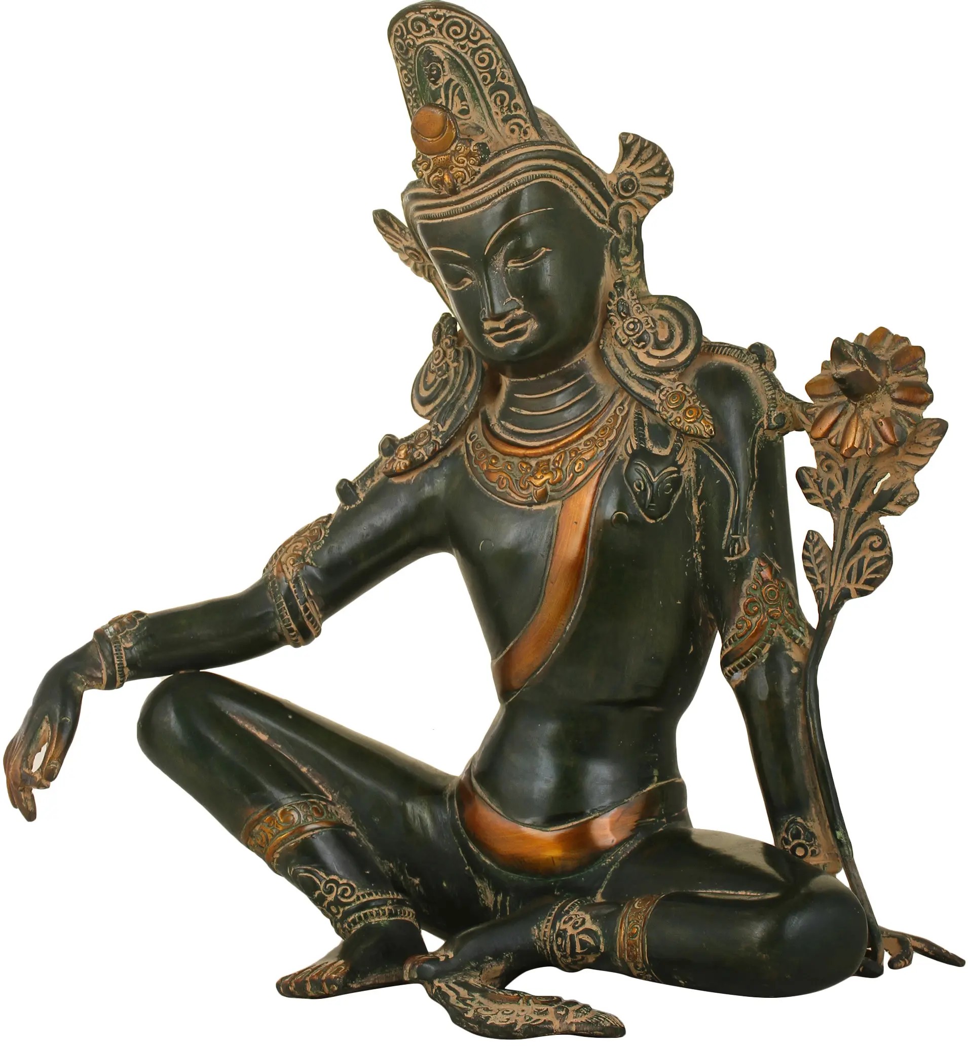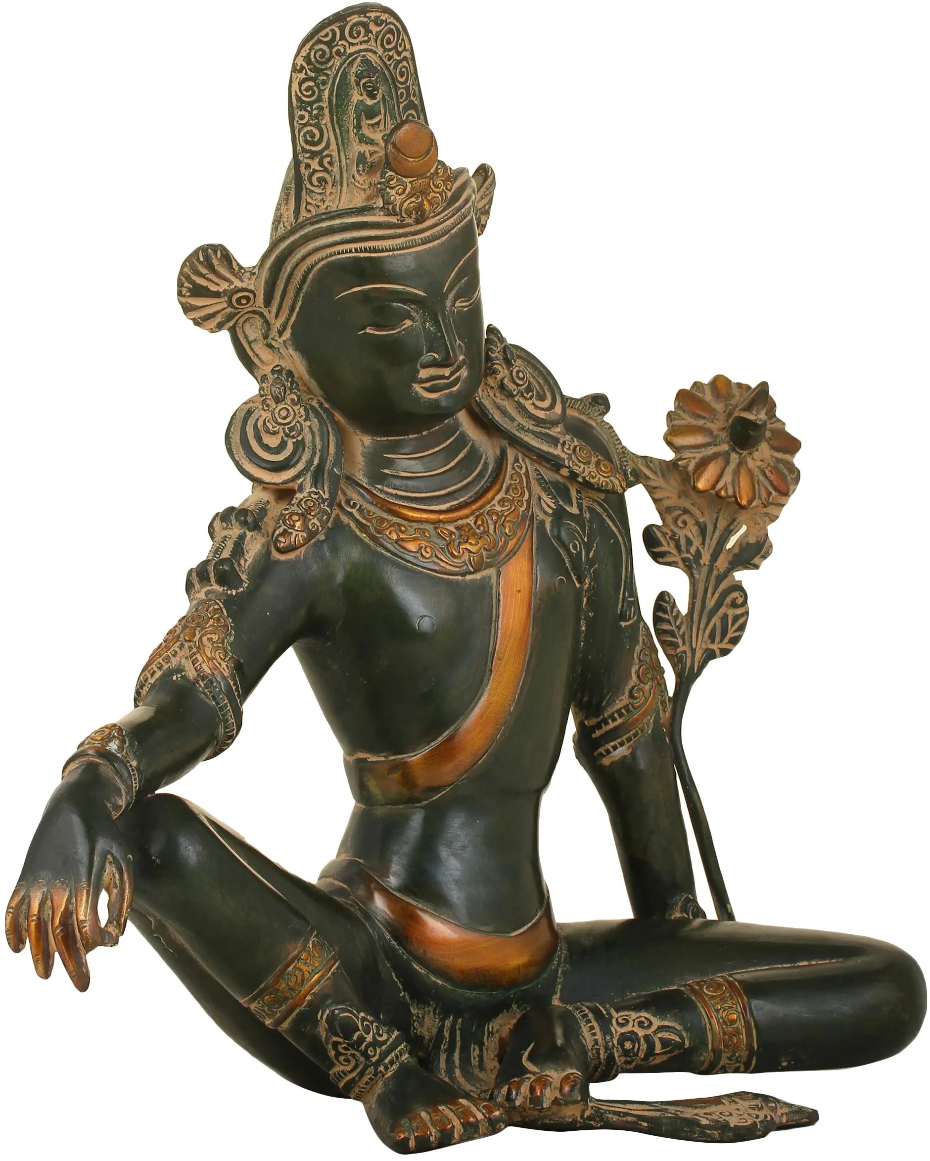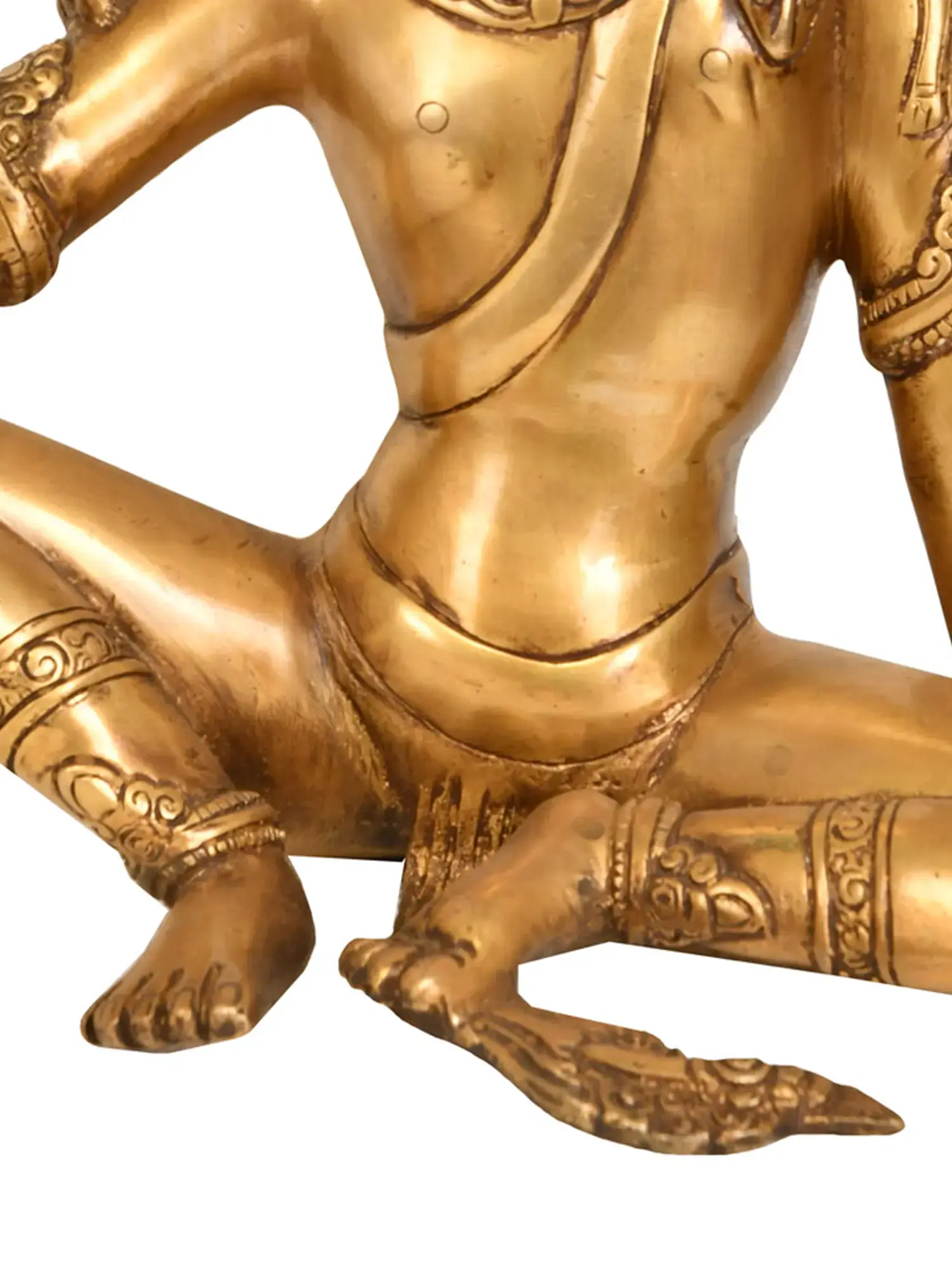 The gentle Avalokiteshvara is seated with the feet gathered afore the mooladhara chakra. The sole of the left foot faces skywards, while that of the right is placed firmly on the ground beneath Him. As such, the right knee is slightly raised, over which He rests the right hand. Its fingers are gathered in the vitarka mudra, an expression of dispensing vidya (awareness).