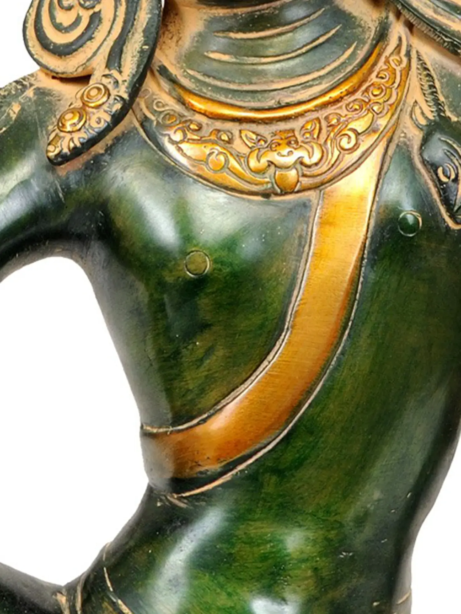 Supple, expressive limbs; and a long, slender torso. The metallic green colour finish of His bare body. Adornments in solid gold colour, accentuating each aspect of the beauteous Bodhisattva form. A rudimentary Kirtimukham at the centre of the neckpiece. Anklets and amulets down the length of His limbs. The thick, gold-coloured hems of His raiment, across the torso and round the waist.