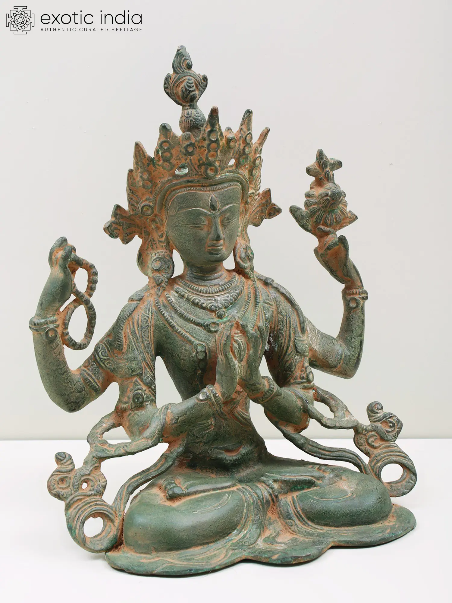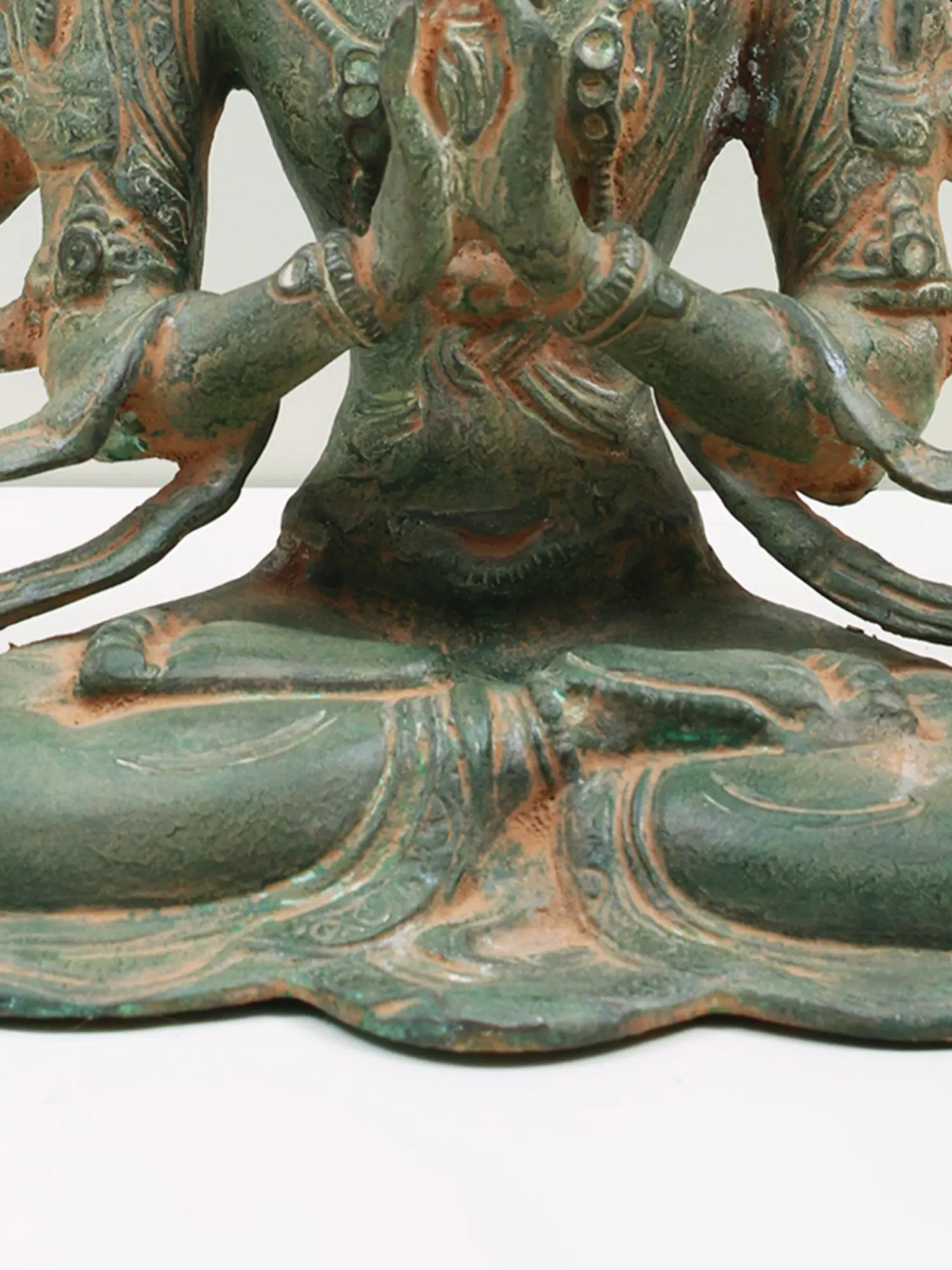 Chenrezig, also known as Avalokiteshvara, is a revered Bodhisattva in Tibetan Buddhism. Often portrayed as a symbol of compassion, Chenrezig is depicted with multiple arms and heads, signifying his ability to reach out and aid countless beings simultaneously. He is the embodiment of boundless compassion and serves as a source of inspiration for practitioners seeking to cultivate compassion and wisdom. Chenrezig is considered a compassionate deity who helps individuals overcome suffering and attain enlightenment. His mantra, "Om Mani Padme Hum," is widely recited and is believed to invoke his blessings and compassionate energy. Chenrezig's compassion extends to all sentient beings, making him a central figure in Tibetan Buddhist practice.