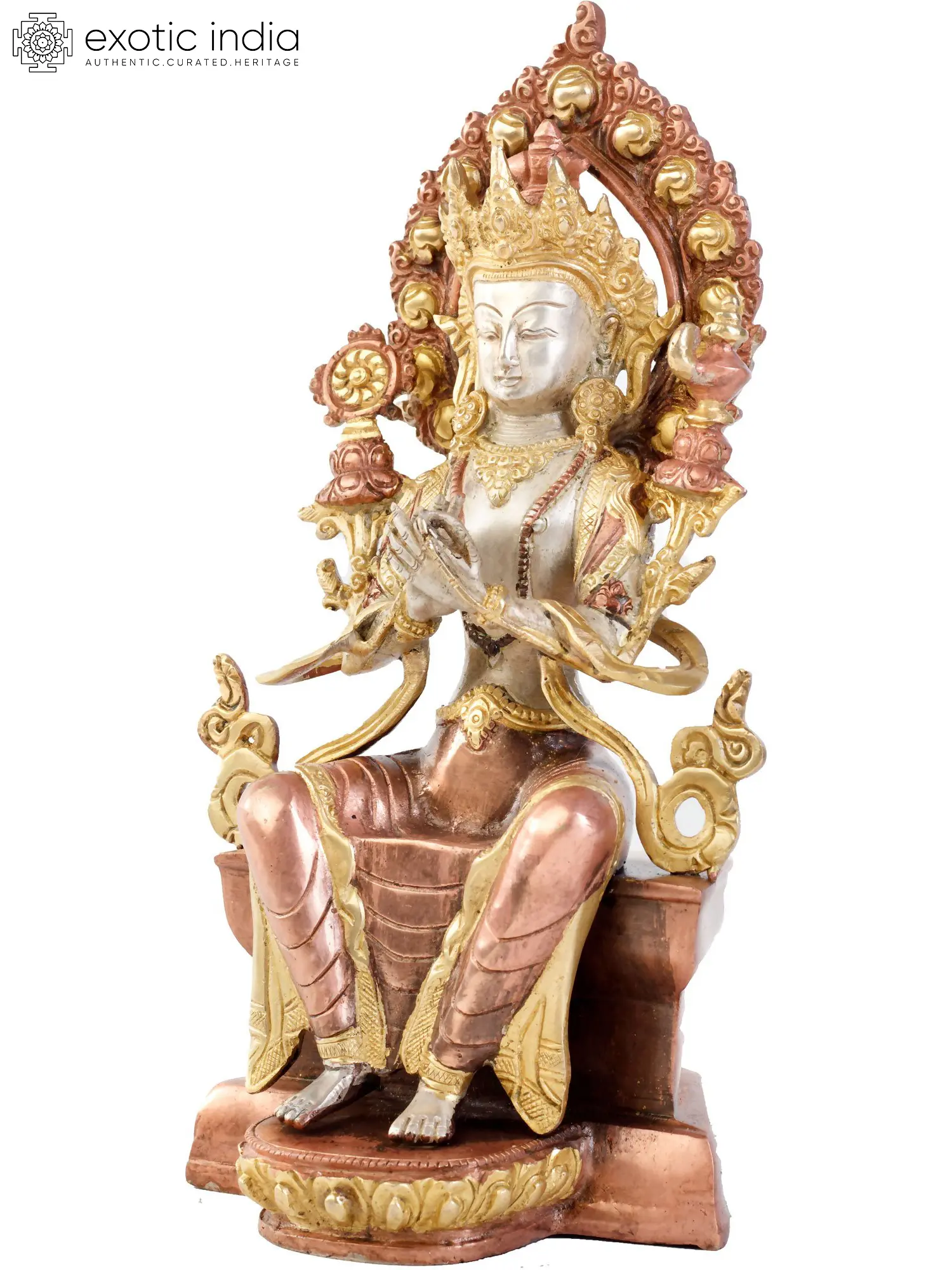 Maitreya is the only deity from the Hindu-Buddhist pantheon Who sits on a throne with His legs pendant. His throne comes in a glossy red finish, the aureole studded with gold conchs and topped off by a flaming spire.