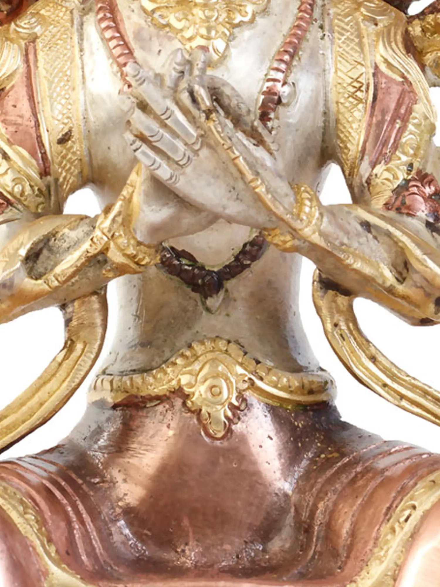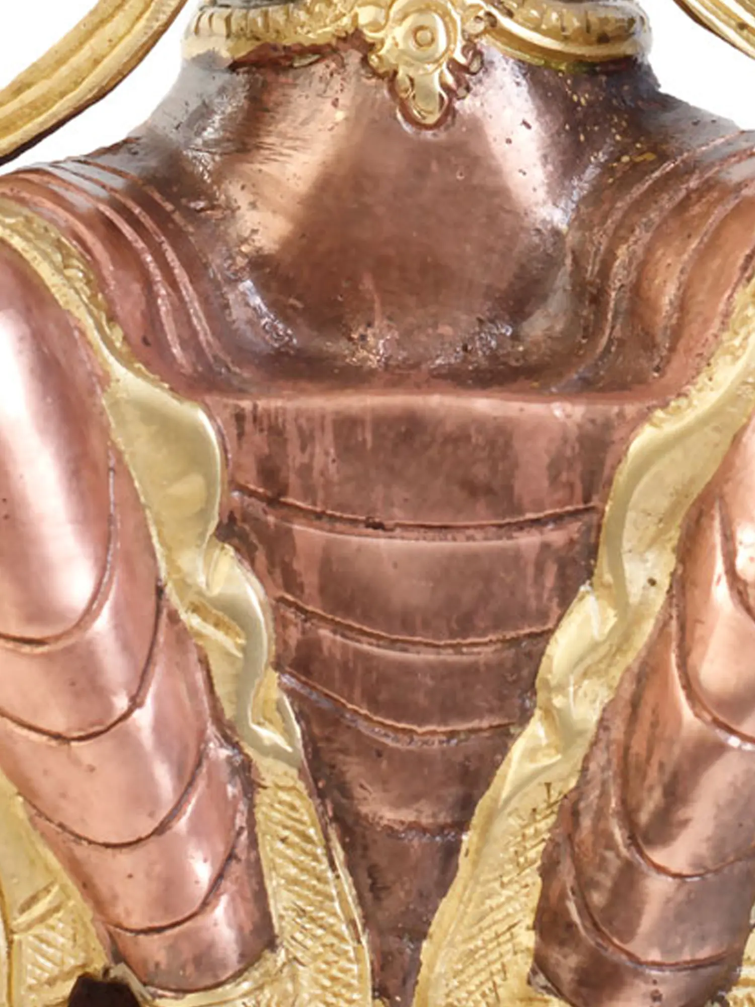 The striking colour combination of red, gold, and silver is indicative of endemic workmanship from Nepal. The whole sculpture is mounted on a lotus pedestal, atop which lies the big feet of the Buddha. His sash flows symmetrically on either side of Him.