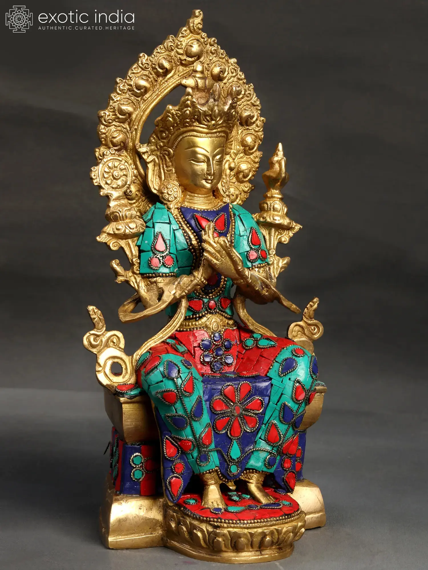 This exquisite brass sculpture depicts Maitreya, the Future Buddha, a figure of immense hope and spiritual anticipation in Buddhist traditions. Maitreya is revered as the successor to the historical Buddha, Siddhartha Gautama, destined to descend to Earth in the distant future to inaugurate a new era of enlightenment and peace. His arrival signifies a time when humanity will be free from suffering, guided by wisdom and compassion. The serene countenance of this deity, crafted with meticulous detail, reflects a profound inner peace and boundless loving-kindness. His hands are joined in the *Anjali Mudra*, a gesture of salutation and reverence, symbolizing the harmonious coming together of all beings. The intricate crown and ornate aureole that frames his head speak of his divine nature and ultimate spiritual attainment.
