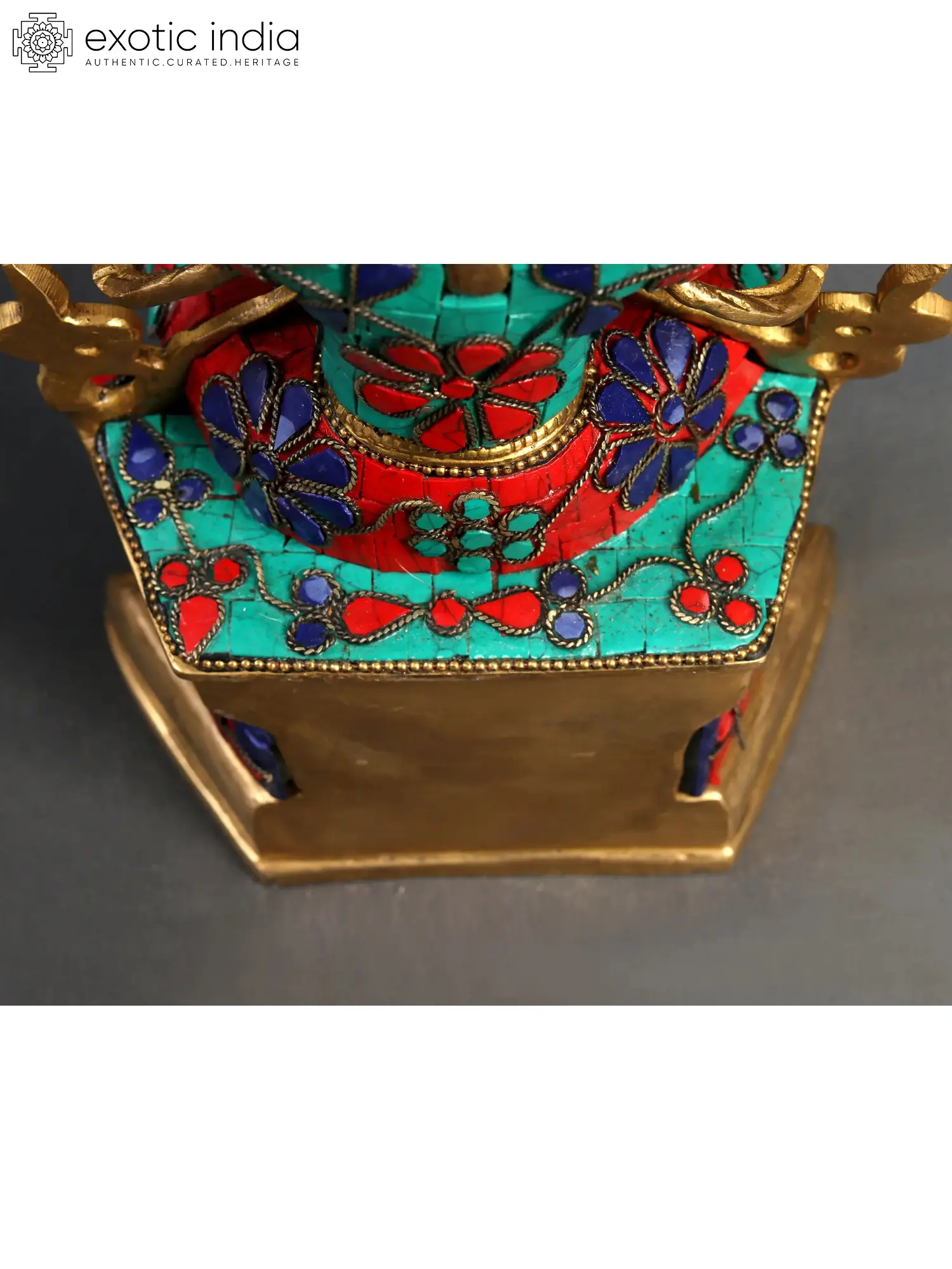 The richness of this sculpture is amplified by the vibrant inlay work that graces the deity's robes. Carefully set turquoise and lapis lazuli, interspersed with striking red stones, create a visual symphony. Turquoise, often associated with protection and healing, and lapis lazuli, symbolizing wisdom and spiritual insight, are stones that have been valued for millennia in spiritual and cultural practices. The intricate patterns, reminiscent of celestial flowers and cosmic designs, evoke the beauty and perfection of the enlightened realm that Maitreya will usher in. The use of these precious materials not only enhances the aesthetic appeal but also imbues the statue with symbolic depth, connecting it to the earth's natural treasures and the celestial heavens.