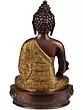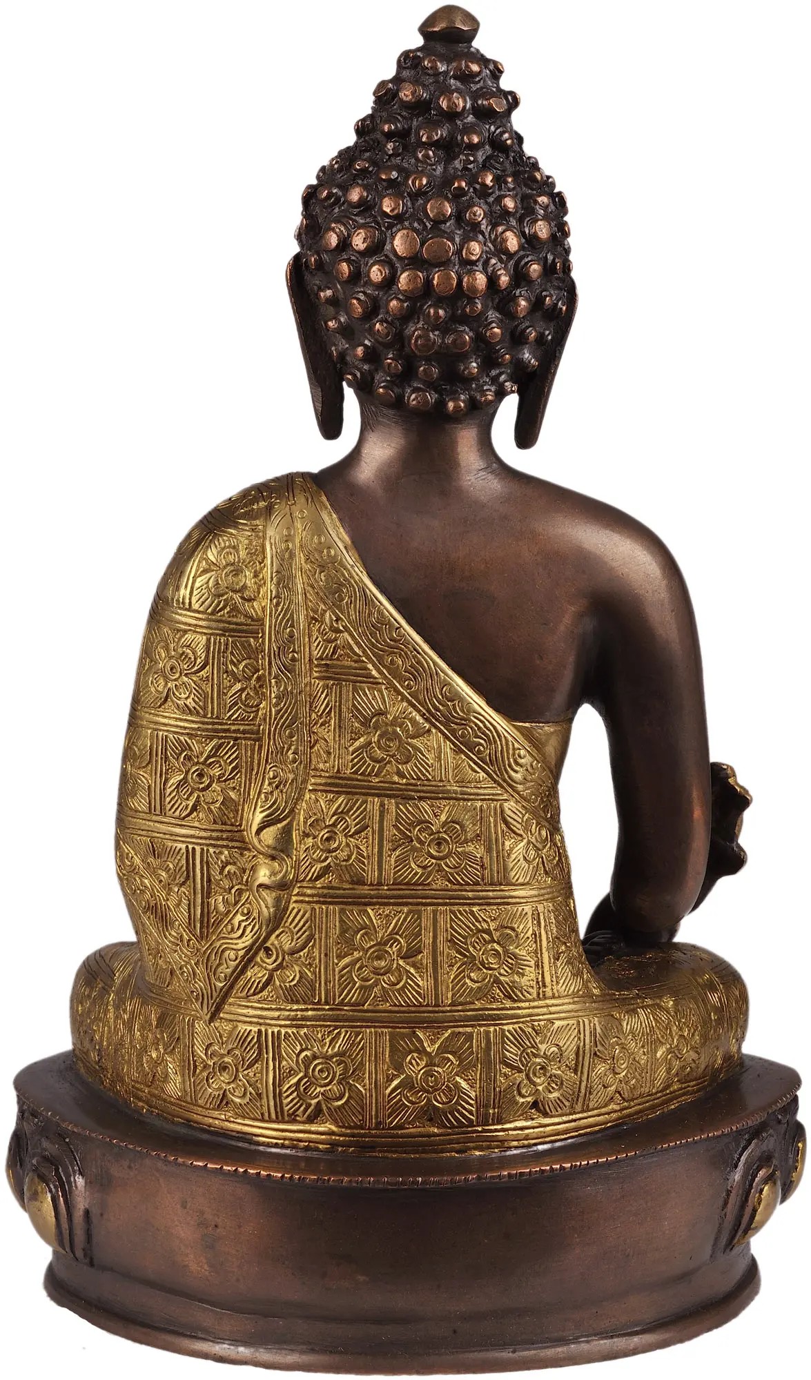 Here we can see the brass statue of Bhaisajyguru depicted in the same way as the popular iconography goes. He rests his left hand on his lap, and his upwardly opened palm holds a beggar’s bowl. In the bowl lies a fruit from the healing herb he is holding in his right hand. The plant is a myrobalan plum, a variety that is used as a laxative, or purgative. The highlight of the sculpture is the intricately carved robe worn by Bhaisajyaguru.