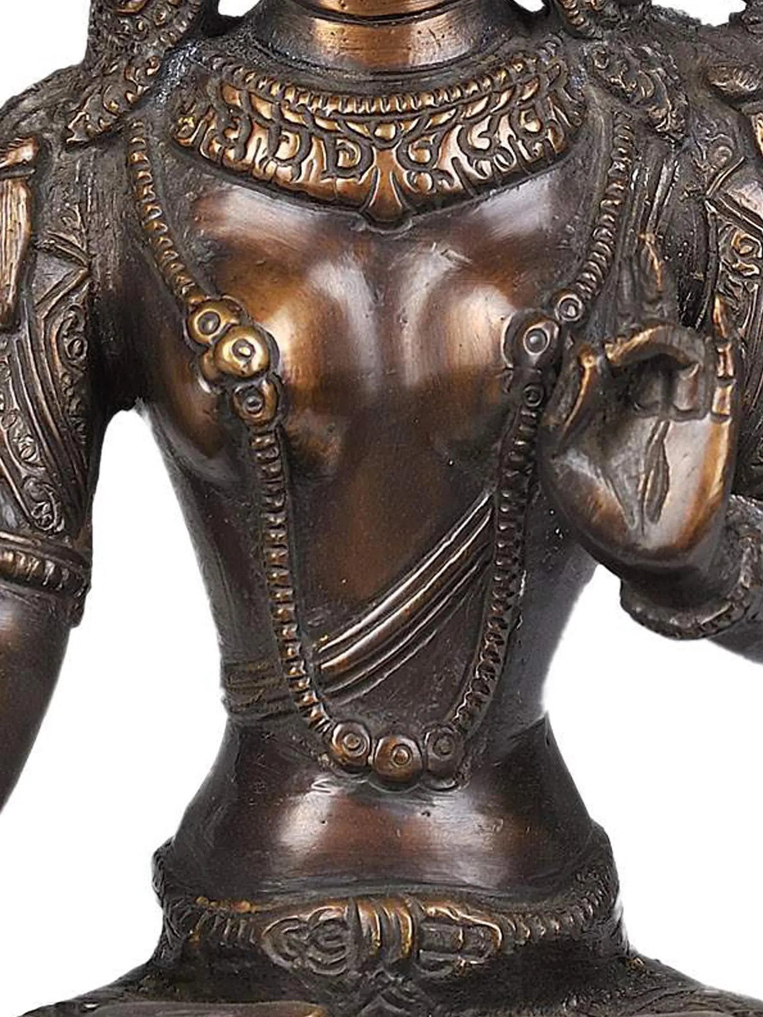 This exquisite brass statue captures the serene presence of White Tara, a revered bodhisattva in Tibetan Buddhism. She is the feminine manifestation of compassion, embodying wisdom, longevity, and the power to overcome obstacles. Her tranquil expression, with eyes softly closed, invites contemplation and a sense of inner peace. Crafted by skilled artisans in India, this piece is a testament to centuries of traditional metalworking artistry. ––––––––––––––––––