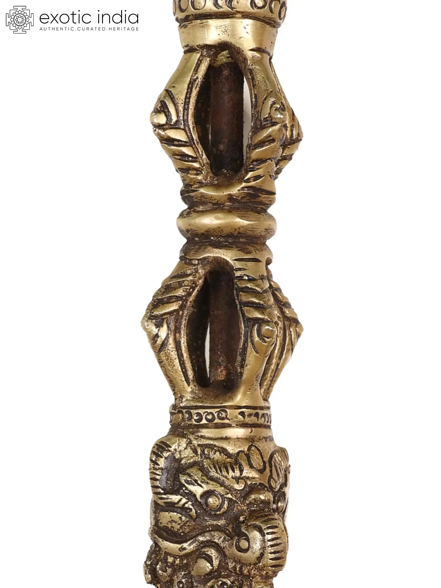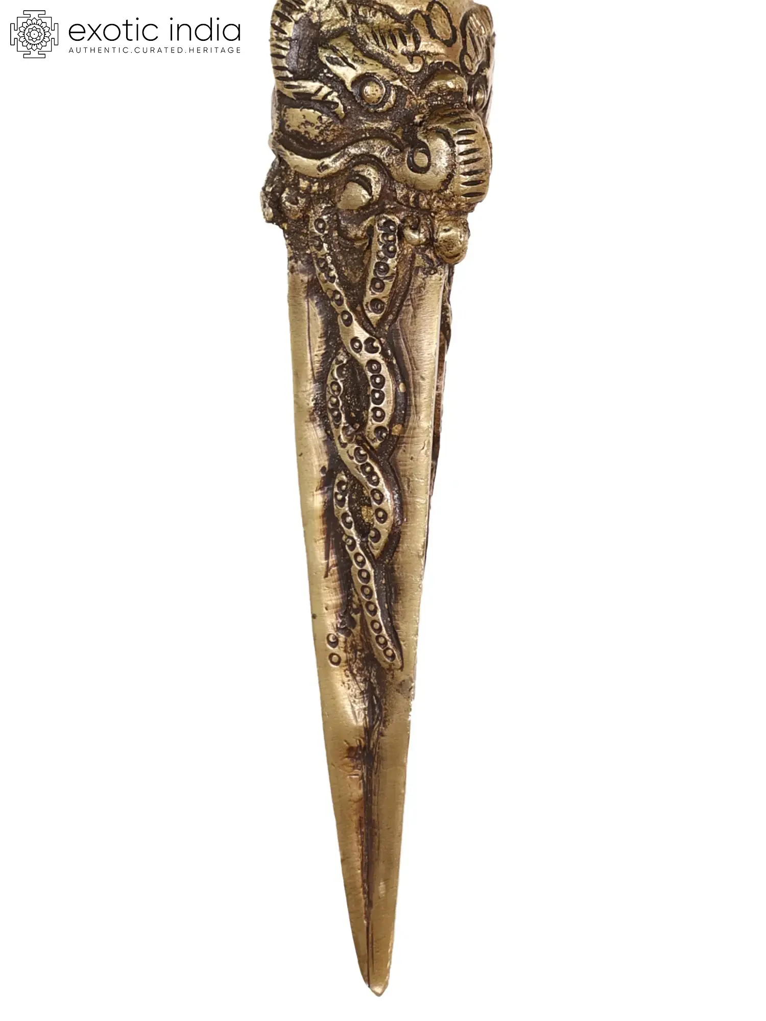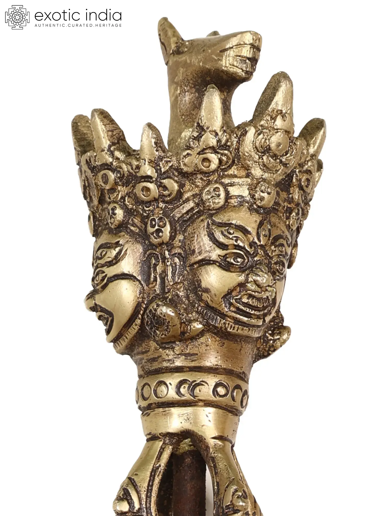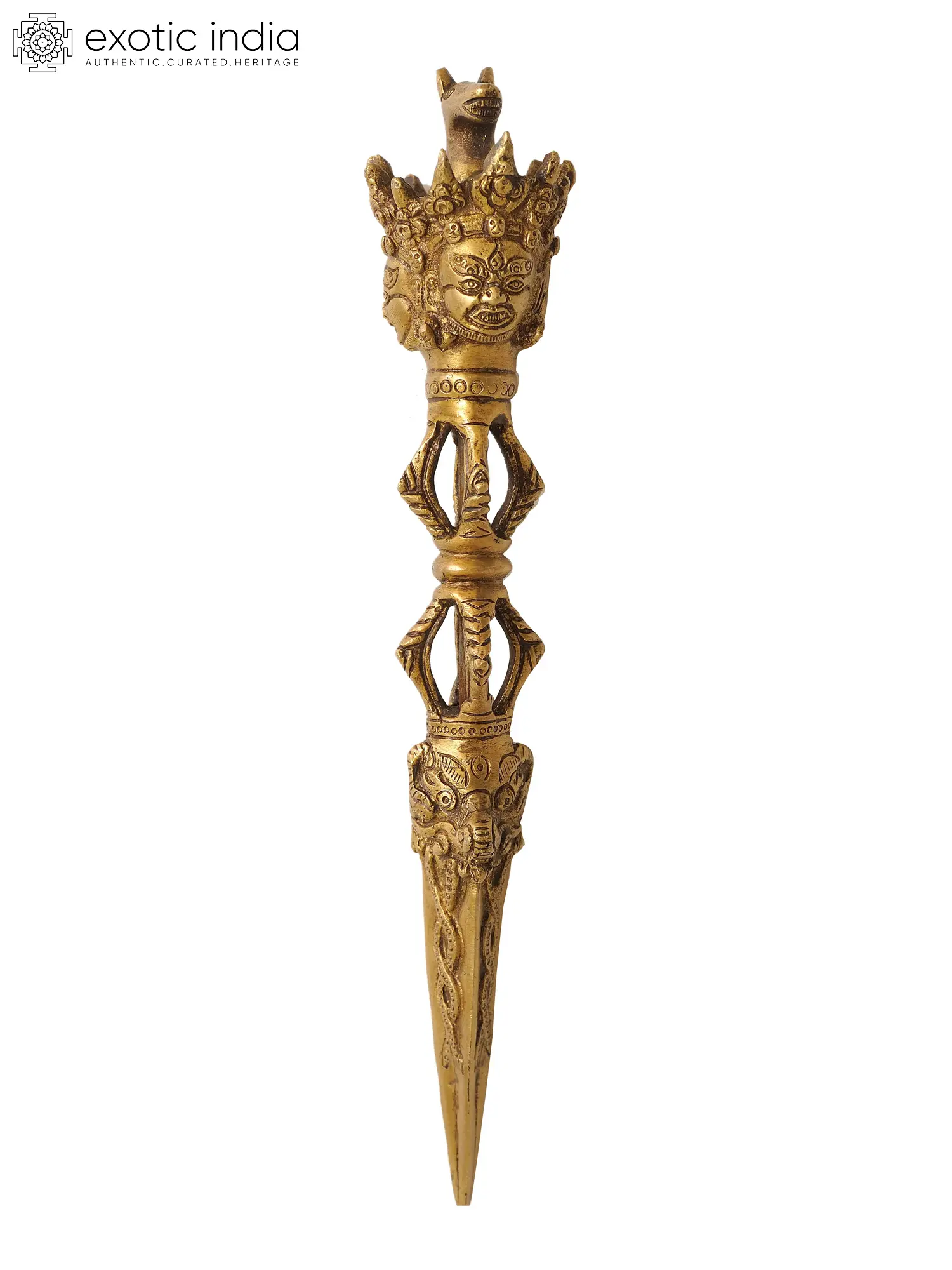 Phurpas are triangular daggers with short blades. It is employed in ceremonies to expel demonic entities or ailments, with dharani written on the hilt or the base of the blade. This Tibetan Buddhist Hayagriva Phurpa in Brass is a sacred ritual object known as a Phurpa or Phurbu. This three-sided ritual dagger typically features a fearsome deity, such as Hayagriva, on its hilt. Its iconography represents the triumph of wisdom and compassion over ignorance and malevolent forces. By consecrating and thrusting the Phurpa into a specific area or object, it is believed to purify and protect, dispelling negativities and invoking the deity's blessings for spiritual transformation.