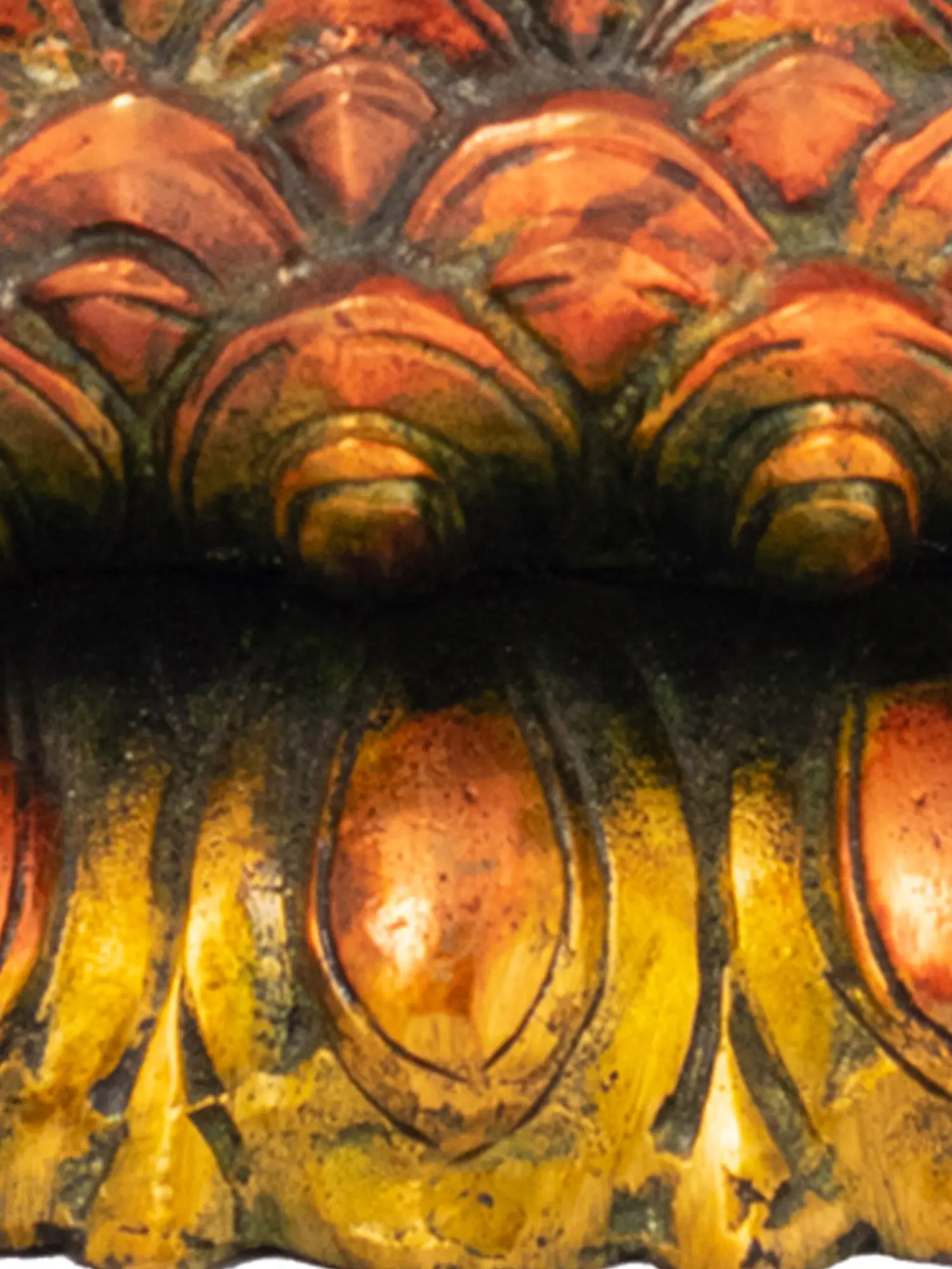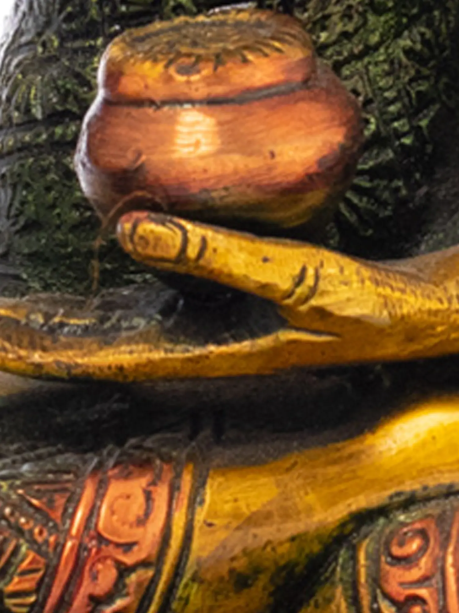 Behold this exquisite brass statue, a testament to the enduring wisdom and profound peace embodied by Lord Buddha. Seated in the classic lotus posture (Padmasana), the figure emanates an aura of tranquil contemplation. His gentle gaze, downcast in meditation, invites introspection and a sense of calm into any space. The urna, a symbolic dot on his forehead, represents his third eye, a divine insight that perceives the truth of reality. The elongated earlobes are a reminder of his princely past, shedding material desires for spiritual enlightenment. The meticulously crafted robe, rendered in a deep emerald green with intricate patterns and accented with copper hues, signifies the layers of illusion that the Buddha transcends. In his left hand, he cradles a begging bowl, a humble symbol of his ascetic life and his reliance on alms, demonstrating the importance of detachment and simplicity. His right hand rests gently on his knee, palm facing upwards, a gesture of generosity and nurturing.