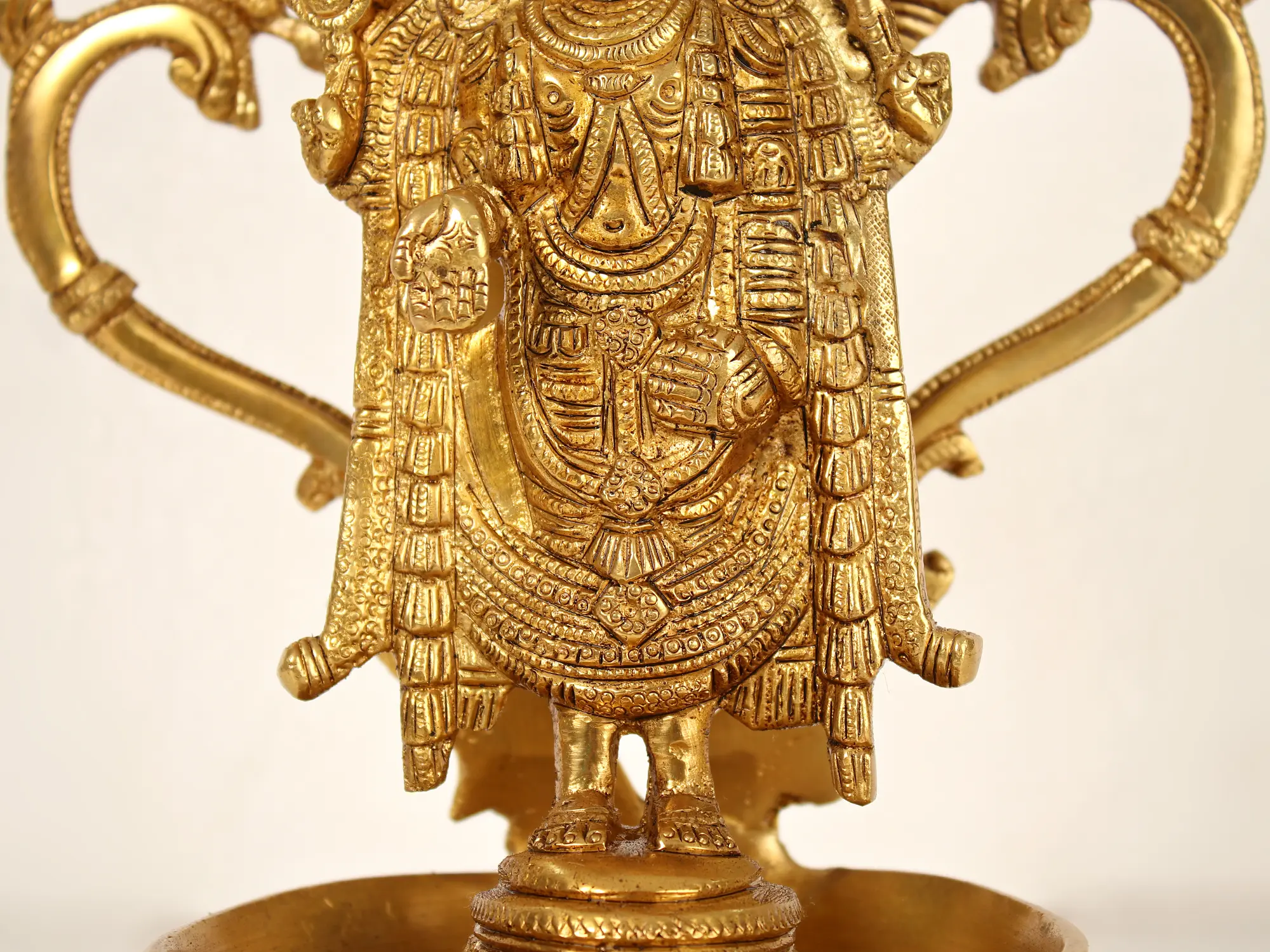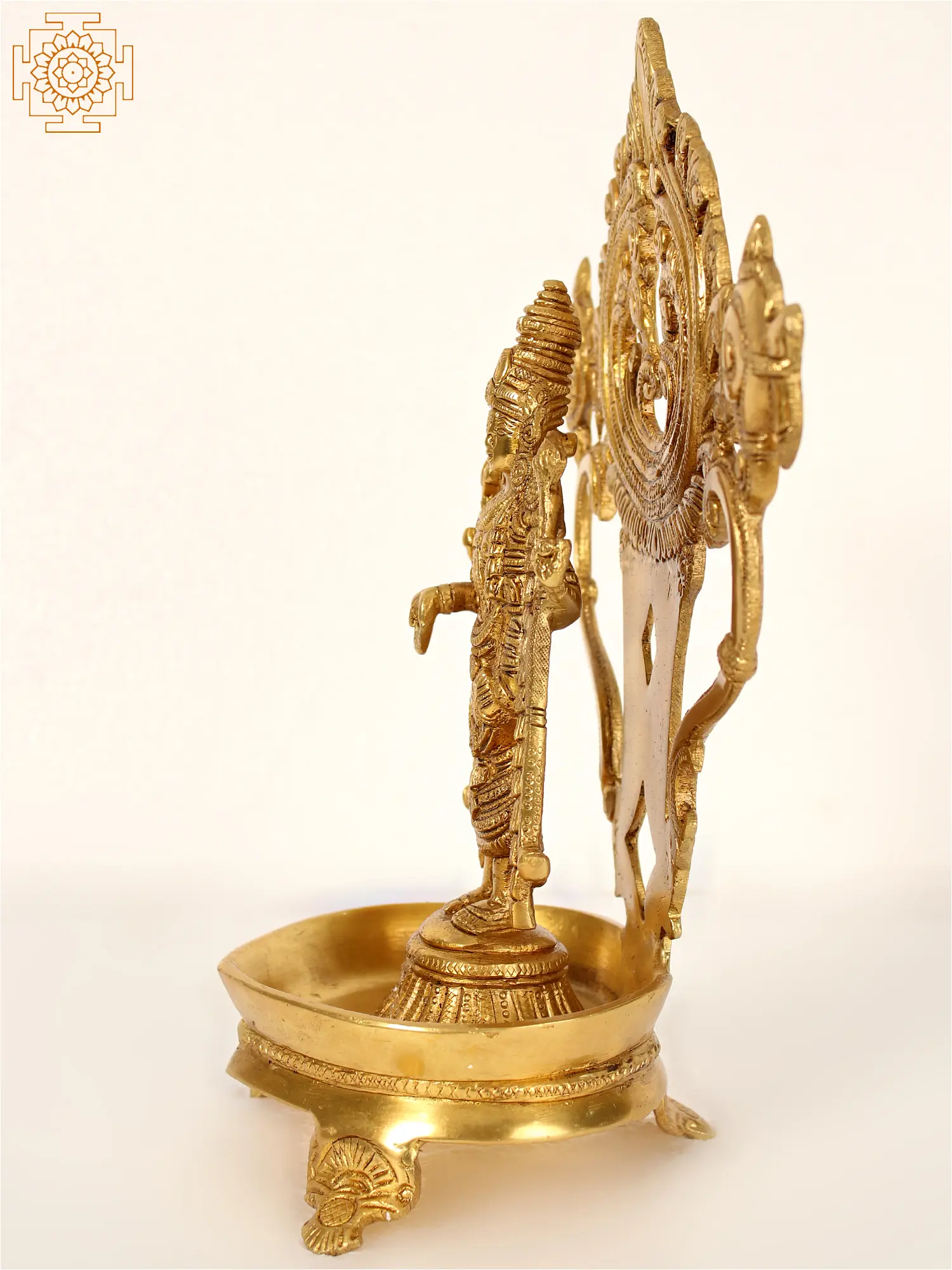 This brass lamp of Lord Venkateshwara (Tirupati Balaji) with the Vaishnava emblems of Panchajanya (conch) and Sudarshana Chakra (discus) is one of the greatest renderings of the splendour of the conserver, the almighty Vishnu. The dominant image of Lord Balaji blessing his worshippers standing with an intricate Prabhavali on this Lakshmideepam represents stability, longevity, and protection. It represents Lord Venkateshwara's divine shield, which protects his followers on their spiritual path and brings them serenity through trying times. You may invite Lord Venkateshwara's blessings into your life with this exquisite single-wick lamp, allowing his almighty grace and protection to guide you on your spiritual journey, giving you prosperity, tranquillity, and fulfilment.