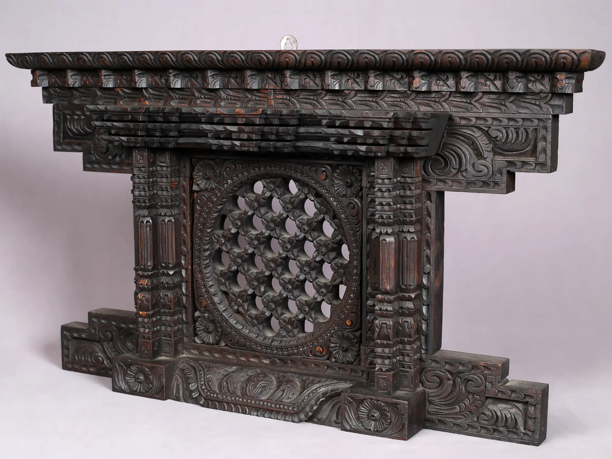 This wall hanging is a testament to the dedication and meticulous skill of Nepalese woodcarvers. Each cut of the chisel, each delicate curve, is imbued with intention and reverence. The use of traditional tools and techniques ensures that this piece carries the authentic spirit of its origin. Imagine the artisan, perhaps working by the soft light of a butter lamp, their hands moving with practiced grace to bring this vision to life. The dark hue of the wood, possibly aged or treated with natural dyes, adds a sense of gravitas and timeless beauty, grounding the piece and allowing the intricate carvings to truly stand out.