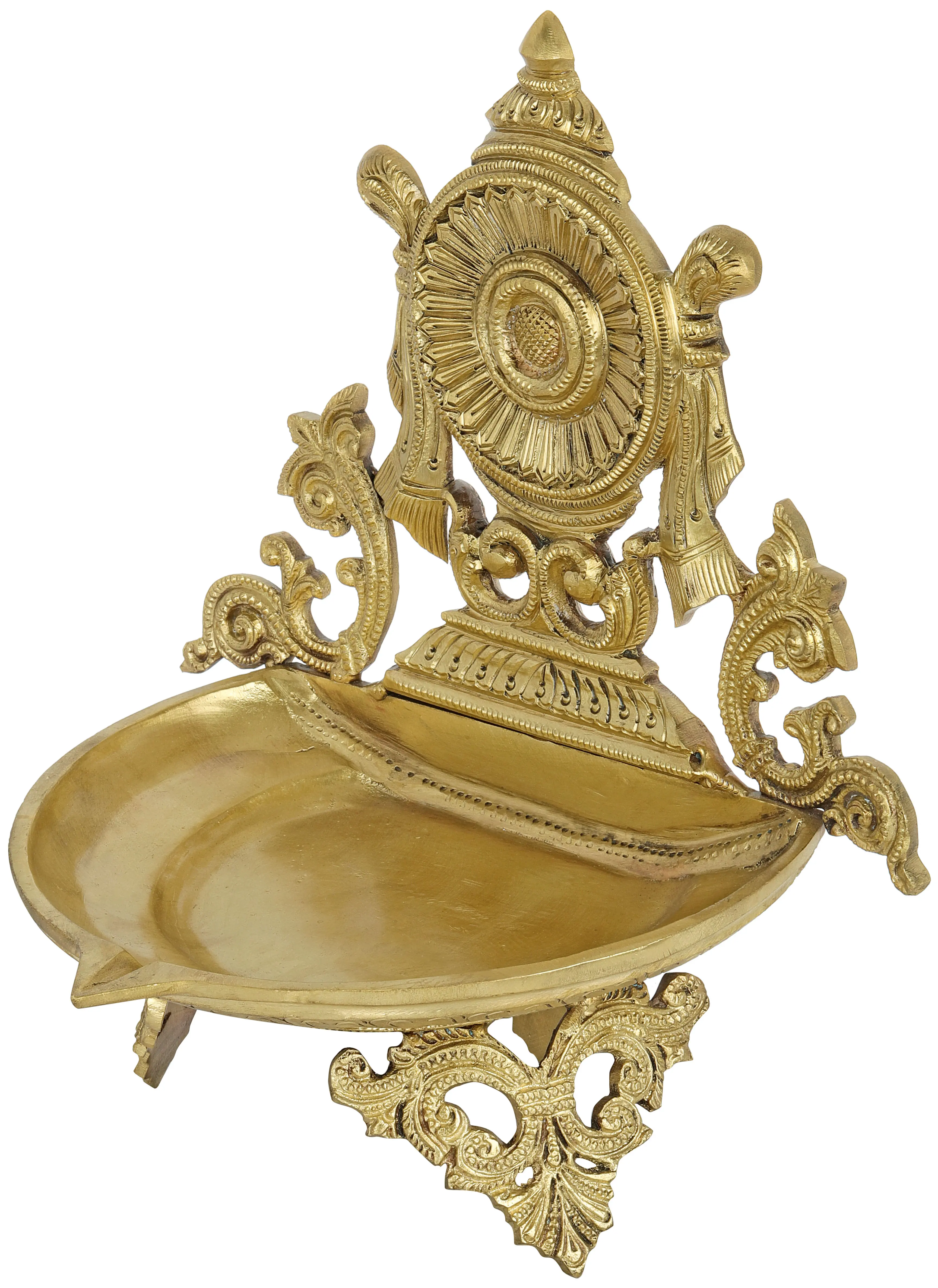 This bronze lamp in Hoysala style, with a central motif of Sudarshana Chakra, is a dedication to the beauty and splendor of the mighty weapon of Lord Vishnu. This lamp features a big oil basin and a single wick. It also comes with ornamental stands and seems to be a throne from a distance. Worshippers of Lord Vishnu believe that igniting this lamp would produce heavenly energy, attracting the Lord's attention and benefits.