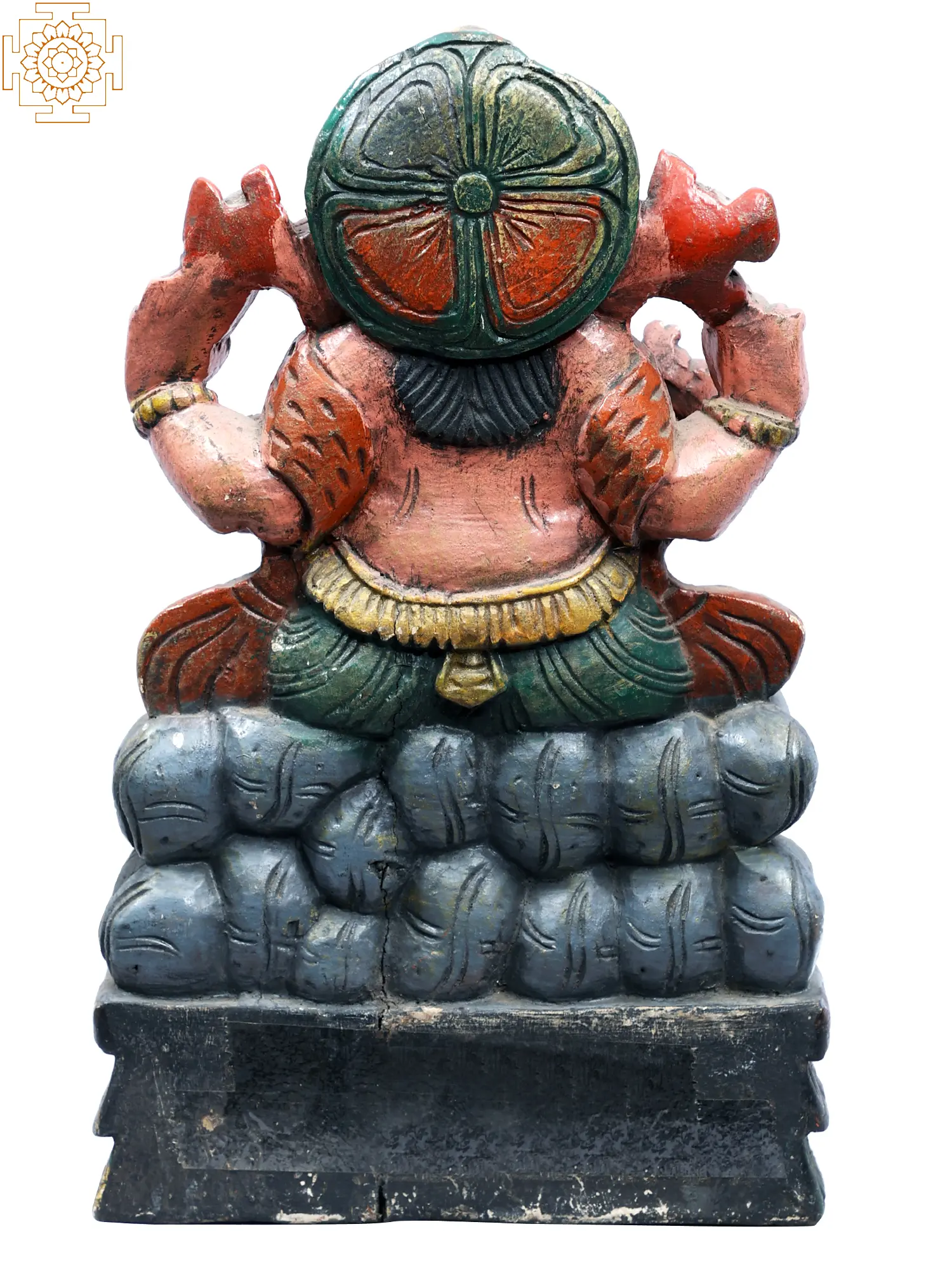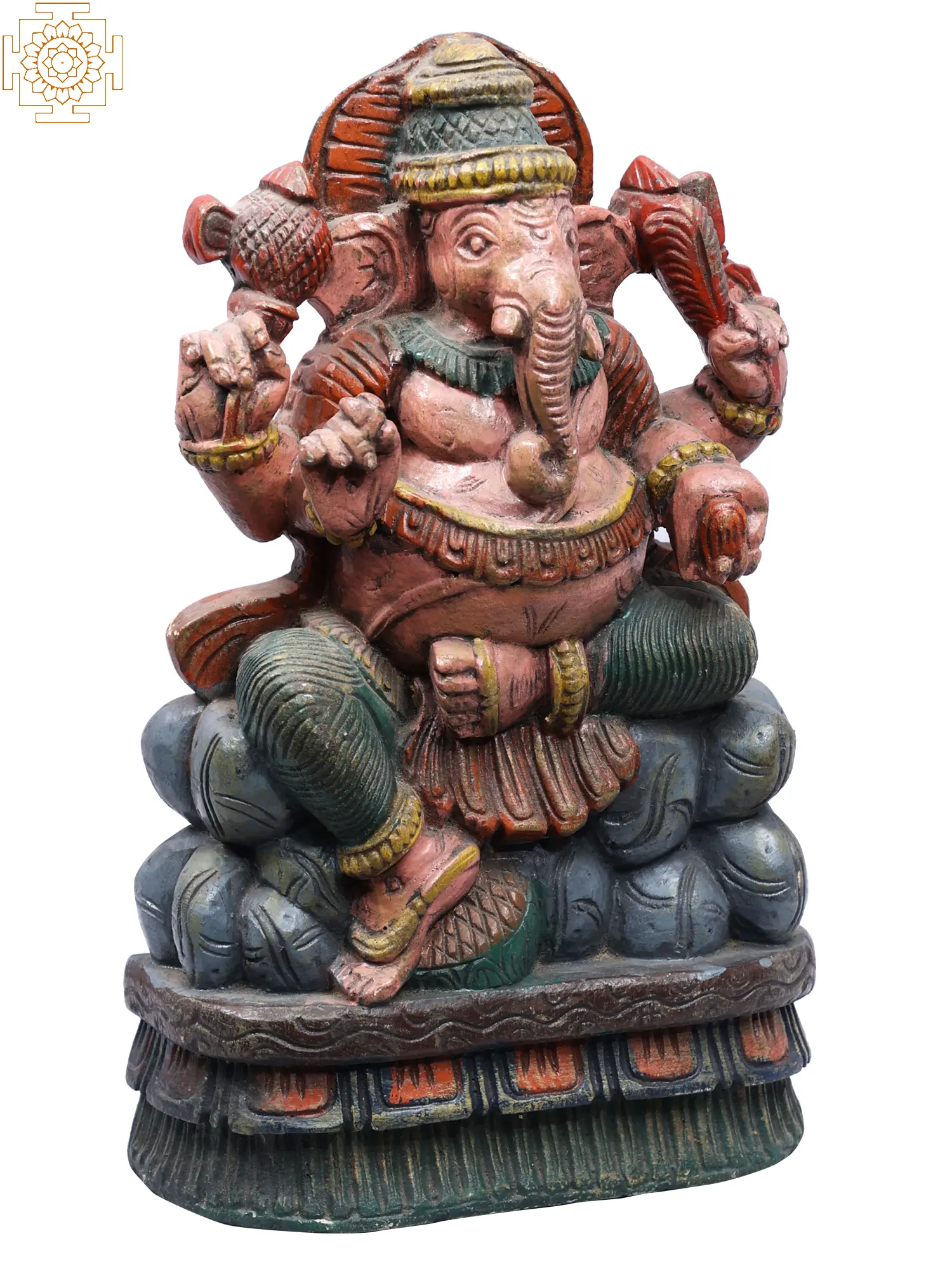 Invite the benevolent presence of Lord Ganesha into your home or sacred space with this exquisite wooden sculpture. Standing at an impressive height, this intricately carved representation of the Remover of Obstacles embodies the rich tapestry of Hindu mythology and spiritual devotion. Handcrafted from wood, this deity radiates an aura of warmth and authenticity, making it a focal point of contemplation and reverence. The vibrant, hand-painted details bring Lord Ganesha to life, showcasing his iconic elephantine form and his divine four arms, each carrying symbolic significance. In one hand, he often holds his beloved modak (a sweet dumpling), representing the rewards of spiritual practice. Another hand may hold a lotus flower, symbolizing purity and enlightenment, while the others are often in the gesture of bestowing blessings or dispelling fear. The serene yet powerful expression on his face conveys his role as the granter of success and the protector of endeavors.