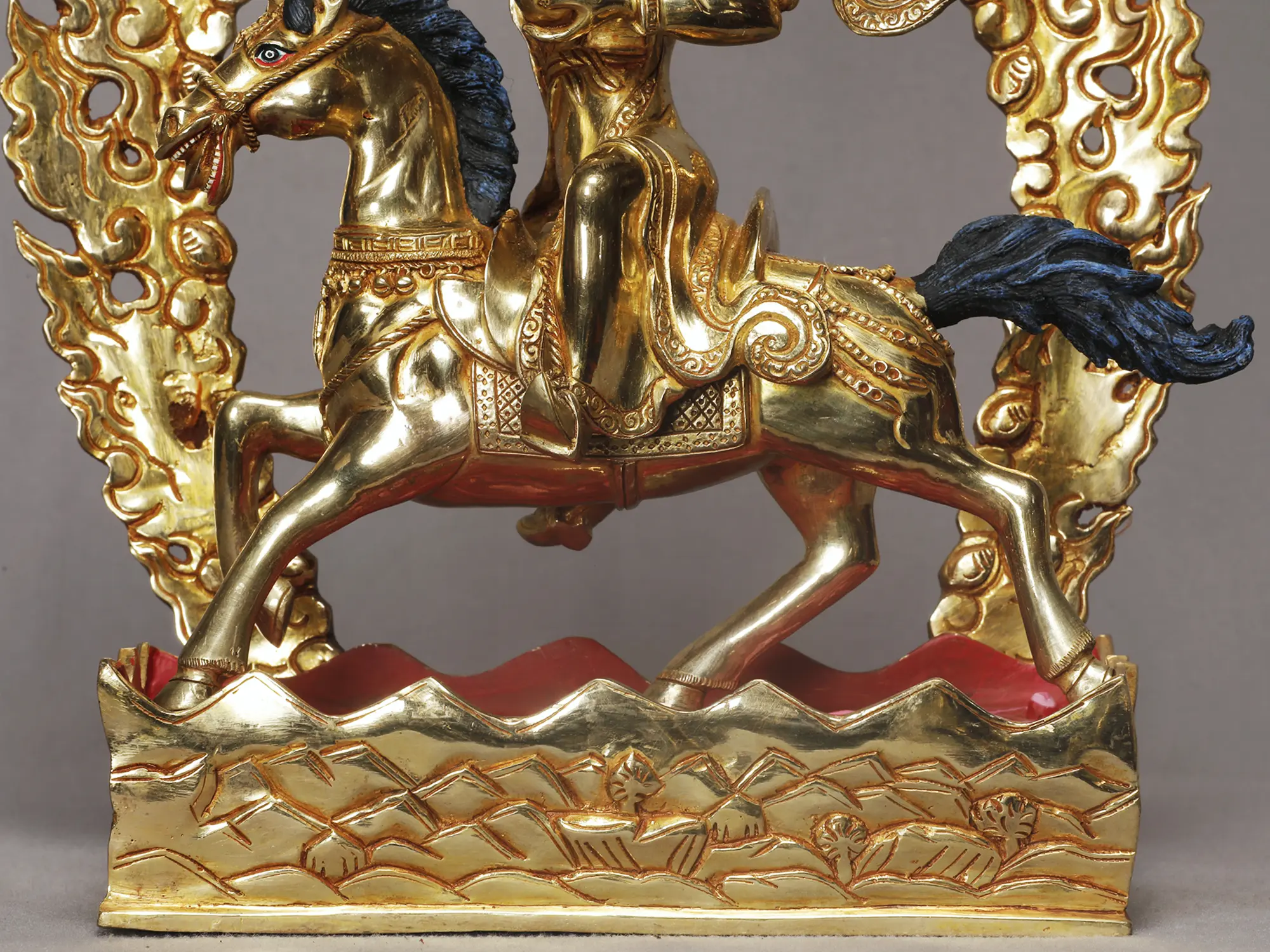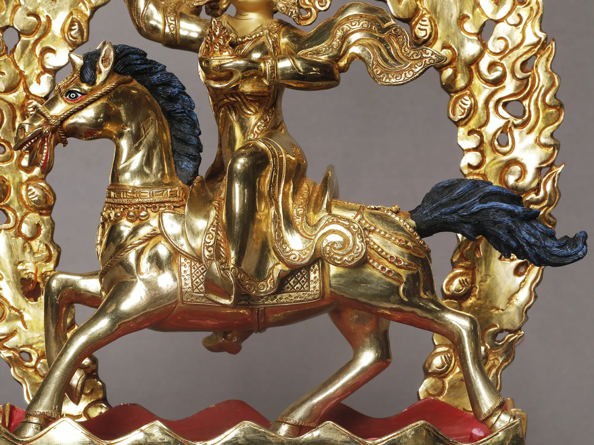 Achi Chokyi Drolma is often depicted riding a mule, symbolizing her swift and tireless assistance to those in need. Her image includes various attributes, such as a mirror, a jewel, and a lotus, representing wisdom, compassion, and enlightened activity. In Tibetan Buddhism, Achi Chokyi Drolma holds a special place as a compassionate and accessible deity, embodying the wisdom and warmth of a benevolent grandmother guiding her spiritual children on their journey.