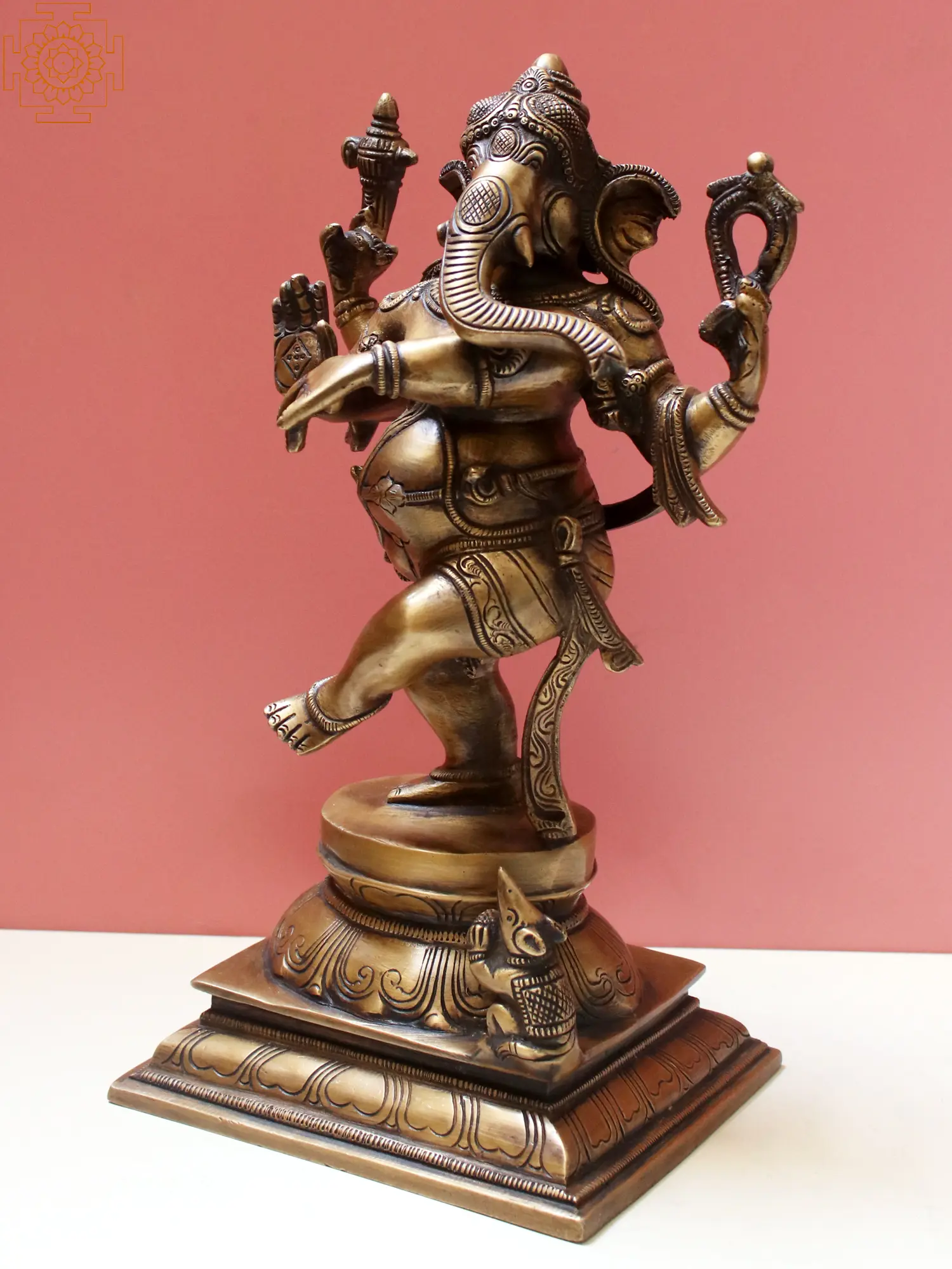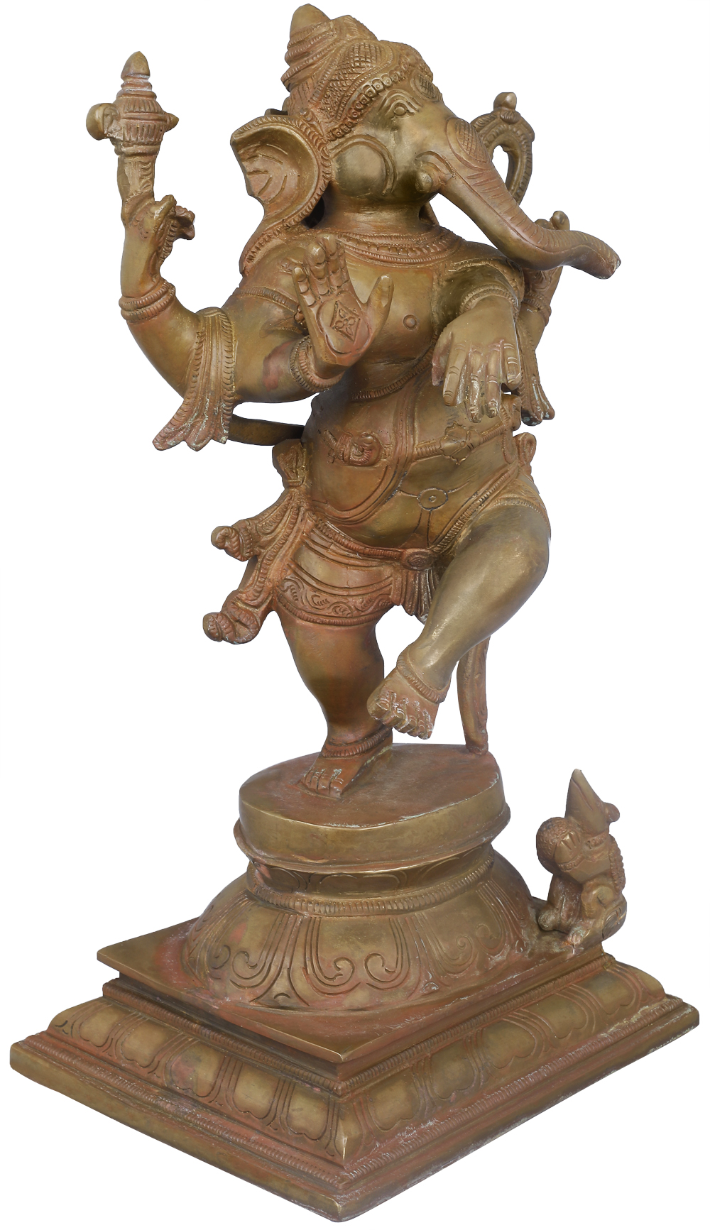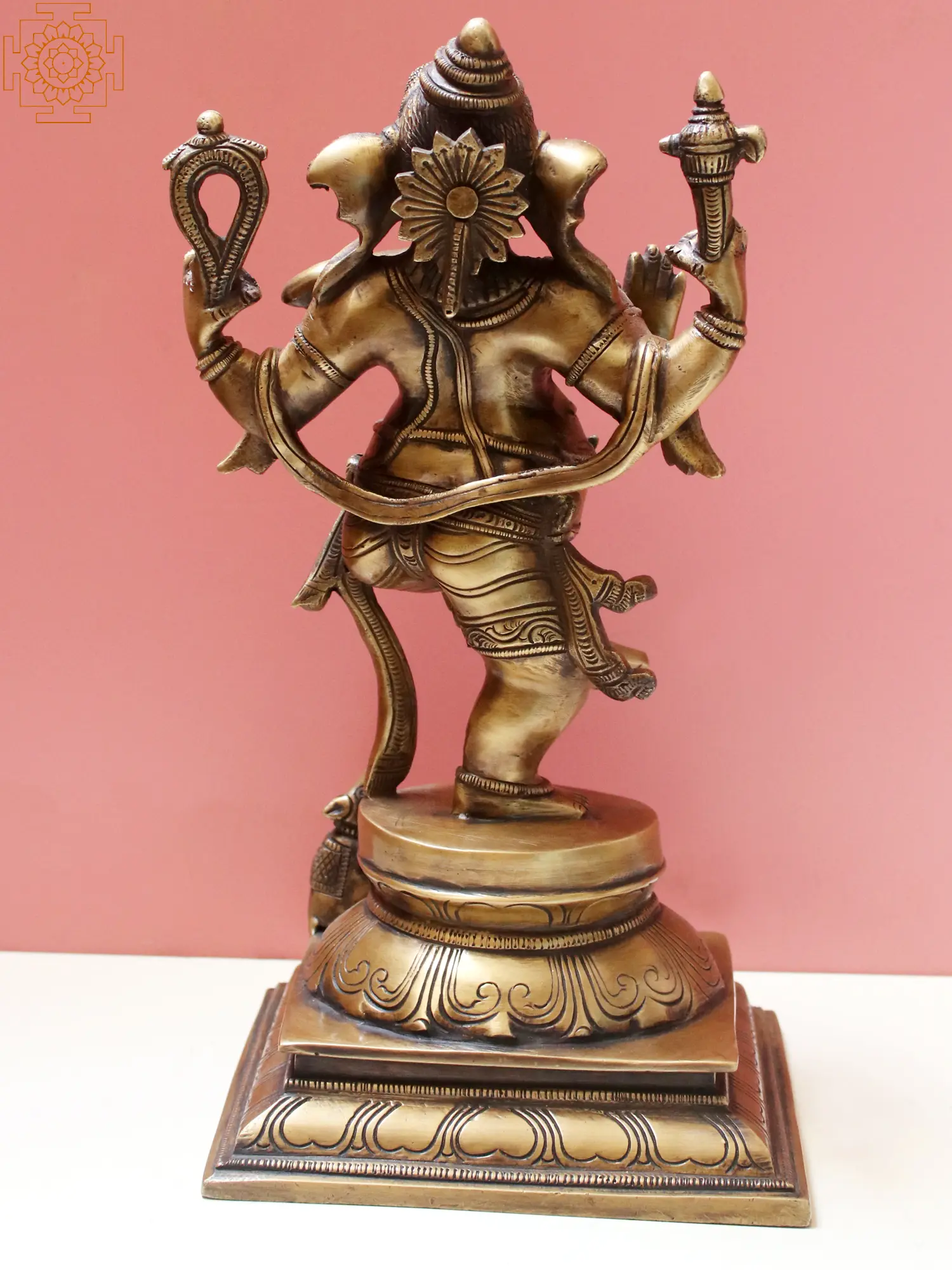 Lord Ganesha is the most widely loved baala-deva (child-deity) of the Hindu pantheon. His childlike qualities, such as innocence and wisdom and generosity with blessings, endear Him to the truly devoted. The murti that you see on this page is sculpted from pure brass and depicts the Lord in dance motion.