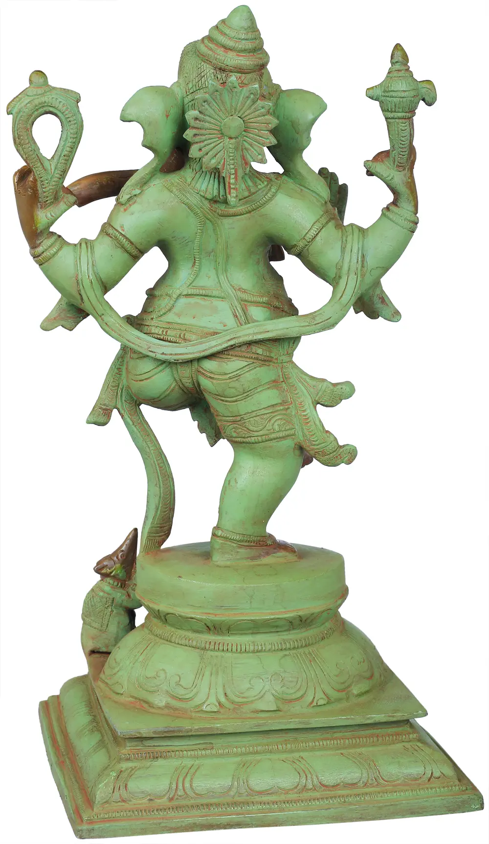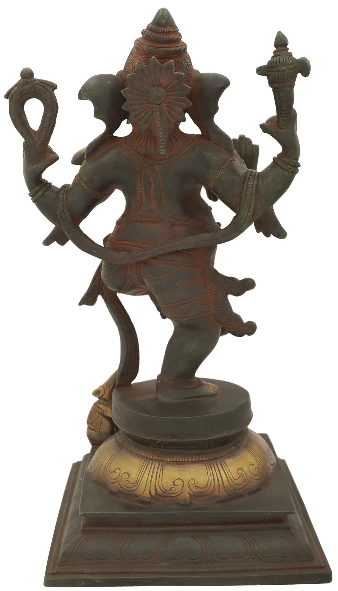 This dancing Ganesha murti comes in a wide variety of colour finish. Some of them like the Antique Brass and the Gold are monotone, while Sindoori and Patina are a striking bitone.