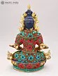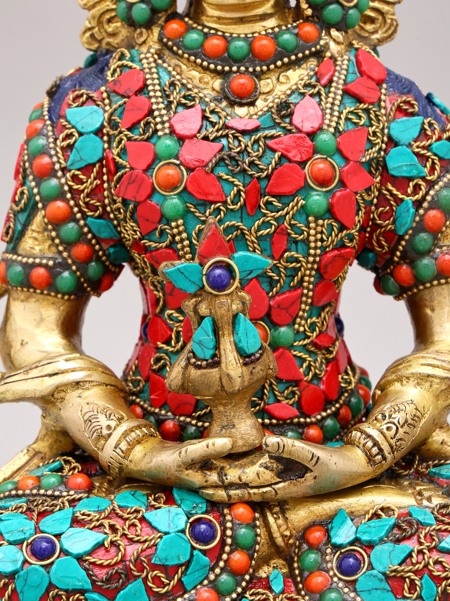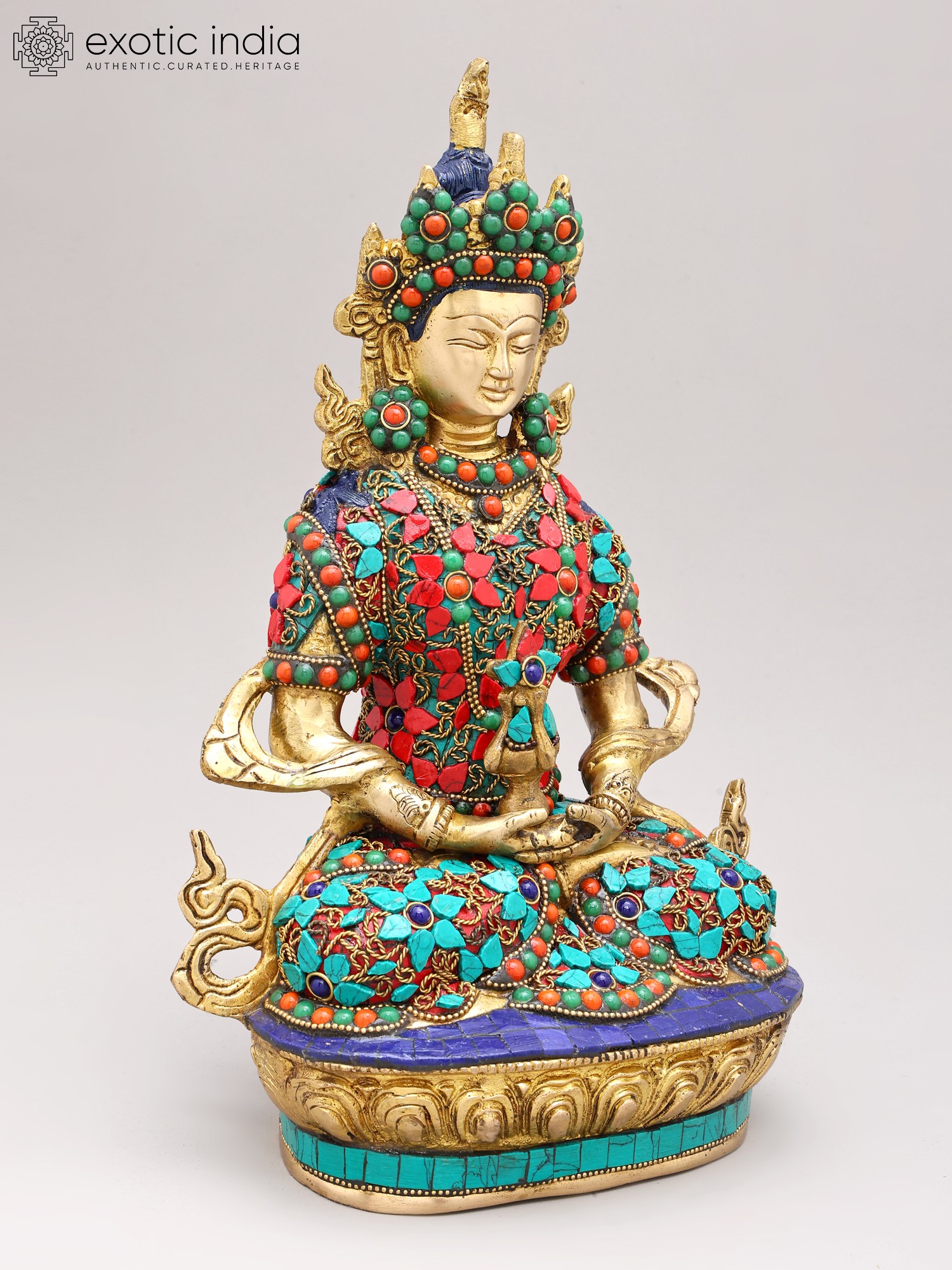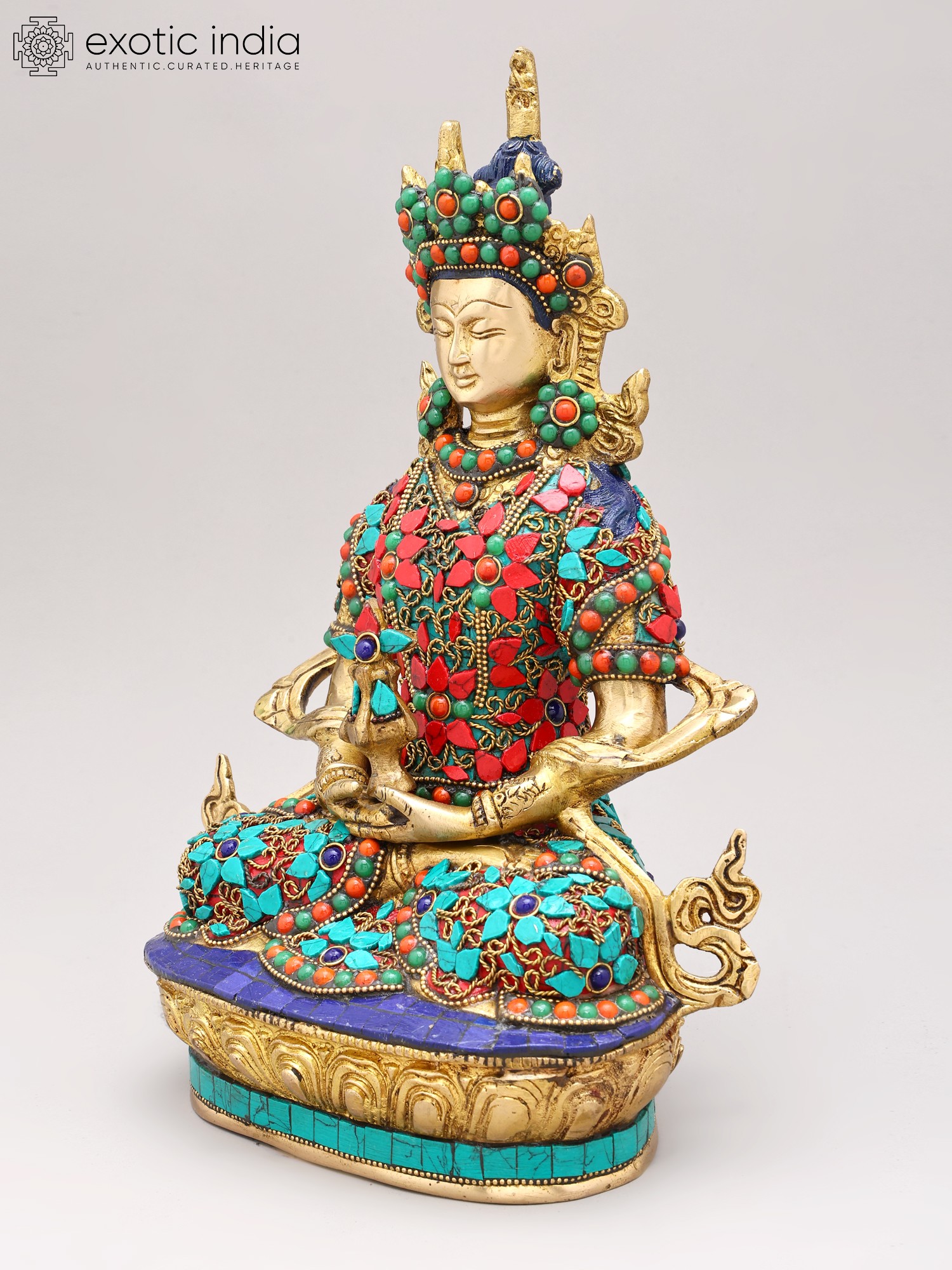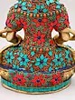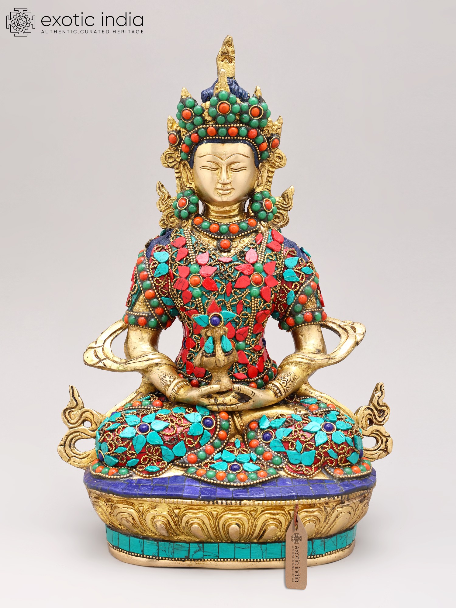 The artistry of this sculpture is evident in its intricate inlay work, a testament to the rich heritage of Indian craftsmanship. Vibrant turquoise and coral stones are meticulously set into the brass, forming a dazzling mosaic that adorns the Buddha's regal attire. These precious materials are not merely decorative; they hold profound symbolic meaning in Buddhist iconography. Turquoise, often associated with the sky and the divine, represents wisdom and healing, while coral, symbolizing life and vitality, signifies overcoming obstacles. The combination evokes a sense of spiritual richness and the auspicious qualities of Amitabha himself.