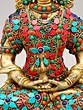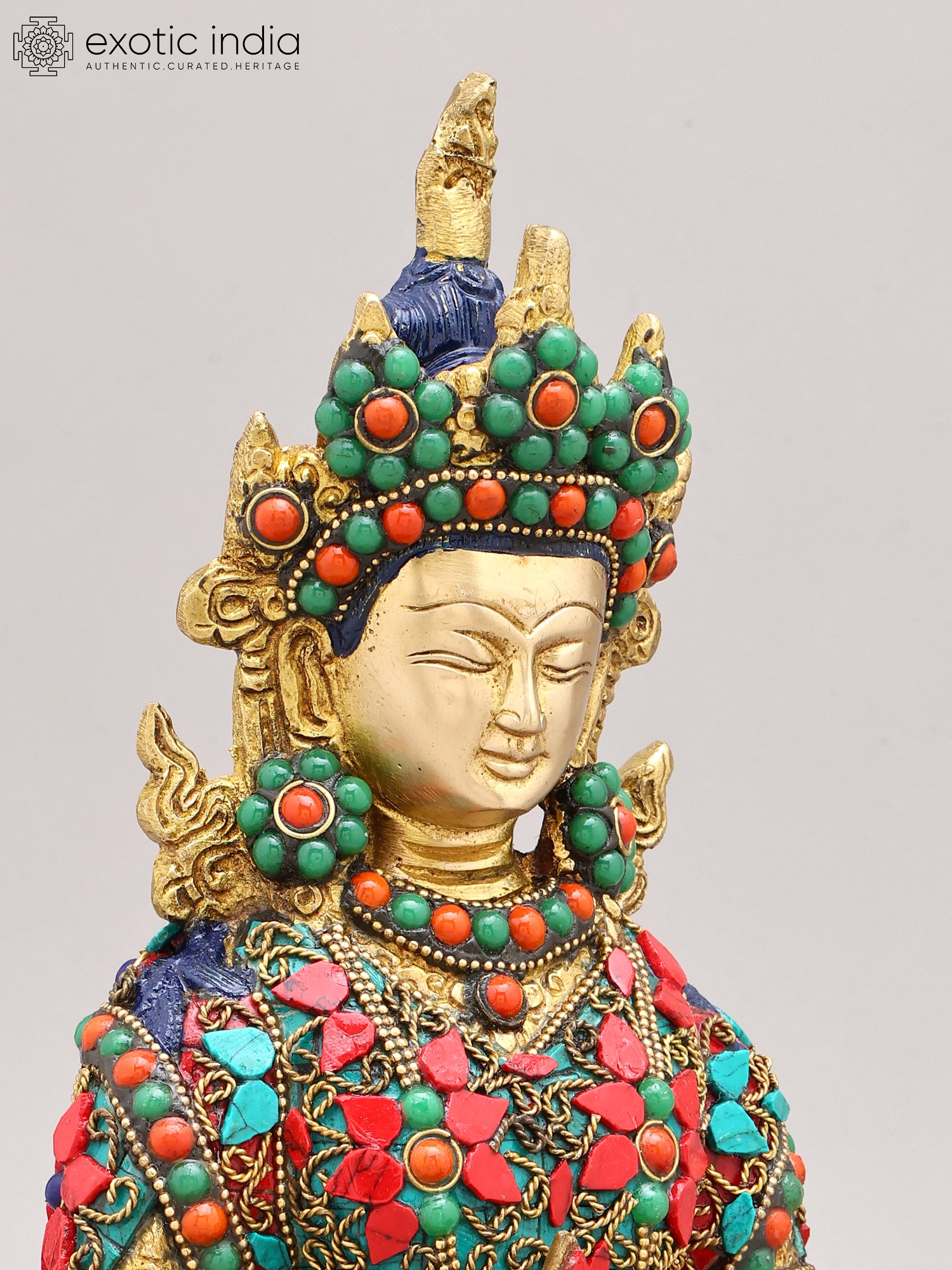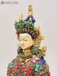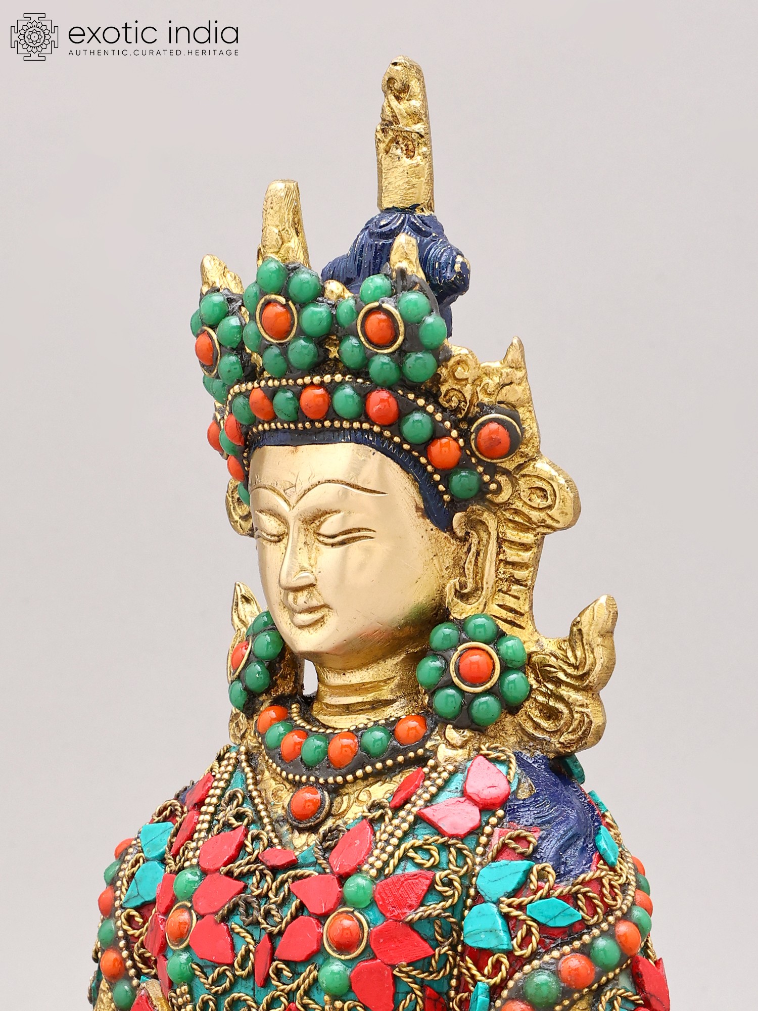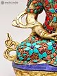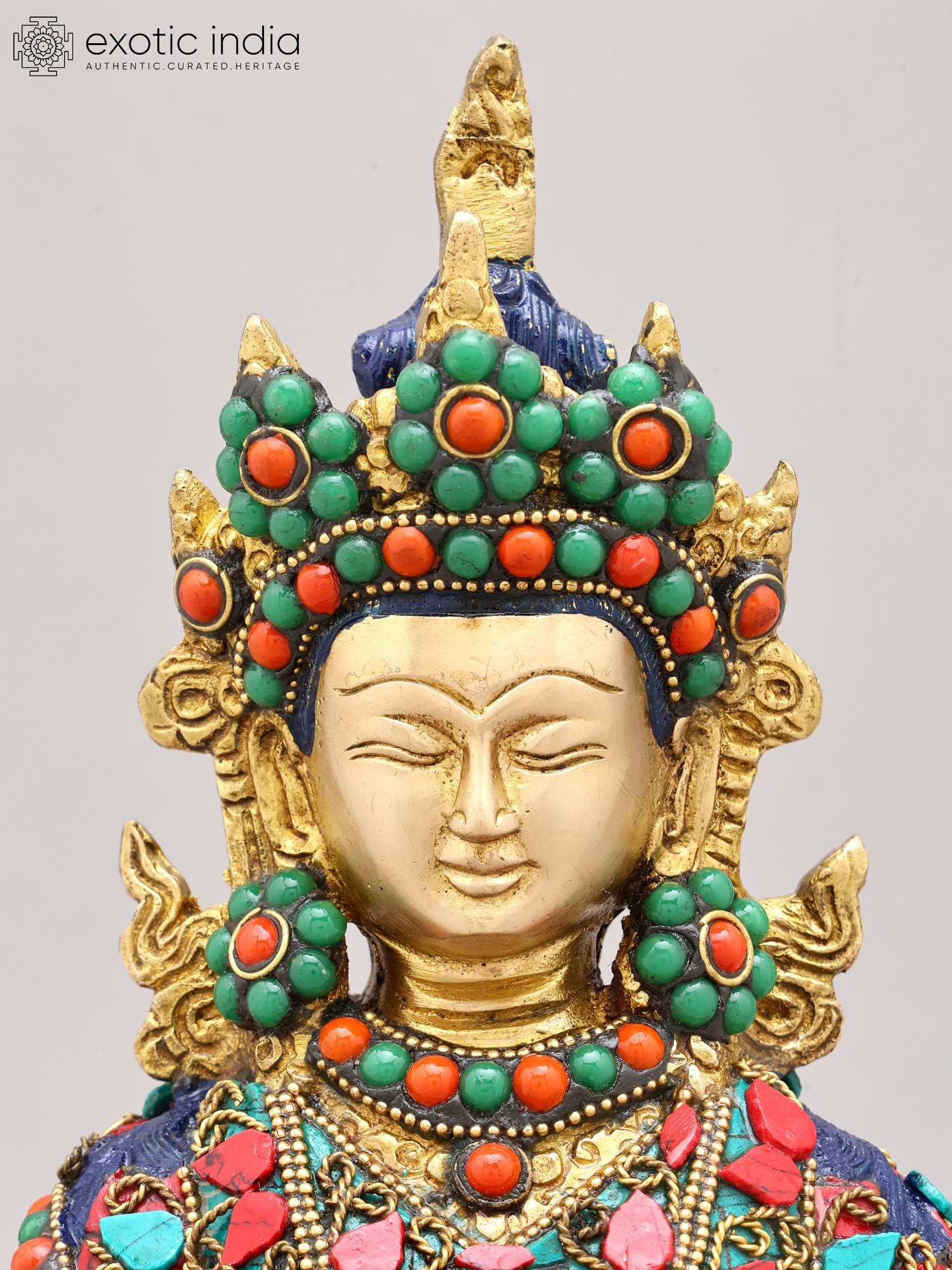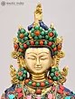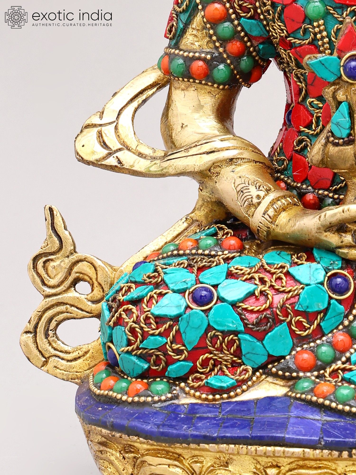 The artistry of this sculpture is evident in its intricate inlay work, a testament to the rich heritage of Indian craftsmanship. Vibrant turquoise and coral stones are meticulously set into the brass, forming a dazzling mosaic that adorns the Buddha's regal attire. These precious materials are not merely decorative; they hold profound symbolic meaning in Buddhist iconography. Turquoise, often associated with the sky and the divine, represents wisdom and healing, while coral, symbolizing life and vitality, signifies overcoming obstacles. The combination evokes a sense of spiritual richness and the auspicious qualities of Amitabha himself.