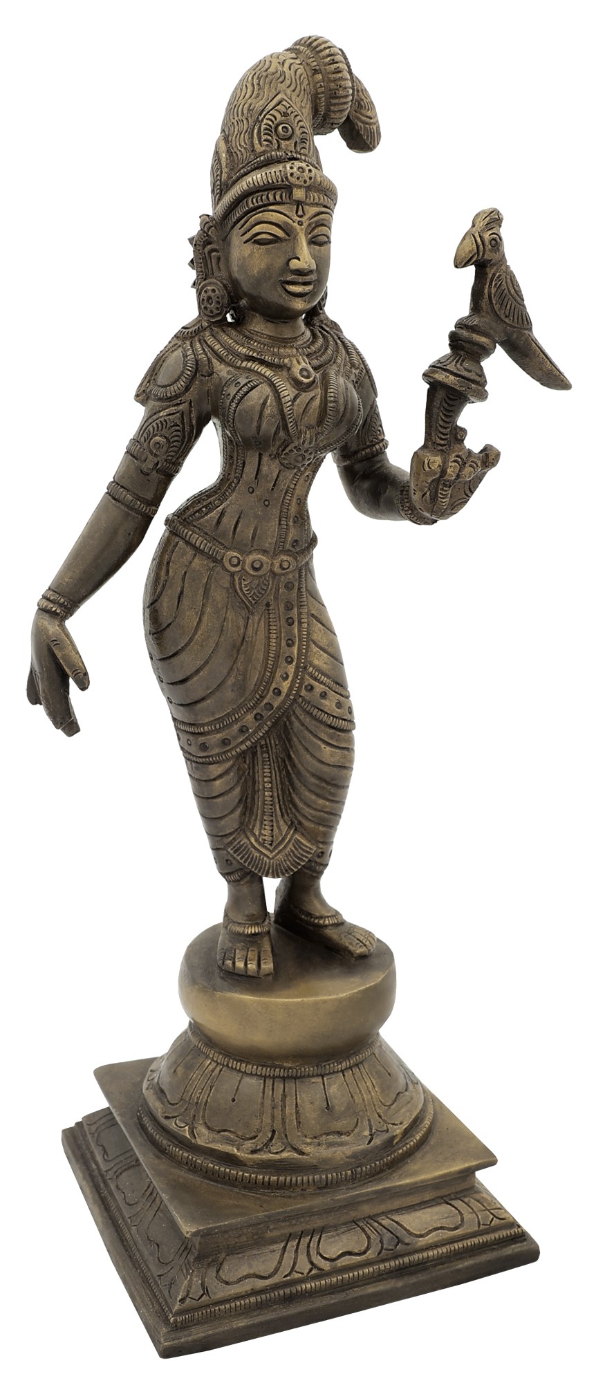 South Indian art is known for celebrating the beauty of the female body through intricately crafted artistic expressions of divine love. This fine sculpture of Andal Devi with Parrot, stands out as a great case in point. It’s a beautiful example of an age-old artistic tradition. Andal Devi, also revered as Goda Devi, holds her own among the best-loved poet-saints of the Tamil tradition.