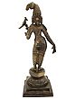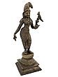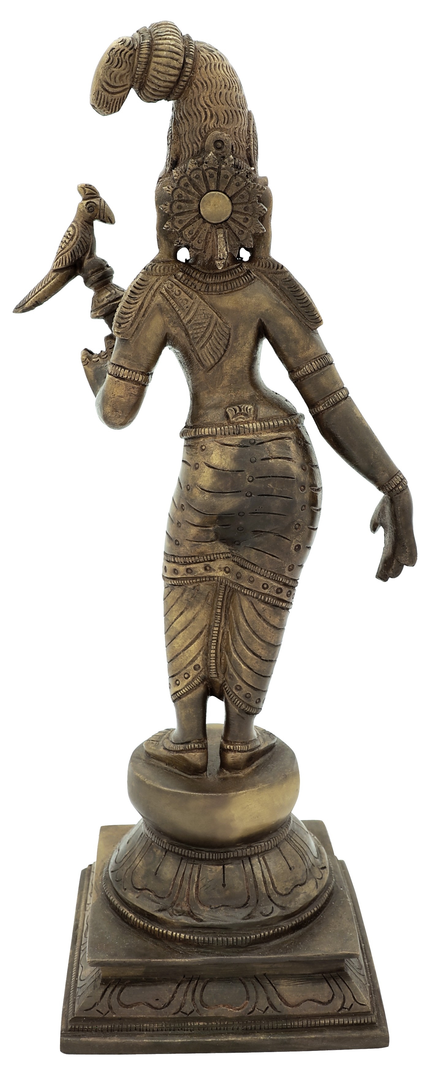 This incredibly lifelike statue of Andal Devi, portrays her standing in an Abhyanga posture. The pedestal, on which she is standing, is beautifully decorated with fine floral engravings. She has a traditional South Indian sari draped about her. Her right hand is held in Lolahasta's posture, a pose resembling the tail of a horse. She wears necklaces and an elaborate waistband. Her face, a thing of ethereal beauty, projects a look of calm contentment. A parrot is perched upon the lotus Andal Devi holds in her hand. Her parrot is believed to be a harbinger of good luck. Andal Devi was a follower of Vaishnavism Bhakti and the only female saint among the Twelve Alvars of South India. An ardent devotee of Lord Vishnu, Andal Devi is often compared to Mirabai, the famous devotee saint of North India, who sacrificed her life of material comforts to lose herself in the divine love for Krishna. Andal Devi lived in the 9thcentury, well over a thousand years ago, but even today, her unique iconography finds its own niche in various forms of Indian art, especially sculpture.