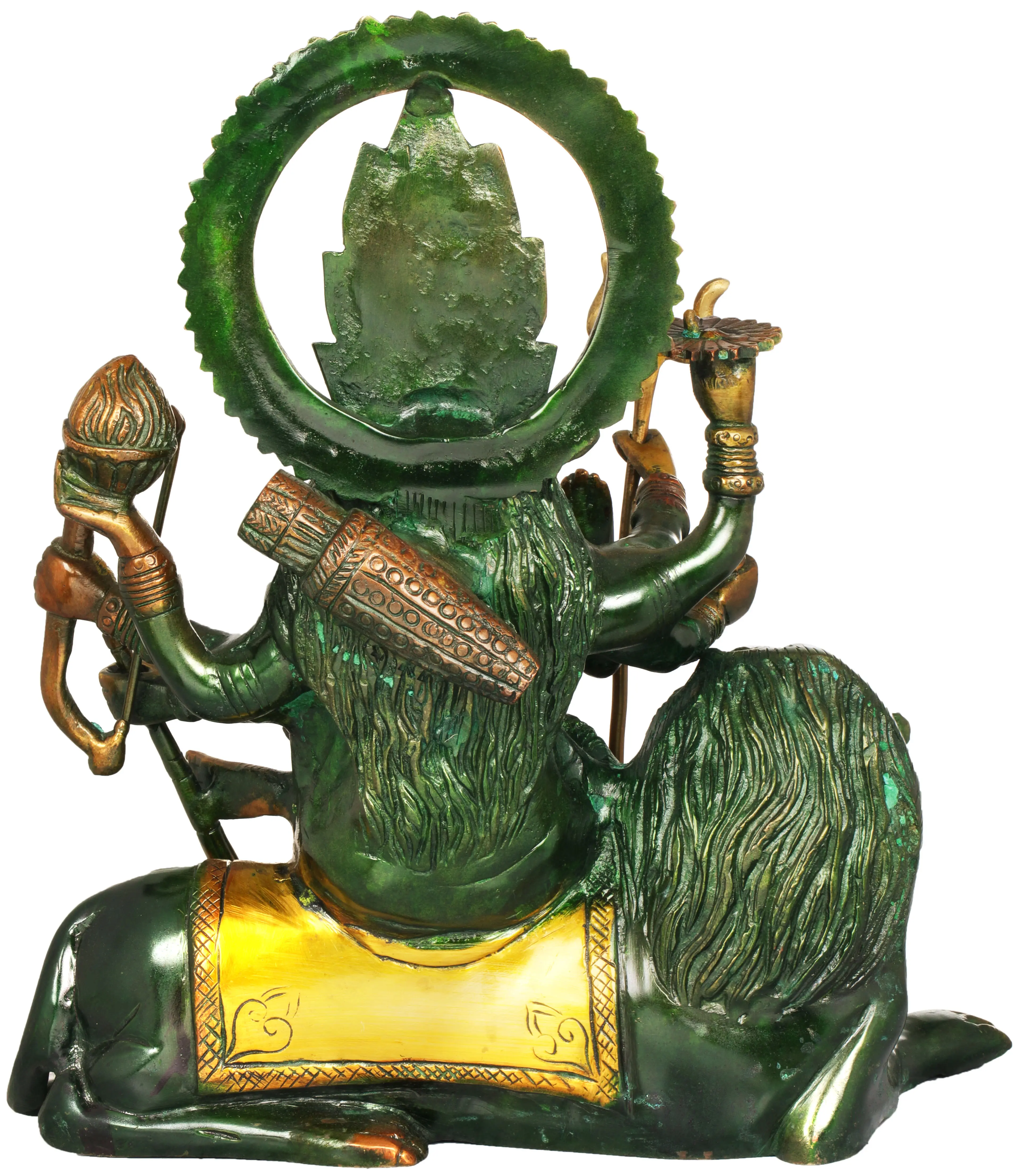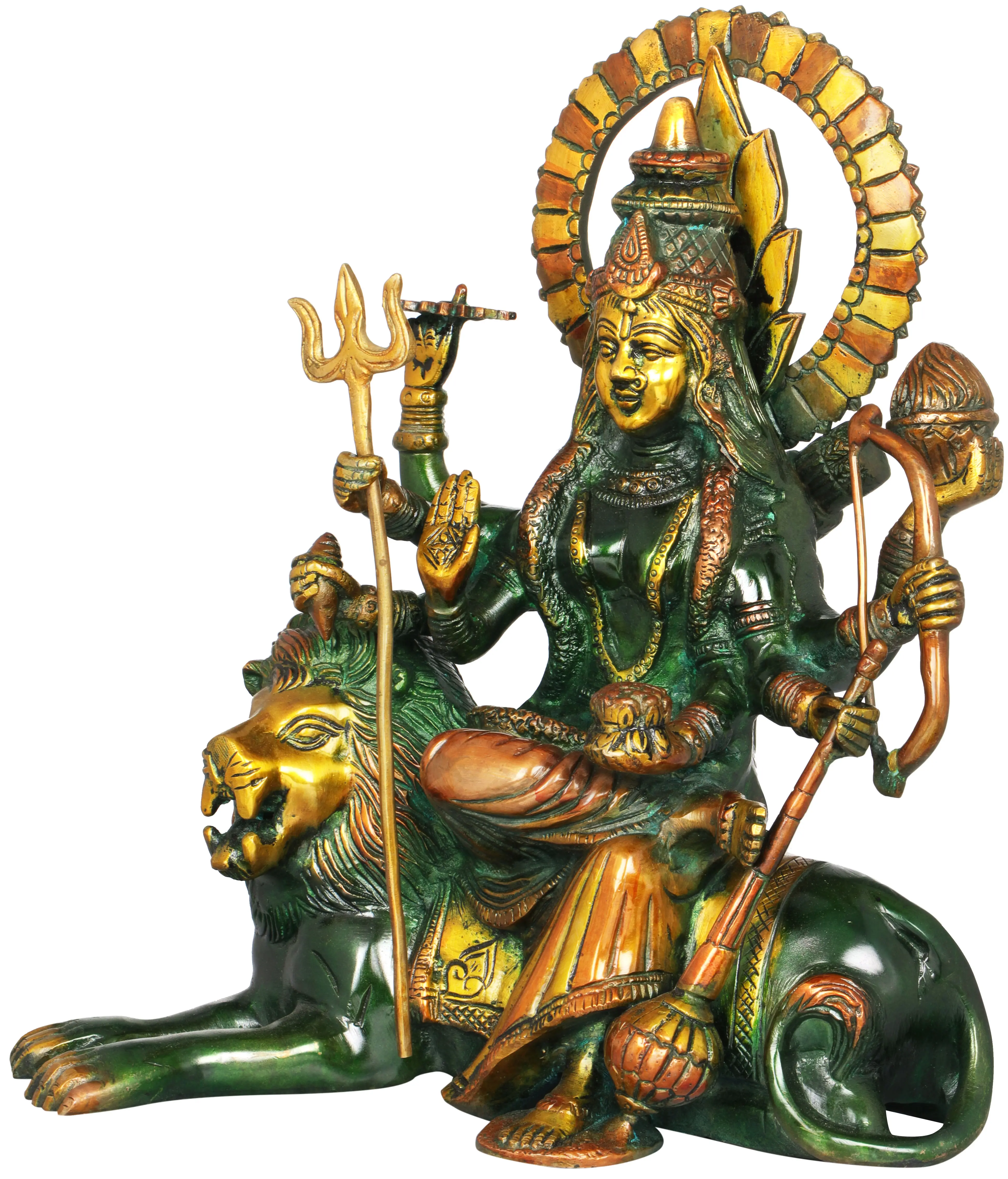 This magnificent brass statue captures the awe-inspiring presence of Goddess Durga, the slayer of demons and protector of the universe. Crafted with intricate detail and profound artistry in India, this 12-inch representation showcases the divine mother in her formidable Ashtabhuja (eight-armed) form, seated regally upon her powerful leonine vahana (vehicle). The choice of brass, a metal revered in Hindu traditions for its purity and durability, lends a timeless and sacred aura to this exquisite piece. The goddess is depicted with her characteristic eight arms, each holding a symbolic weapon or gesture, signifying her multifaceted powers and her readiness to combat any malevolent force. Her serene yet fierce expression conveys both maternal compassion and unwavering strength. The vibrant patination, with shades of deep green and warm bronze, highlights the sculptural details, from the delicate folds of her garments to the majestic mane of the lion. This traditional crafting technique not only enhances the visual appeal but also imbues the statue with a sense of antiquity and authentic spiritual significance.