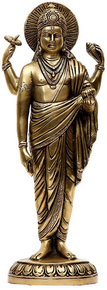 Young and strong built Dhanvatari stands on a pedestal with broad chest and shoulders. Standing straight and clad in a silk dhoti down to his ankles and a shawl worn over a shoulder and brought forward on the same elbow, he appears a gentleman.