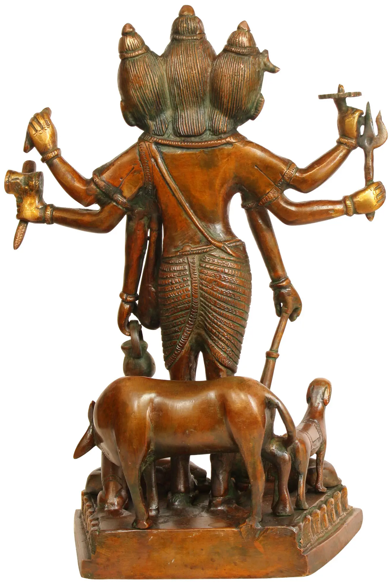 The brass statue of Bhagawan Dattatreya is not only an embodiment of the Trimurti but also symbolically represents the sacred texts of Hinduism and the nurturing force of nature. The four dogs surrounding him are symbolic of the four Vedas, the primary texts of Hindu philosophy and spirituality, signifying the knowledge he encompasses. The cow accompanying Dattatreya represents Mother Earth, embodying nourishment and abundance, which sustains all living beings. This statue is a celebration of cosmic knowledge and the providence of nature, central themes in the veneration of Dattatreya.