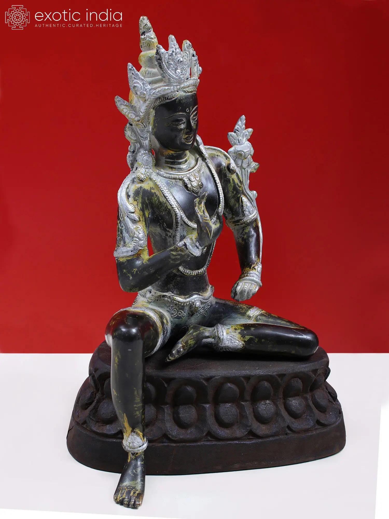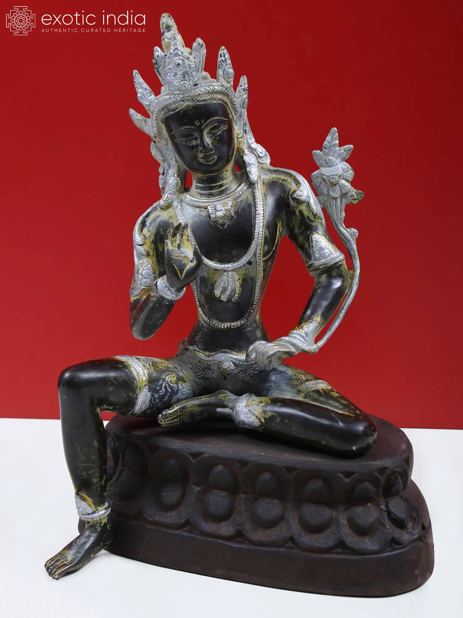 This exquisite brass sculpture captures a moment of profound peace and enlightened wisdom. The figure of the Buddha, rendered in rich, dark brass with accents of aged patina, is seated in a relaxed yet poised posture. The intricate details of the ornamentation, from the delicate chain necklace to the ornate bracelets and anklets, speak of a regal presence, befitting a crowned Buddha. His serene countenance, with downcast eyes and a gentle smile, invites contemplation and a sense of inner calm. The elaborate crown adorning his head signifies his exalted status, often representing his ultimate awakening and mastery over the cycles of existence.