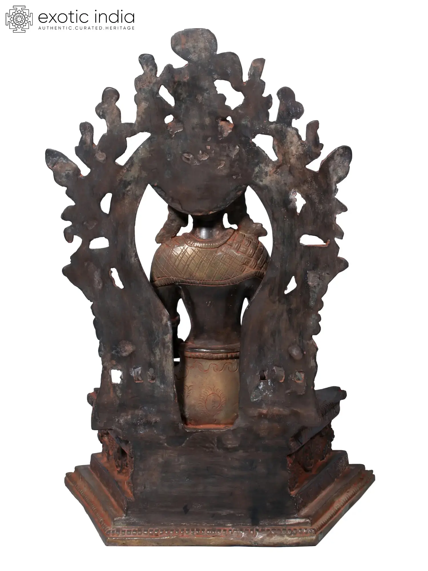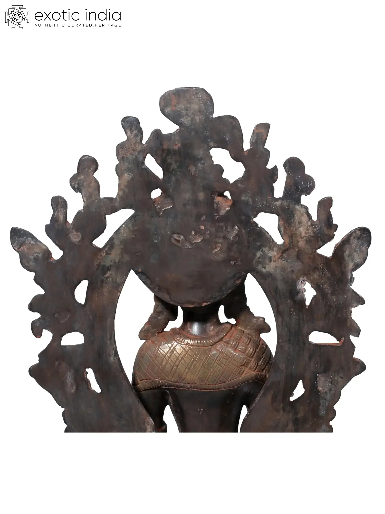 The pure brass murti that you see on this page captures the post-enlightenment aspect of the Buddha. It features a multitude of colours, burnt brown and baked orange and pale metallic green, and creates a visual mood that could be described as grand and ethereal. Note the strip of silk cascading down the front of the Buddha’s throne. Interestingly, the mendicant days of Buddha have been accommodated into the composition, in the form of the almsbowl cardled in His hands.