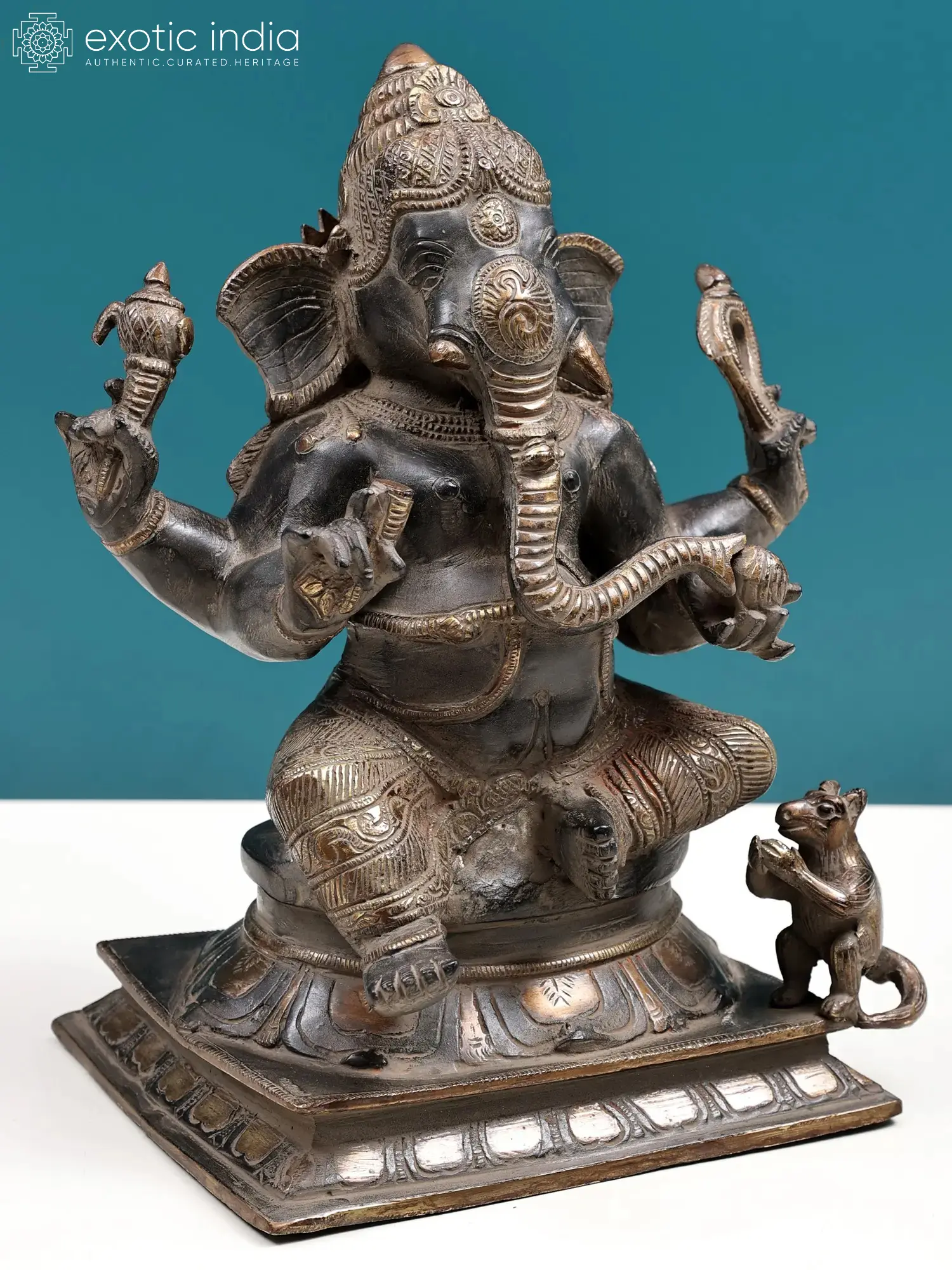 This magnificent Ganesha idol is accompanied by his loyal vahana, the mouse, depicted affectionately at his feet. The mouse, known as Mooshika, symbolizes desire and the ability to overcome it, representing Ganesha's control over the senses and his ability to navigate the complexities of the material world. According to Hindu mythology, Ganesha once used his broken tusk to capture a monstrous rat that disturbed the heavens, thereby taming it and making it his mount. This tale highlights Ganesha's strength and his compassionate nature, even towards creatures that cause chaos. The presence of Mooshika further enriches the narrative embodied by the idol, reminding viewers of Ganesha's multifaceted divine persona. In each of his four hands, Ganesha holds various attributes, each laden with meaning. While specific attributes can vary in depictions, commonly they include a noose (pasha) to capture imperfections, an axe (parashu) to cut through attachments and ignorance, and a modaka (a sweet dumpling) representing the sweetness of self-realization. His raised hand often bestows blessings (abhaya mudra), offering protection and assurance to his followers. This particular idol, with its commanding presence, invites contemplation on these profound symbols and their relevance in our lives. ––––––––––––––––––––