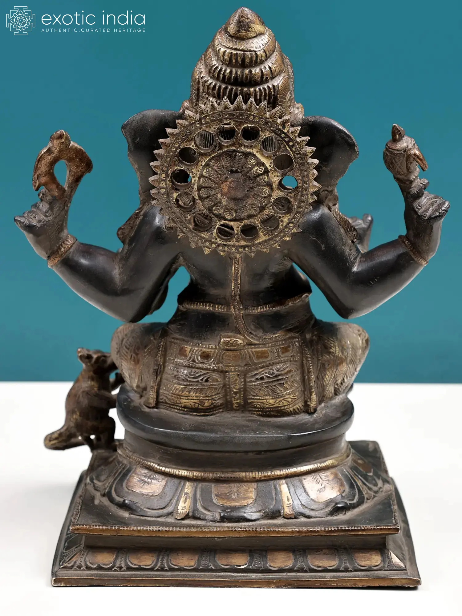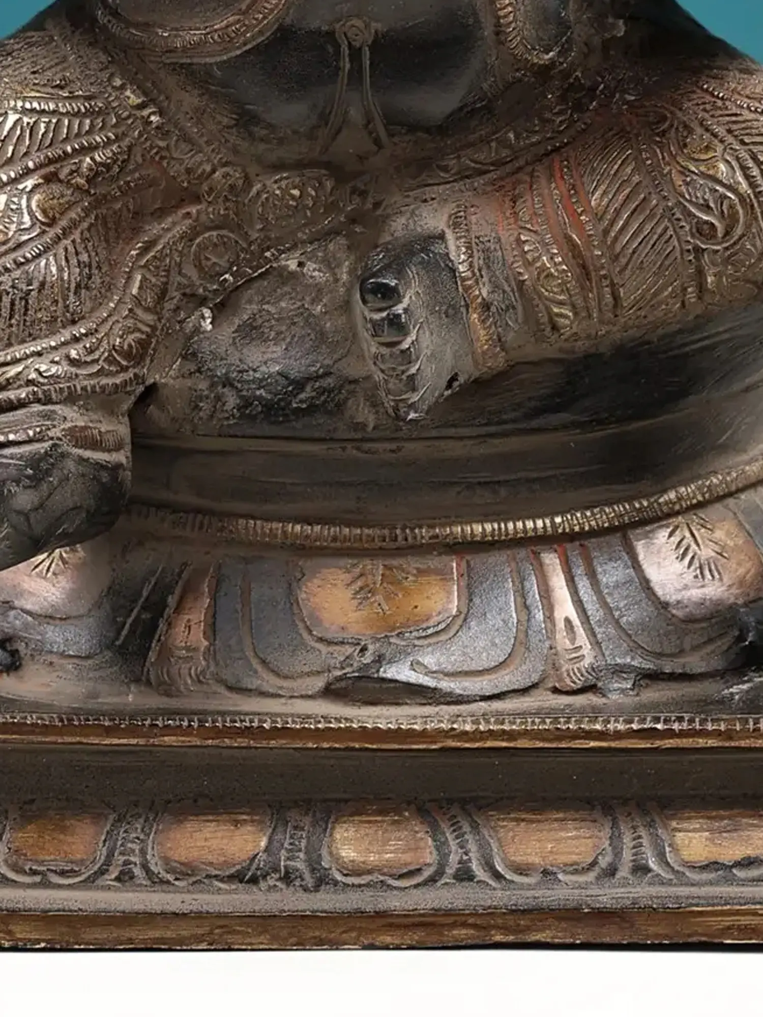 This exquisite brass idol depicts Lord Ganesha, the beloved elephant-headed deity revered as the remover of obstacles, the patron of arts and sciences, and the deva of intellect and wisdom. Crafted with remarkable detail and imbued with spiritual significance, this handmade sculpture is a testament to traditional Indian artistry and devotion. Lord Ganesha's portly form, large ears, and distinctive trunk are rendered with a grace and power that captures the essence of this revered god. His serene expression conveys a sense of profound wisdom and benevolent watchfulness. The rich patina of the brass, achieved through meticulous craftsmanship, adds a timeless quality to the idol. Every curve and contour is brought to life, from the intricately adorned headdress and the flowing dhoti to the powerful arms that hold symbolic objects. The artist's skilled hands have brought forth a divine presence, making this idol not just a decorative piece but a conduit for spiritual connection. The seated posture of Ganesha, often depicted in a relaxed yet commanding stance, suggests his readiness to bless and guide his devotees. ––––––––––––––––––––