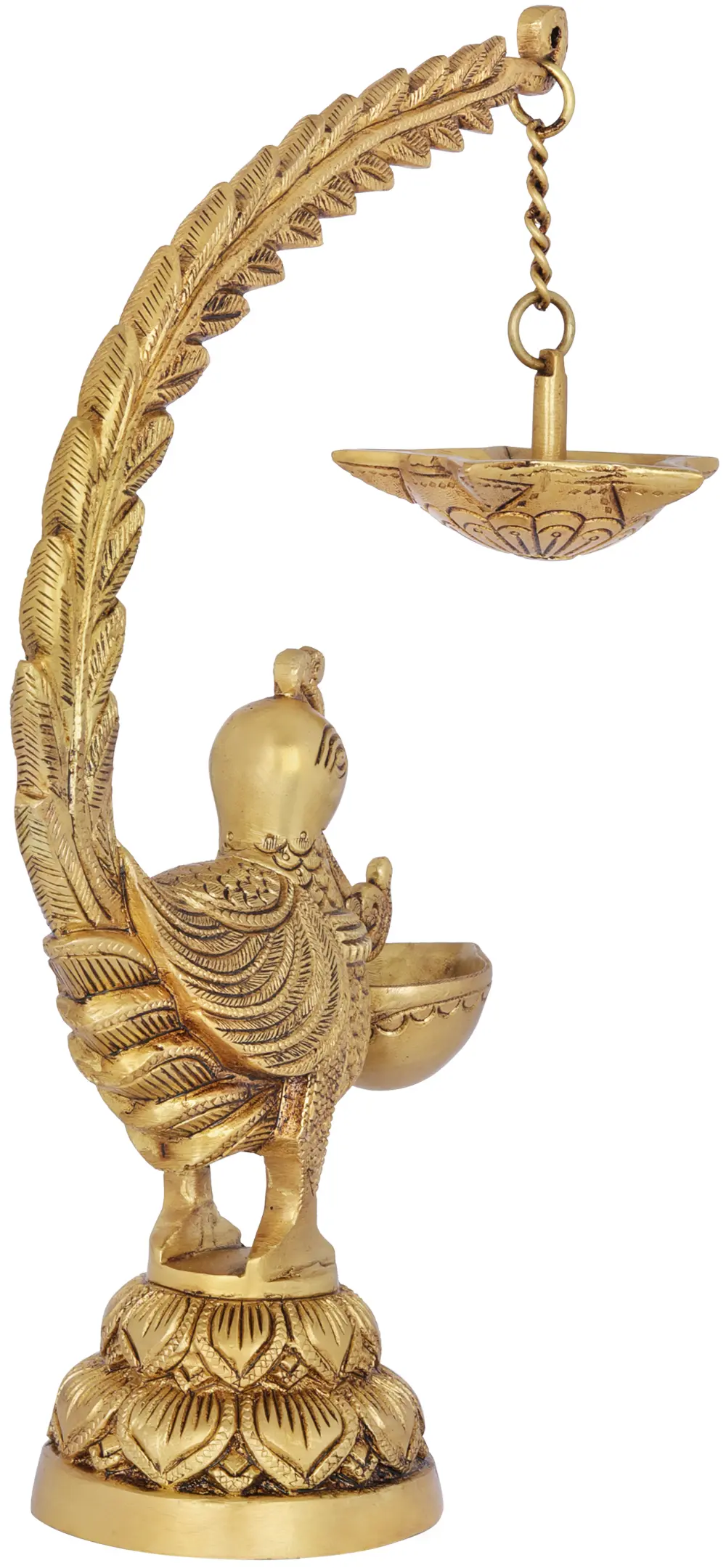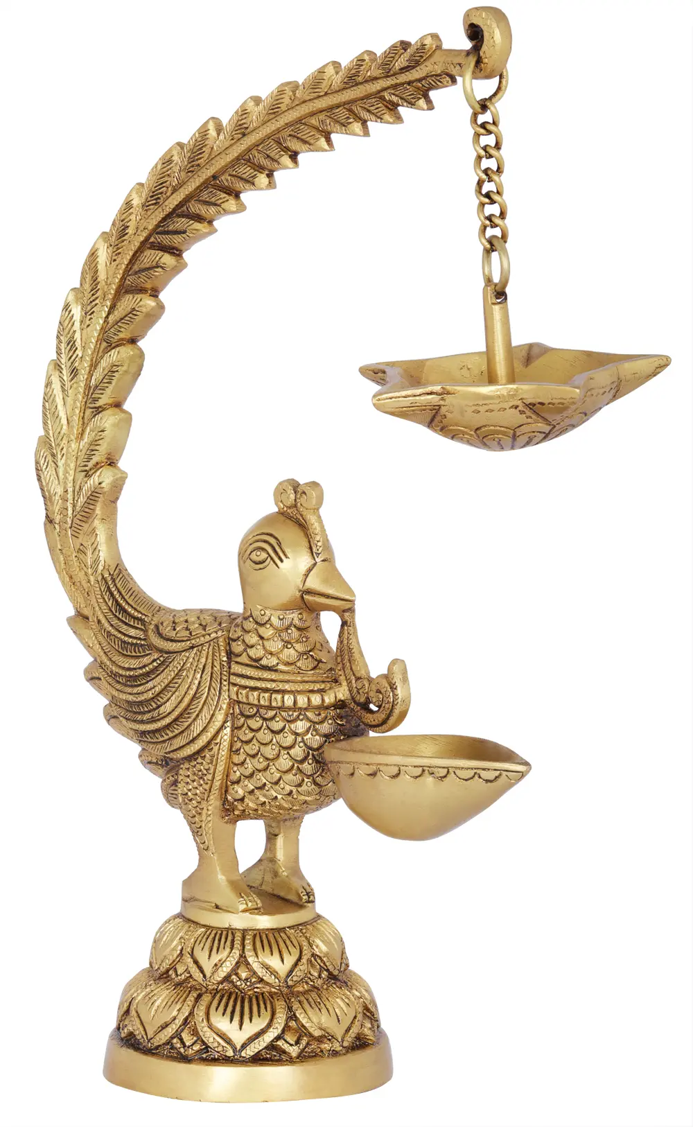 Elevate your ambiance with the grandeur of Handmade Peacock Wick Lamp with Five Wicks, gracefully hanging from the peacock's resplendent tail in Brass. This exquisite masterpiece is meticulously crafted in India, a testament to the fusion of artistry and tradition. The peacock, symbolizing grace and spirituality, lends its beauty to this lamp. With its five wicks, it casts a warm, heartfelt glow that illuminates your space with sincerity and elegance. As you embrace this exquisite creation, you welcome a touch of India's rich heritage, illuminating your life with both grandeur and spiritual grace.
