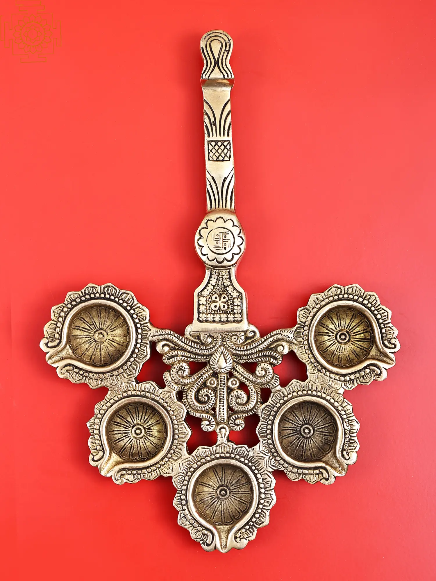 6" Brass Aarti Diya | Hand-Held Lamp Inspired by Hoysala-Style
