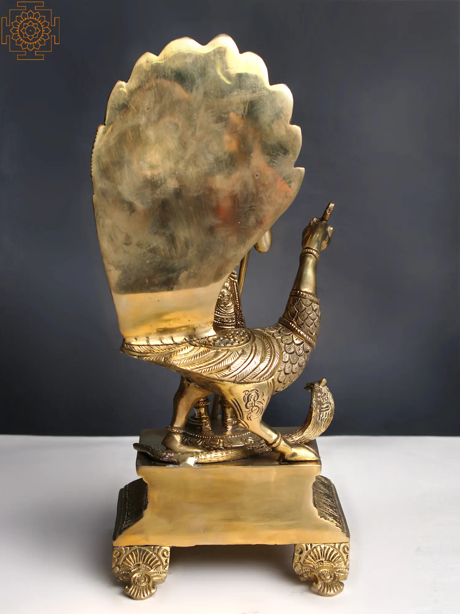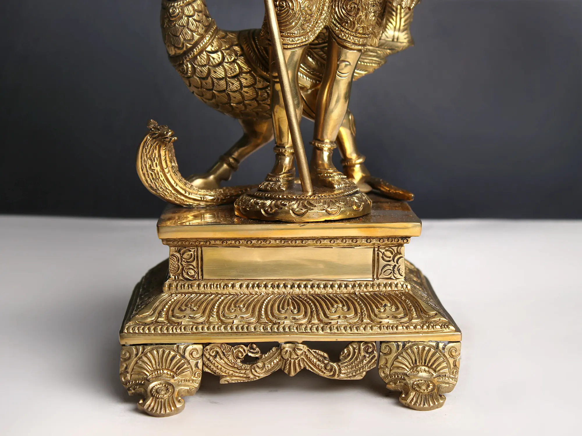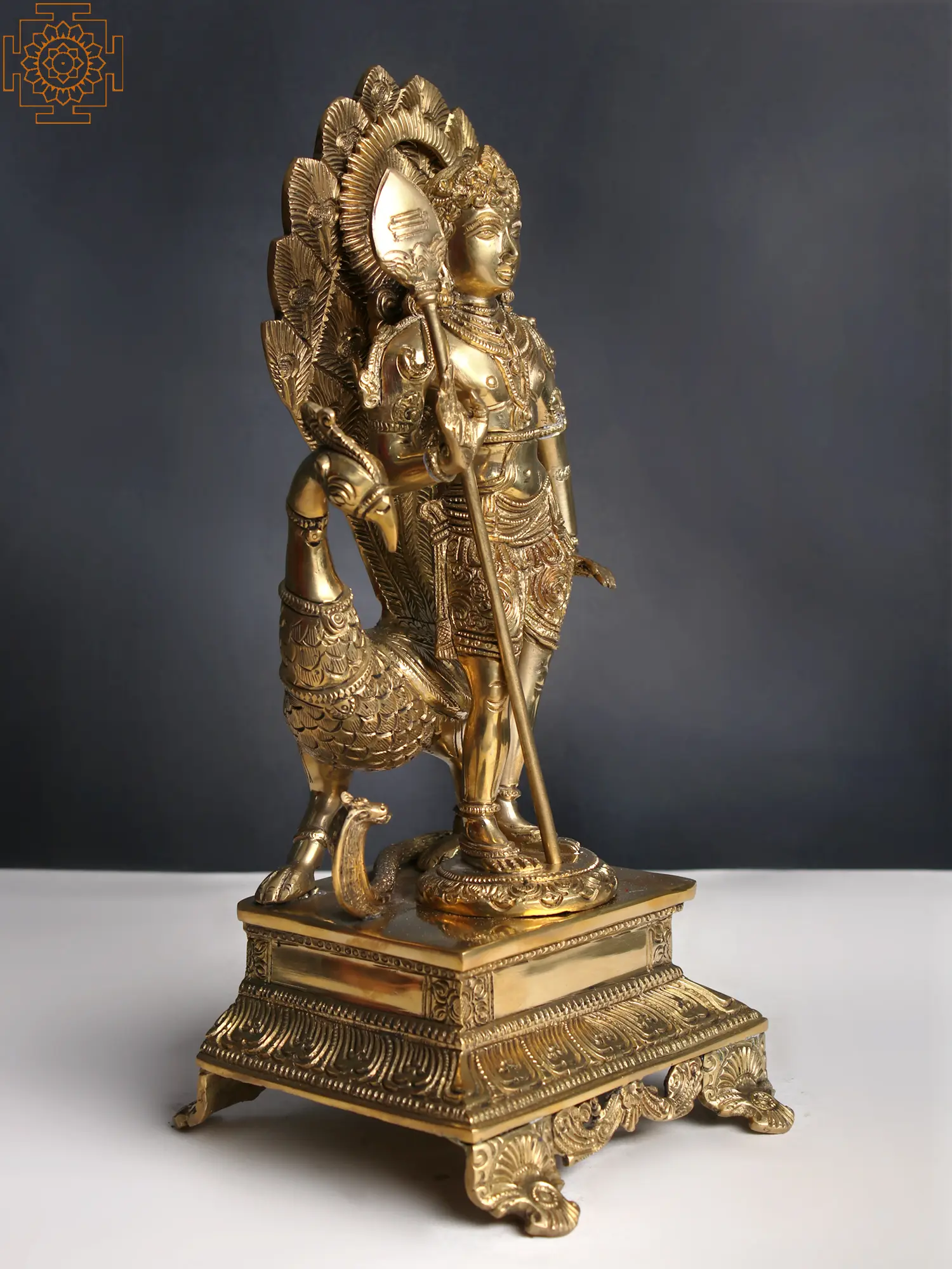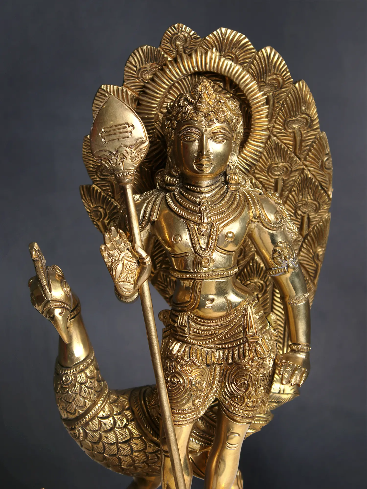 Behind the standing Karttikeya is His vahana, the peacock, in a dynamic, walking stance. At the end of its long neck, is the head turned frontally. Its ornate plumage - sculpted and engraved in great detail by the artisan - rises above the head of Karttikeya and forms a kind of an aureole. At the talons of the peacock is a snake, whose presence is symbolic of Karttikeya’s father, Shiva.