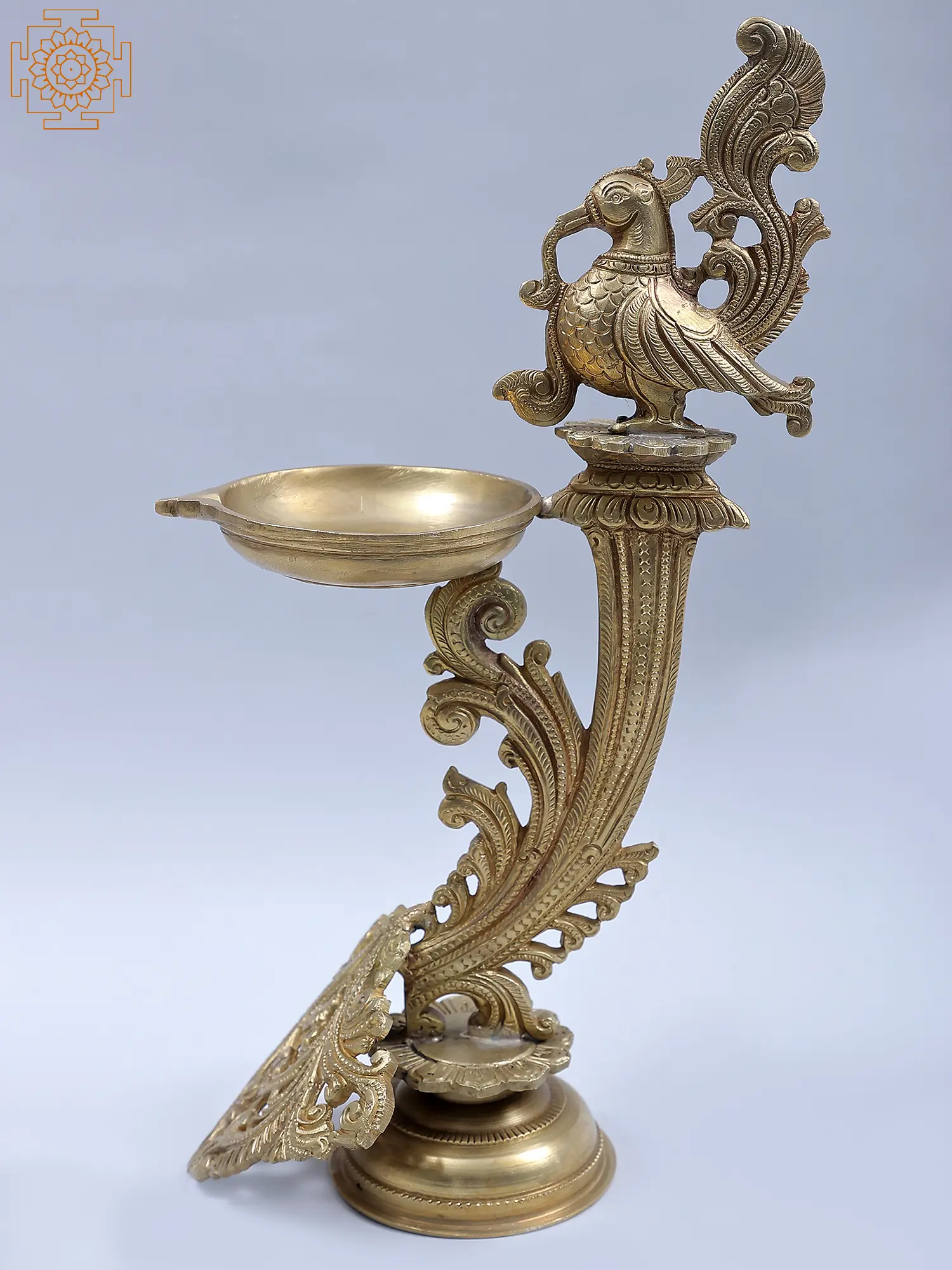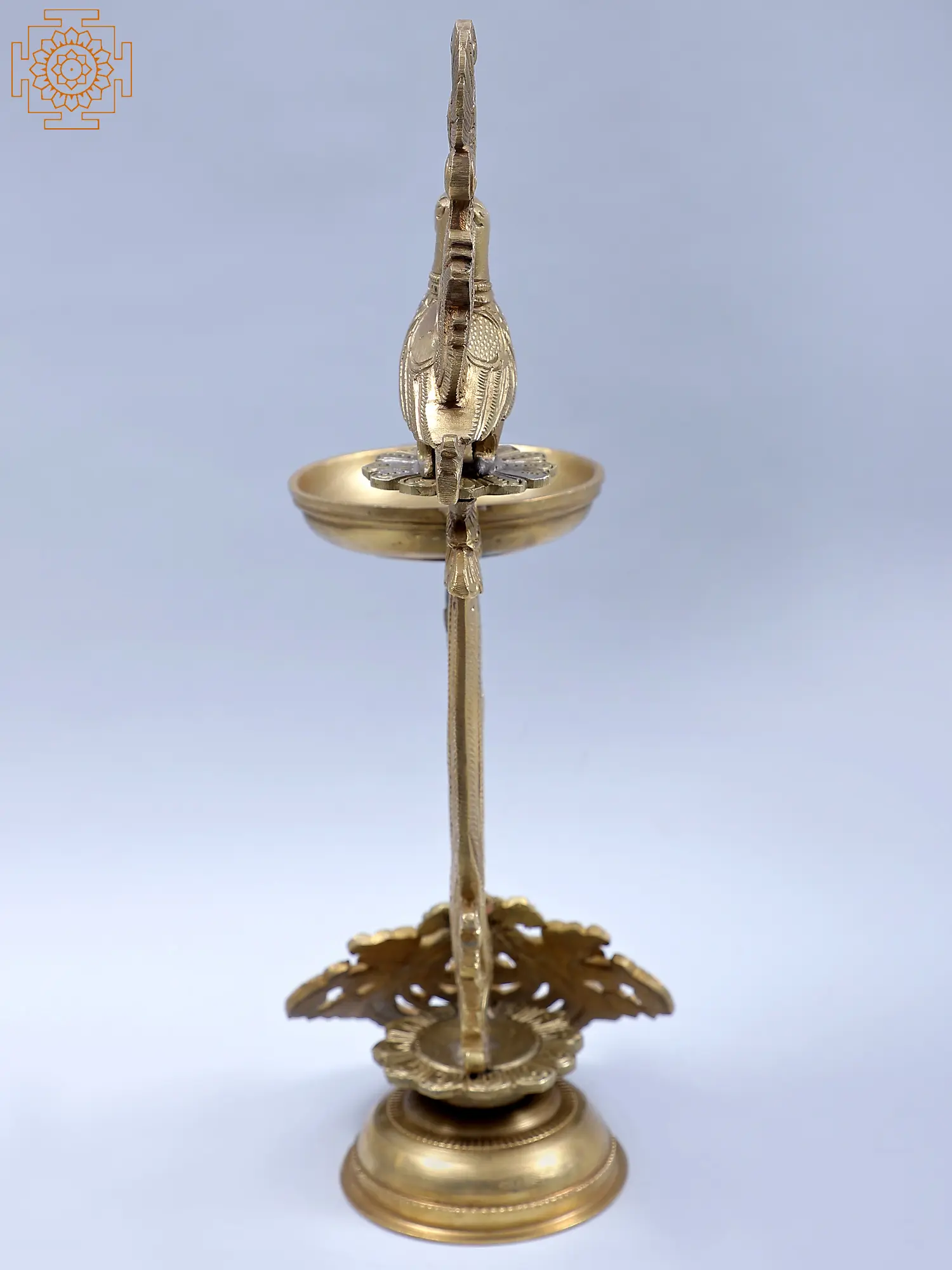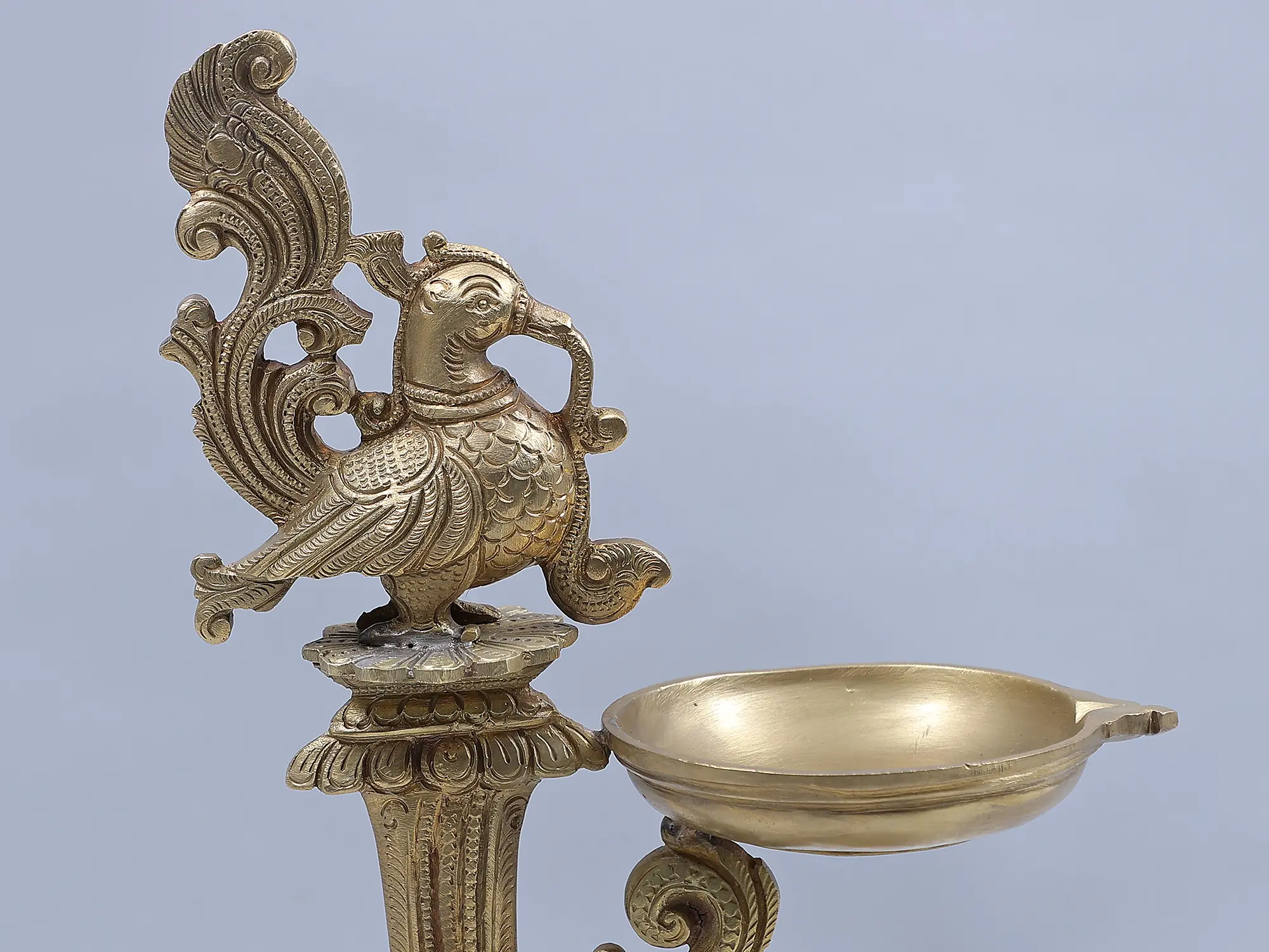 Birds are given significant prominence in Hoysala Style art. Peacocks, swans, and parrots are all symbols of wisdom, prosperity, and fertility, and have been brilliantly represented. The top of this bronze lamp features an appealing peacock pattern. A single-wick light is perched on a pedestal shape. The artist came up with the inventive notion of presenting the stand as an ornate peacock tail. The bottom stand is covered in vines. From a distance, the light appears to be made of a bundle of vines. Having all symbols of growth and fertility this lamp can be considered an auspicious piece of art. Because lamps are associated with wisdom, and the peacock is a sign of affluence, this lamp is an ideal ritual object for bringing these two traits into a location.