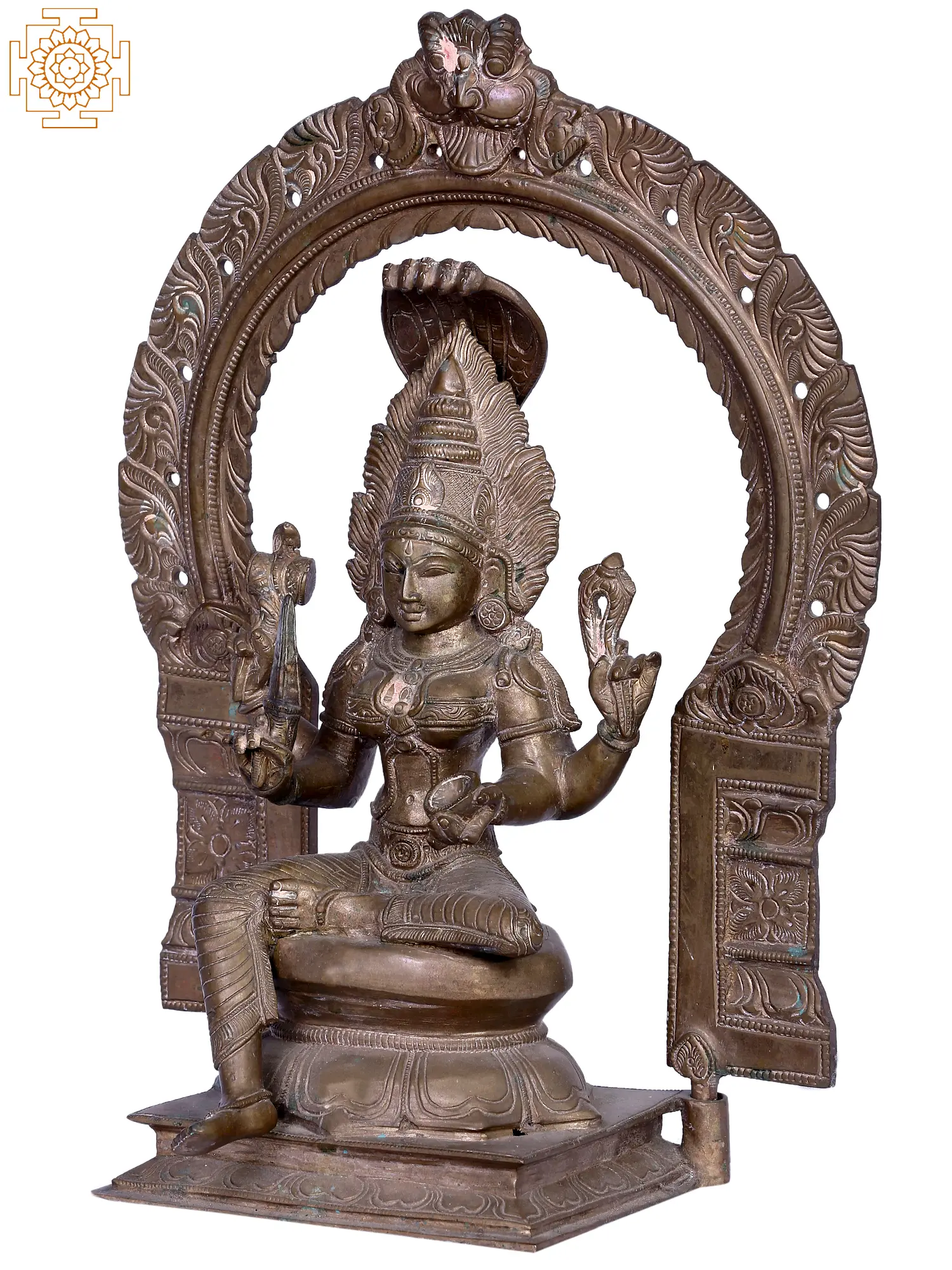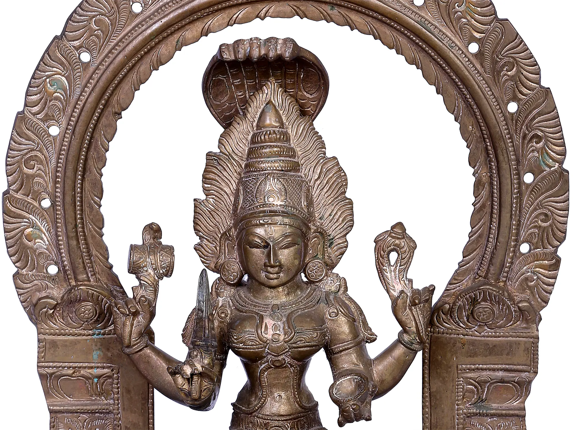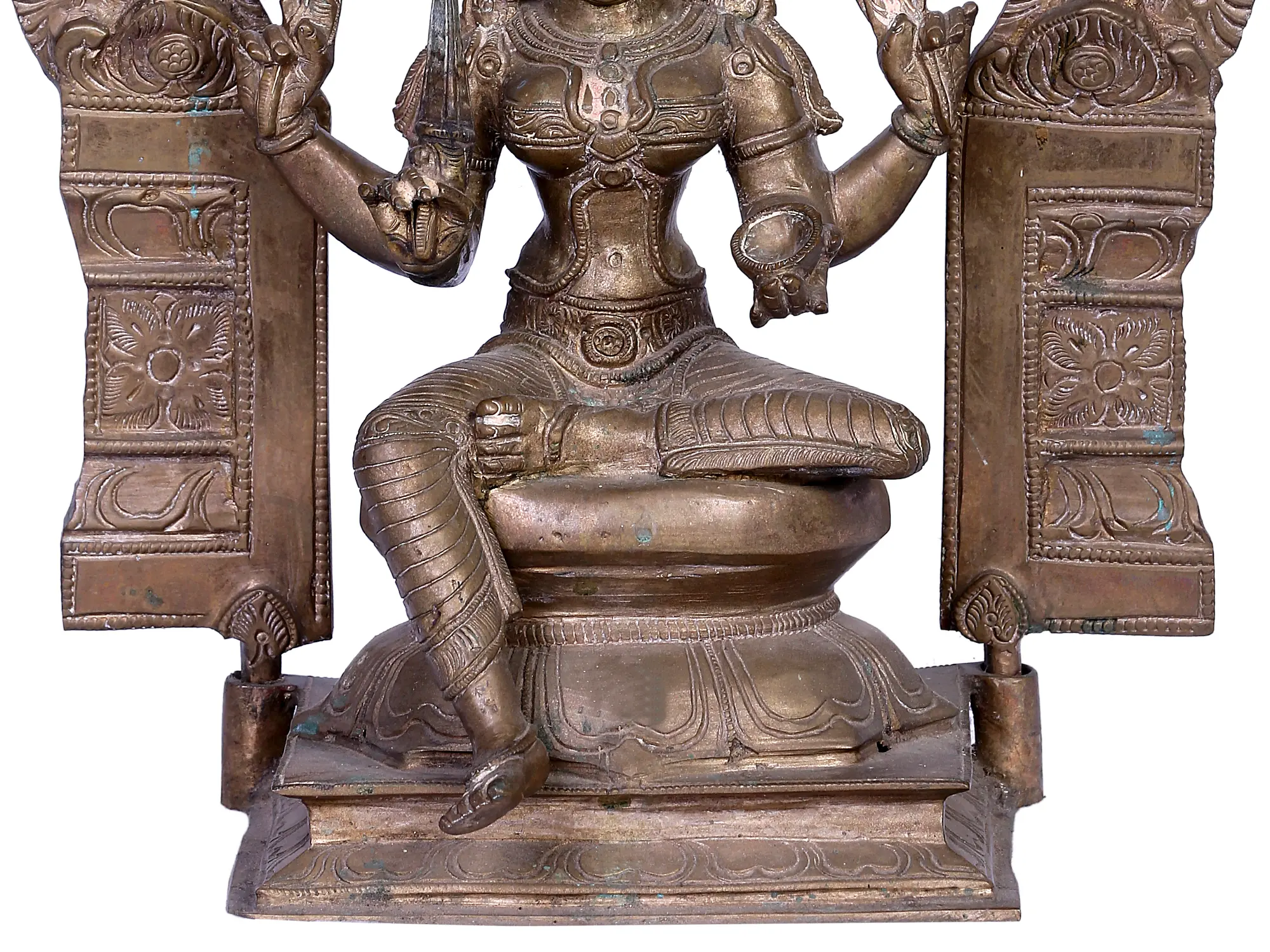 Goddess Mariamman, “the goddess who cures diseases” and the powerful manifestation of “Goddess Durga”, in the resplendent embrace of Kirtimukha (The Face of Glory), emanates divine grace. Seated in Lalitasana posture, Mariamman personifies beauty and strength. Her delicate form belies the might encapsulated in her myriad arms. A celestial dance unfolds as she wields a Damaru encircled by a coiled Cobra, a testament to creation and destruction. A sword, cup of vermilion, and noose symbolize protection, vitality, and cosmic order. Cloaked in regal attire, she captivates with an ethereal glow. The five-headed serpent, a celestial umbrella, reinforces her cosmic supremacy. Crafted using the ancient “Madhuchista Vidhana (Lost-Wax) technique”, this “Panchaloha Bronze” masterpiece signifies the harmonious balance between creation and destruction, encapsulating the cyclical nature of existence.