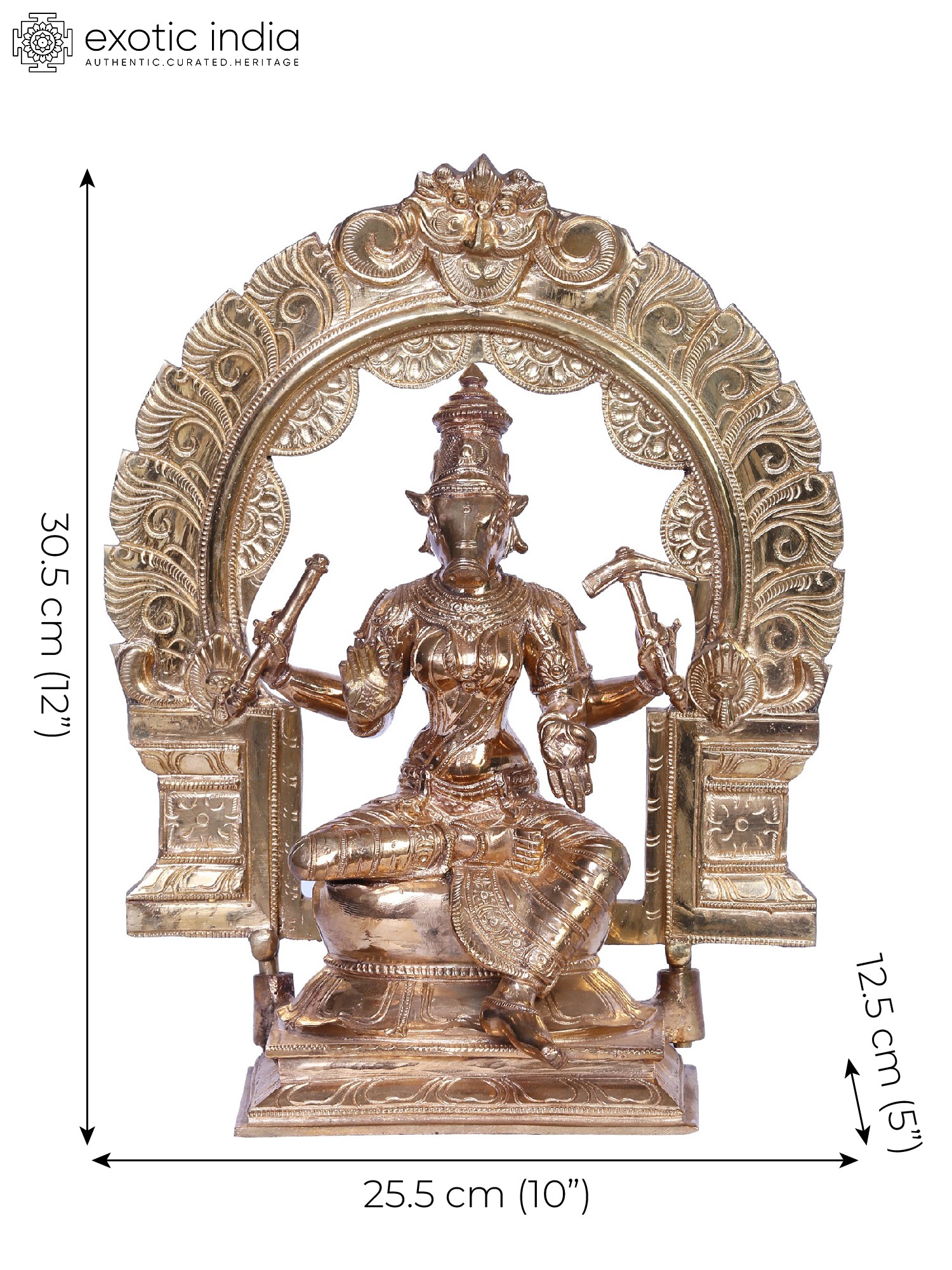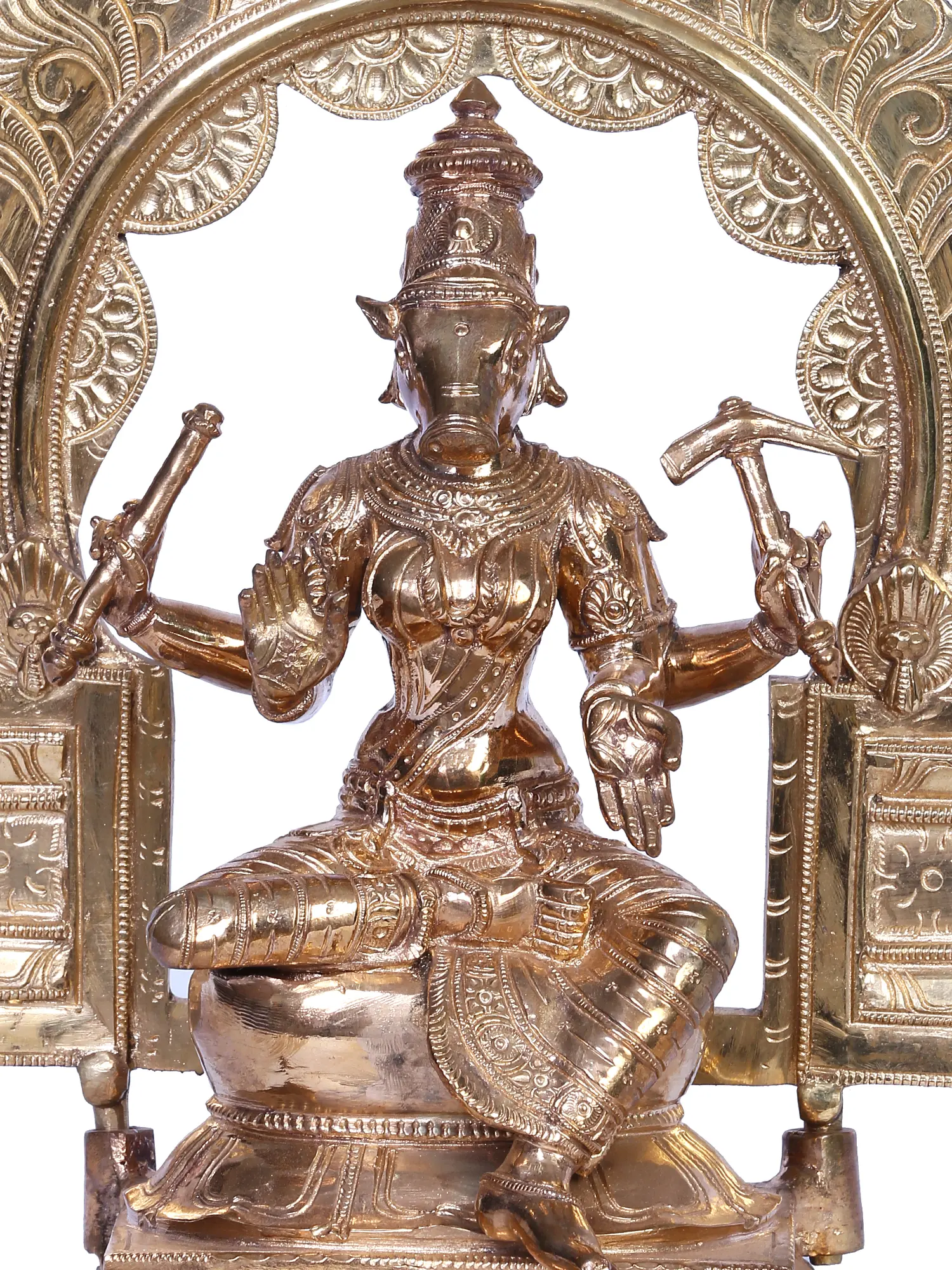 Varahi- the she-boar-faced goddess, is an awe-inspiring and powerful Matrika (mother-goddess), revered in Hinduism as the Shakti of Vishnu’s Varaha Roopa and one of the Saptamatrikas (seven mother goddesses) who assist goddess Durga in her battles against Asuras. In this majestic bronze statue from Swamimalai, the goddess Varahi radiates the aura of Sri, the consort of Vishnu. Glistening divinely, Devi Varahi is wrapped in a lovely saree, wearing a Vaishnava crown known as Kirtiamukuta, bejeweled necklaces, and armlets, and sits in the regal Lalitasana.