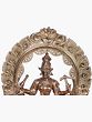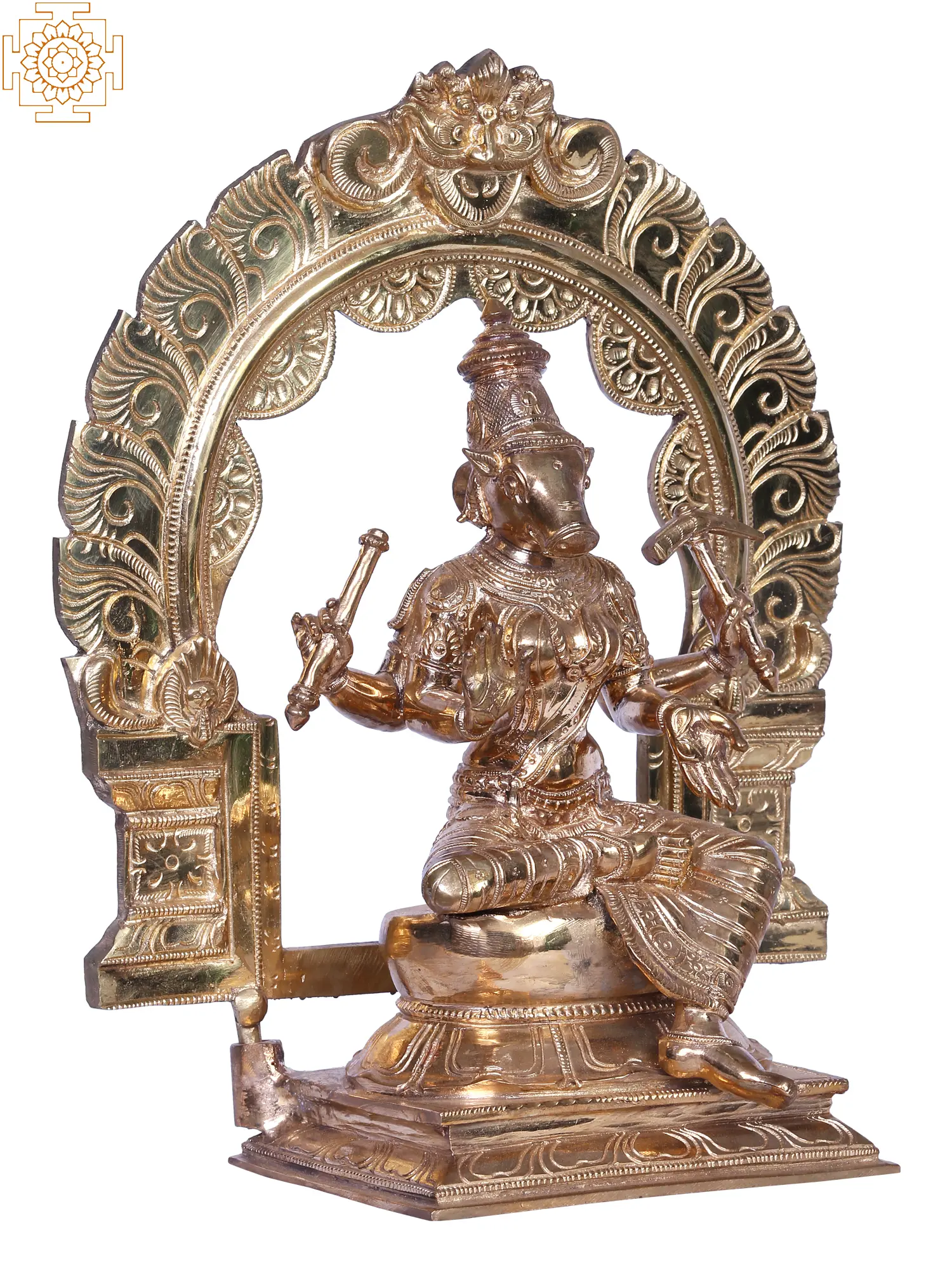 A small bindi adorns her forehead, beautifying the alluring countenance of the goddess. In her four hands, Devi Varahi holds Hala (plough) and Musala (mortar) which are her weapons, while her primary hands are in the gesture of Varada and Abhaya, mirroring the graceful mudras of goddess Lakshmi. To mark the aura of the mighty mother goddess, a grand aureole with Kirtimukha or a face of glory on top has been added to the murti.